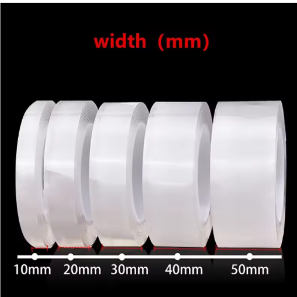 1/3/5M Double-Sided Nano Tape | Transparent Traceless Waterproof Reusable Adhesive Gel Tape Product Description: Upgrade your home, kitchen, and workspace with this high-quality Double-Sided Nano Tape , designed for strong adhesion without damaging surfaces. Made from Nano PU Gel , this tape is transparent, waterproof, washable, and reusable , offering a long-lasting and versatile solution for everyday needs. Ideal for kitchens, bathrooms, walls, carpets, desks, and more — this traceless nano tape keeps your items firmly in place and removes cleanly without leaving residue. Perfect for hanging small items, fixing objects, or organizing spaces. Key Features: • Strong Double-Sided Adhesive Built with powerful nano gel that grips securely on most surfaces including glass, metal, tile, wood, and plastic. • Washable & Reusable Simply rinse with water, let it dry, and reuse it up to 600+ times . • Traceless Removal Removes cleanly without damaging walls or surfaces — no sticky residue or peeling paint. • Waterproof Performance Perfect for kitchens and bathrooms where moisture is common. • Multi-Functional Use Great for carpets, kitchen tools, bathroom accessories, small decorations, car interiors, and more. • High Transparency & Flexibility Clear design blends with any décor and stretches without breaking easily. • No Tools Needed Can replace nails, screws, and rivets for simple mechanical fixing. Product Specifications: Item Name: Transparent Nano Tape Material: Nano PU Gel Tape Type: Double-Sided Filament Tape Features: Washable, Reusable, Removable, Traceless, Universal Lengths Available: 1m 3m 5m Width: 3 cm Thickness: 0.1 cm Model Number: A1TAW3005 Origin: Mainland China Package Includes: 1 × Double-Sided Traceless Nano Tape Notes: Slight size or color variations may occur due to monitor settings or manual measurement. Make sure surface is clean and dry for best adhesion.
