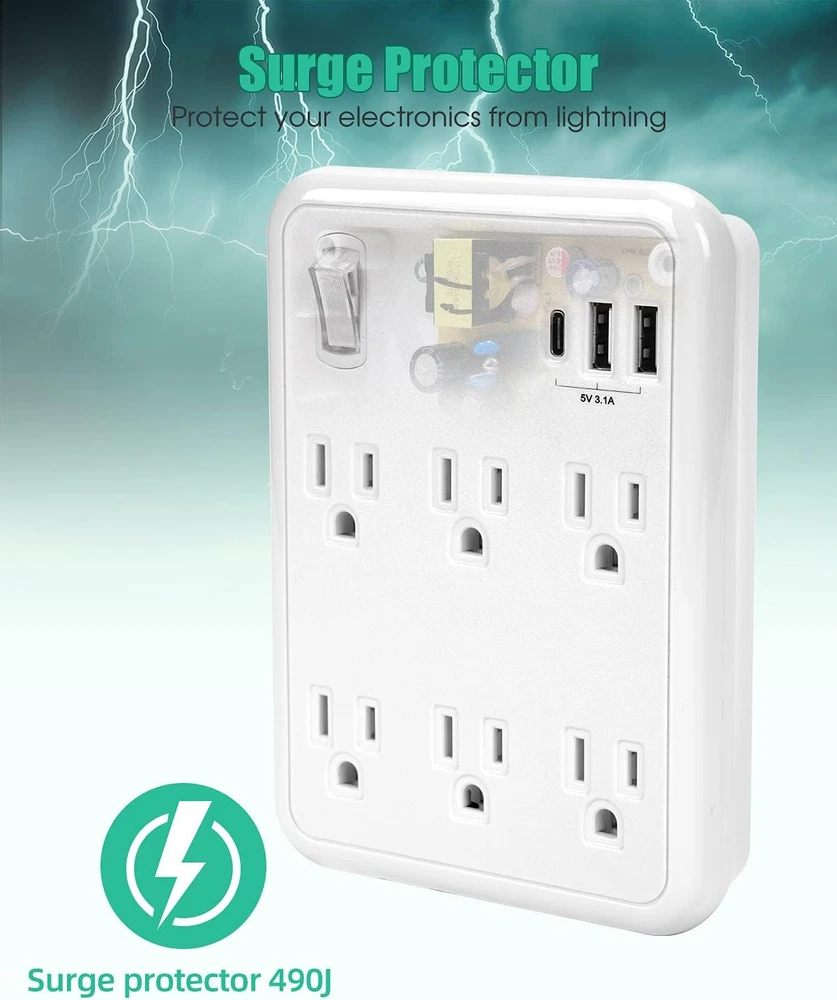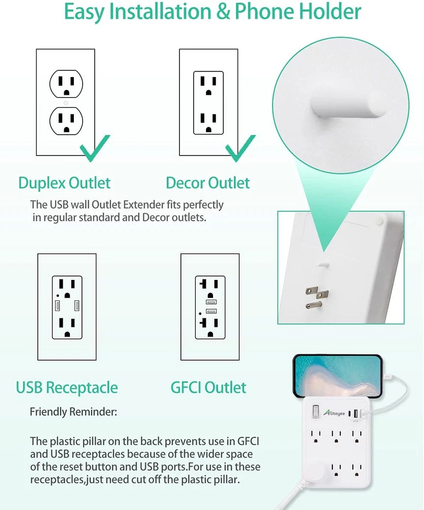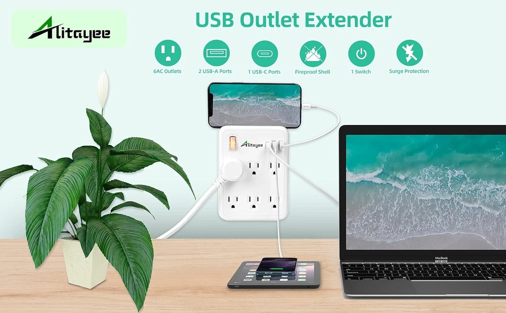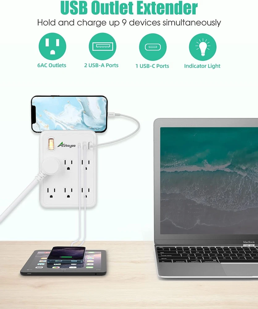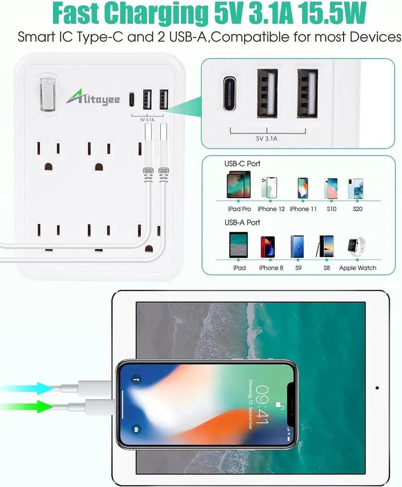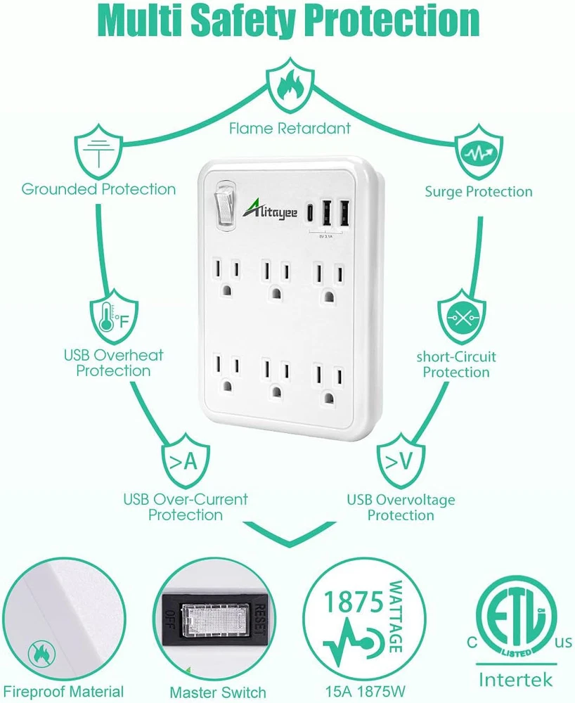 Store New Arrivals Add to Favorite View Feedback Contact Alitayee Surge Protector Wall Outlet Extender, USB Wall Charger with 3 USB Charging Ports(Type-C and 2 USB-A Smart 3.1A Total), 6-Outlet Extender and Top Phone Holder for Cell Phone, White, ETL Listed Description Item Shape Flat Amperage 15 Amps Total Usb Ports 3 Maximum Current 15 Amps Brand Name Alitayee Surge Protection Rating 490 Joules Color white Brand Alitayee Material Plastic Item Dimensions L x W 5.9"L x 4.3"W Compatible Devices cell phone Plug Type Type B Item Weight 8.5 Ounces Number of Ports 6 Voltage 125 Volts Recommended Uses For Product HOME,OFFICE Special Features On And Off Switch, Surge Protection, Usb PORTS Power Plug Type B - 3 pin (North American) Special Feature On And Off Switch, Surge Protection, Usb PORTS Number of Outlets 6 Total Power Outlets 6 Smart USB Charging Ports Powerstrip: 5V 3.1A shared rating, high-speed USB ports automatically detect charging devices and deliver optimal charging speed, usb-a up to 2.4A per port, usb-c up to 3.1A. NOTE:The Type-C port doesn't support Macbook, Macbook Air, Macbook Pro or any other laptops which needs 14-22V charging voltage Multiplug USB Power strips: 3 smart USB charging ports (1 USB C ) and 6AC outlet Plugs with Mater switch and built-in surge protector . AC 100-240V normal working voltage range. surge protector power strip support 9 electric devices simultaneously, like cell phones, iPad, laptops, lamp,cameras and many other devices Fast Installation & Phone Holder Design: Just plug in for duplex outlet and decor outlet. The plastic prong at the bottom is for reinforcement purpose . For USB receptacle and GFCI outlet, the plastic prong needs to be cut off before using. Also, your cell phone could be put on the top phone holder conveniently when charging Surge protection & Superior Safety-This wall plug expander power strip surge protector wiith usb features 490 Joules surge protection rating to keep your electronics and mobile devices protected from voltage spikes. The Built-in safeguards full protect against over-current, over-charging and over-heating for safe with fast charging Reliable Safety Wall Outlet Extender- This electrical outlet usb wall plug power strip is ETL listed and certified by FCC and RoHS ,and made of Fire-resistant PC shell . Built-in short-circuit, over-voltage and over-current protection can ensure the safety.Our friendly and reliable staff will respond to you within 24 hours. You can purchase with confidence, with our 30-day return and 18-month replacement Product Description Why Alitayee USB C Outlet Extender? Alitayee is a manufacturer of Power Strip and Outlet Extender with professional technology and 20 years of experience in power strip production. We believe the true innovation is all about creating, renewing and improving more effective products that make life better, To assure customers of reliable and the highest products possible from beginning to end, We are dedicated to lifting our quality standards without limits. 9-IN-One USB Wall Plug Extender 3 smart USB charging ports (1 USB C ) and 6AC outlet Plugs with Mater switch and built-in surge protector . AC 100-240V normal working voltage range. surge protector power strip support 6 electric devices simultaneously, like cell phones, iPad, laptops, lamp,cameras and many other devices · 6 Widely-spaced Outlets with Type-C Fast Charging USB Ports · Multi Protection: Surge protector with overload protection protects against spikes and fluctuations. · 3 smart USB charging: With an intelligent circuit design that detects and accommodates the power needs of your device.USB-C: Max 3.1A 15.5W,USB-A:MAX 2.4A,Total:5V 3.1A(Smart IC) · Mini Size & Phone holder Alitayee USB Outlet Extender 6 AC Outlets with Master Switch 125V,15A, 1875W USB(1Type C+2USB-A) Total:5V 3.1A(Smart IC) 110~250V input Surge Protection:490Joules 5.9*4.3*1.4 in 8.5 oz Fast Charging 15.5W 5V 3.1A shared rating, high-speed USB ports automatically detect charging devices and deliver optimal charging speed, usb-a up to 2.4A per port, usb-c up to 3.1A. NOTE:The Type-C port doesn't support Macbook, Macbook Air, Macbook Pro or any other laptops which needs 14~22V charging voltage Surge protection With a built-in 490J surge protector, our outlet extender power strip with usb ports will filter the minor surges in the circuit and shut it off when an overwhelming surge like that caused by lightning occurs. And the shell is made of Flame Retardant Material which is able to withstand temperature up to 1,380℉ (750℃). Easy Installation The USB wall Outlet Extender fits perfectly in regular standard and Decor outlets.Friendly Reminder:The plastic pillar on the back prevents use in GFCI and USB receptacles because of the wider space of the reset button and USB ports.For use in these receptacles,just need cut off the plastic pillar. Reliable Safety This electrical outlet wall plugs with usb ports is high quality , and made of Fire-resistant PC shell .Built-in short-circuit, over-voltage and over-current protection can ensure the safety. Phone holder The top holders keep smart phones in a convenient place while charging.No Desktop Space Occupation,Fit for Most Wall Socket. Compact Size and Compatible Compact Size and Worldwide Voltage-the USB Vertical Power Strip provide 6 AC Outlets and 3 Fast Charging USB Ports(1 Type-C and 2 Type-A,5V3.1A,15.5W),Compatible many devices and for travel,office,dorm ,home,and so on. ABOUT US We offer the best prices around on high quality products. Our E-store includes media such as books, movies, music and games while offering electronics, toys, sporting apparel, clothing, tools, general home, garden items and more. SHIPPING We are always working hard to ensure your package arrives as soon as possible. Please understand that some factors like weather, high postal traffic, and the performance of shipping companies are outside of our control. We offer free shipping to the lower 48 states and s