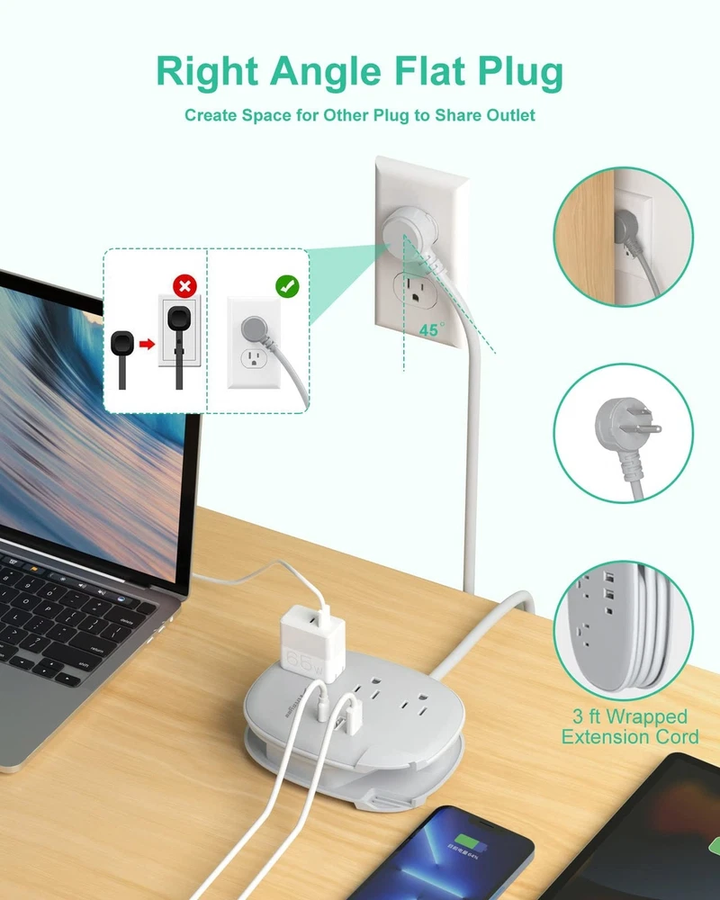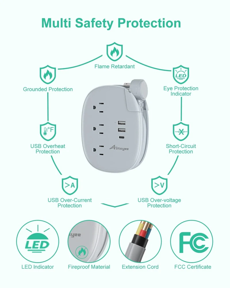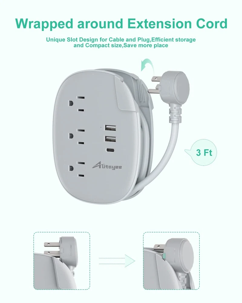 Description Features: 3 USB Charging StationUSB-C port provides 5V 3.0A 15W ,3 USB port total provides 5V 3.1A- 15.5W fast charging.With smart charging technology,the Type-C and 2 USB-A ports will identify your devices automatically and deliver the fastest and most suitable charging speed.Great for most of your electronic devices,nice travel essentials(NOTE:The Type-C port doesn't support Macbook,Macbook Air,Macbook Pro or any other laptops which needs 14-22V charging voltage) 6-IN-1 USB Travel Power Strip3 AC Outlets(10A/125V/1250W) USB power outlet with 3ft Heavy Duty extension cords could allow 3 standard USA plug to be used at the same time and 3 USB ports for Smart phones, iPad, cameras and many other devices.Better travel accessories Portable power strip with usb ports3ft retractable power cord which makes it easy to storage,Compact Size(5.3*4.1*1.5In) and lightweight design to fit into luggage and bag,No need to take additional USB phone charger while traveling. The extension outlet also can be used in any indoor place with socket, Perfect solution for dorm room, bedside, behind the sofa,kitchen,office etc, No Surge protector,friendly for Cruise Ship(For Disney,Carnival,please check with cruise company,for Royal Caribbean,isn't ok) USB Travel Power Strip with Wrapped Extension Cord3ft retractable extension cord with 45-degree right angled flat plug, get easy access to place that's hard to reach. The 3-prong grounded right angle flat plug keeps your other wall outlets free.better for on the desktop or nightstand Reliable Safety GuaranteedThis travel power strip with USB is certified by FCC , and made of Fire-resistant PC shell . Built-in short-circuit, over-voltage and over-current protection can ensure the safety.Our friendly and reliable customer service will respond to you within 24 hours. You can purchase with confidence, with our 30-day return and 18-month replacement Product Details: Brand: Alitayee Color: 01-Grey Total Power Outlets: 3 Voltage: 125 Volts Special Feature: Wrapped Around Extension Cord, 6 IN 1 travel power strip, USB C port, Travel essentials Product Dimensions: 5.3 x 4.1 x 1.5 inches Item Weight: 9 ounces Item model number: A-717-G Date First Available: April 19, 2022 Manufacturer: Alitayee Country of Origin: China Handling We will ship all orders within 3 business day of payment. Delivery We Do Not Ship Outside of the Continental US. Return Policy All items qualify for returns within 30 days of receipt. Buyer is responsible for return shipping on any item that is not damaged. Feedback We take our reputation seriously, we buy and sell online, so we understand the value of trust. If you are unsatisfied with your order, please contact us and we will work with you to resolve it to your satisfaction.