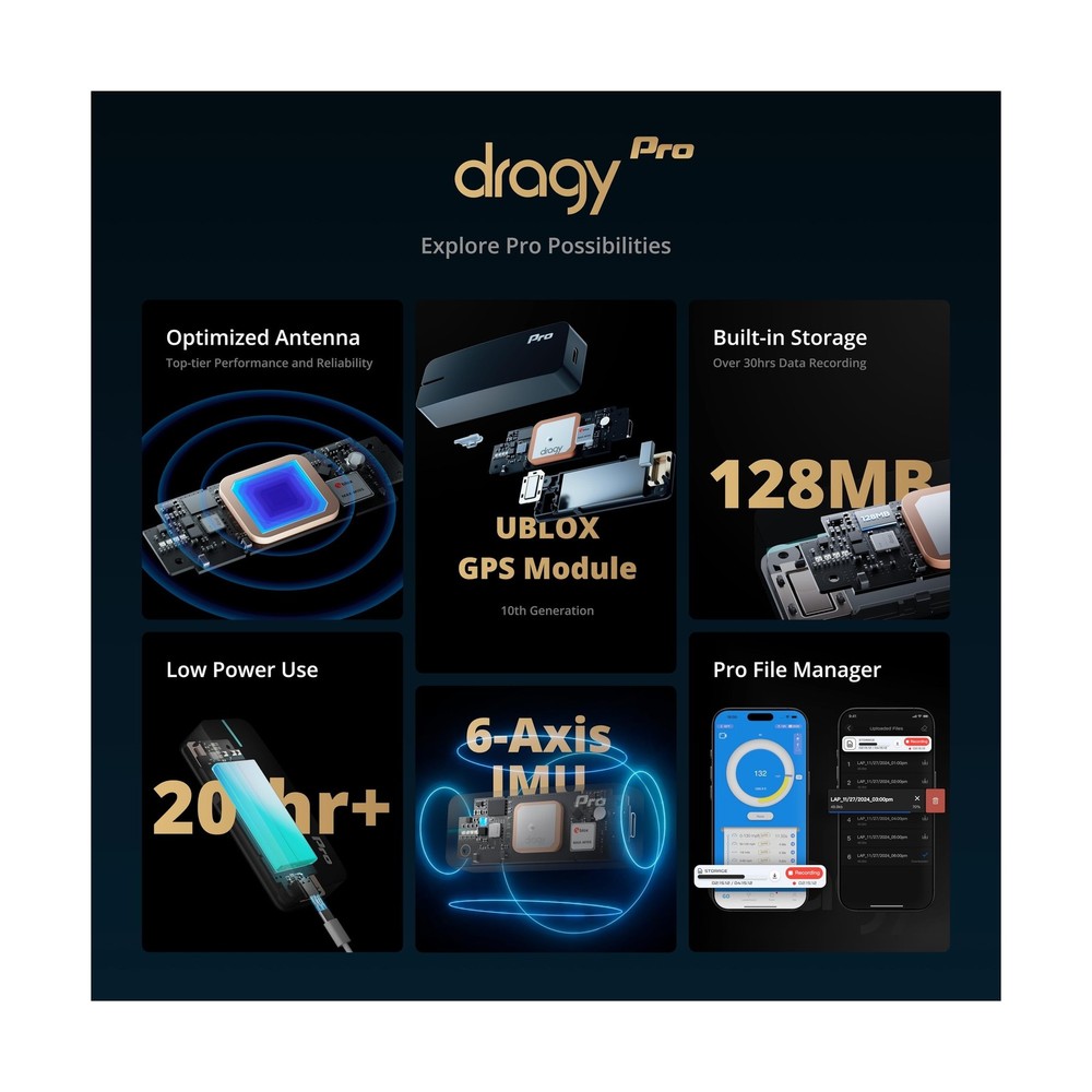 All New dragy Pro - Professional GPS Performance Meter, up to 25Hz GPS Laptimer, with Built-in Memory & 6-Axis IMU Motion Sensor | Includes dragy Mount for Easy Installation Description Features: RaceChrono Compatible Dragy Pro now is supported by RaceChrono, combining trusted data logging App with Dragy's ultra-precise GPS for accurate lap timing and performance insight. The built-in high-precision 6-axis IMU (Inertial Measurement Unit) motion sensor delivers enhanced accuracy in acceleration measurements, ensuring that every detail of your performance data is captured with precision. (More features with integrated lMU algorithm will be released later in 2025) Expanded 128MB Storage to capture and store more of your runs, up to 30 hrs Data Recording. Offers high-speed Bluetooth download, an advanced file manager, and a user-friendly interface. You can easily start a recording anytime and download data from any single run right after the recording. You can manage files at any time and delete individual runs. Includes the dragy Mount for quick, secure installation wherever you need it. The world's most powerful GPS module, UBLOX 10th Gen, powers the Dragy Pro to perform at its absolute best. It connects to up to 32 satellites across 4 GNSS systemsGPS, GLONASS, Galileo, and BeiDoufor unmatched accuracy and reliability. Engineered with precision and optimized for 1575.42 MHz, 1602 MHz, and 1561.098 MHz, the customized antenna ensures Dragy Pro delivers unparalleled performance. Supporting simultaneous reception of GPS L1C/A, Galileo E1-B/C, GLONASS L1OF, and BeiDou B1I & B1C signals, it guarantees exceptional accuracy and reliability. Featuring ultra-low power consumption, the Dragy Pro delivers over 20 hours of continuous use on a single charge. With an integrated extra low-noise amplifier, the antenna enhances signal quality to its peak, providing the most stable and precise connection possible. Product Details: Brand: Dragy Model Name: dragy Pro Vehicle Service Type: Car, Truck, Motorcycle Special Feature: Bluetooth Connectivity Technology: Bluetooth Map Type: Worldwide Included Components: Accessories (1 USB-C to USB-C cable, 2 mounting plates, 2 Hook and Loop strips), dragy Mount (window suction cup mount), dragy Pro device See more Battery Life: 20 Hours Mounting Type: Dashboard Mount Memory Storage Capacity: 128 MB Package Dimensions : 5.75 x 4.02 x 2.24 inches; 7.05 ounces Item model number : dragy Pro Batteries : 1 Lithium Polymer batteries required. (included) Date First Available : January 12, 2025 Manufacturer : Dragy International Limited Customer Reviews: 4.7 4.7 out of 5 stars 2,948 ratings Item Weight: 7 ounces Package Dimensions: 5.75 x 4.02 x 2.24 inches Item model number: dragy Pro Batteries: 1 Lithium Polymer batteries required. (included) Warranty: 1 year warranty Battery Life: 20 Hours Voice command: Buttons Date First Available: January 12, 2025 Delivery We Do Not Ship Outside of the Continental US. Return Policy All items qualify for returns within 30 days of receipt. Buyer is responsible for return shipping on any item that is not damaged. Feedback We take our reputation seriously, we buy and sell online, so we understand the value of trust. If you are unsatisfied with your order, please contact us and we will work with you to resolve it to your satisfaction.