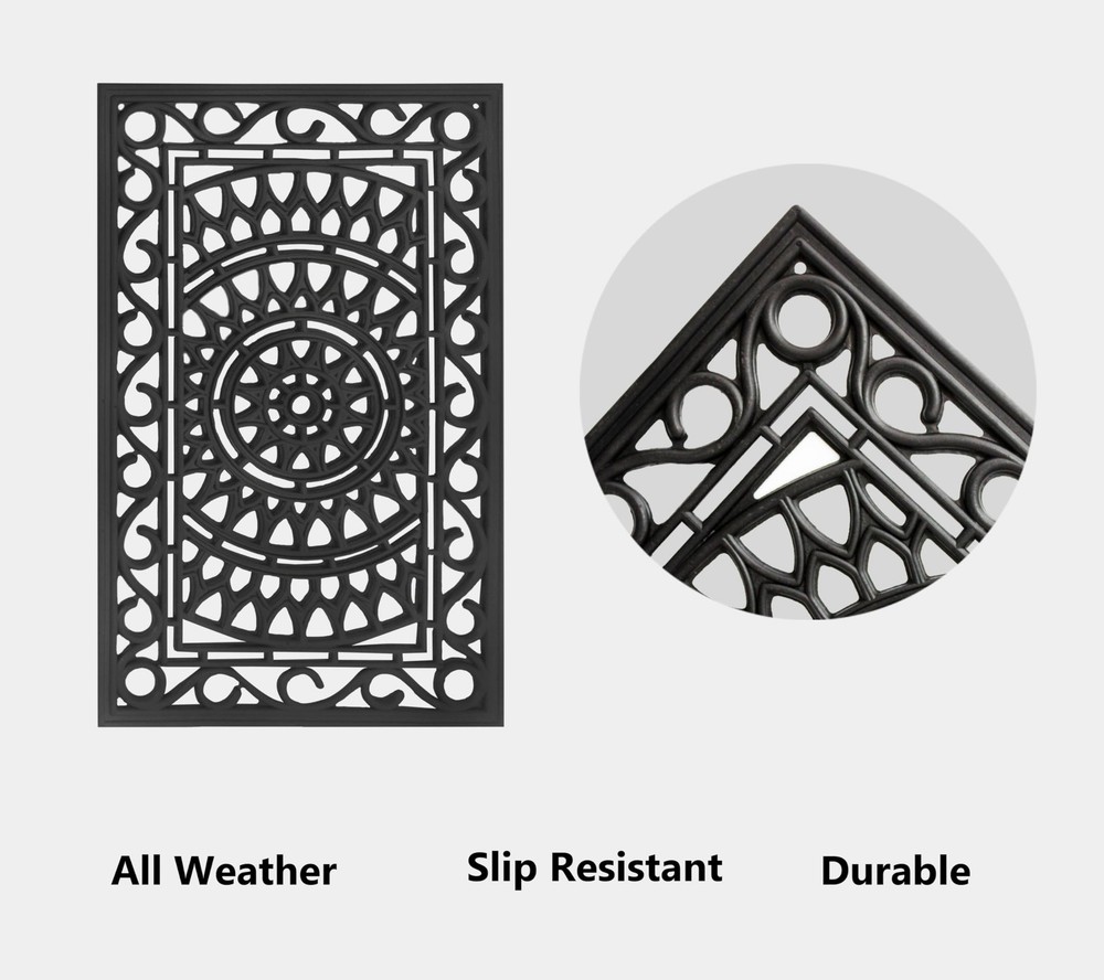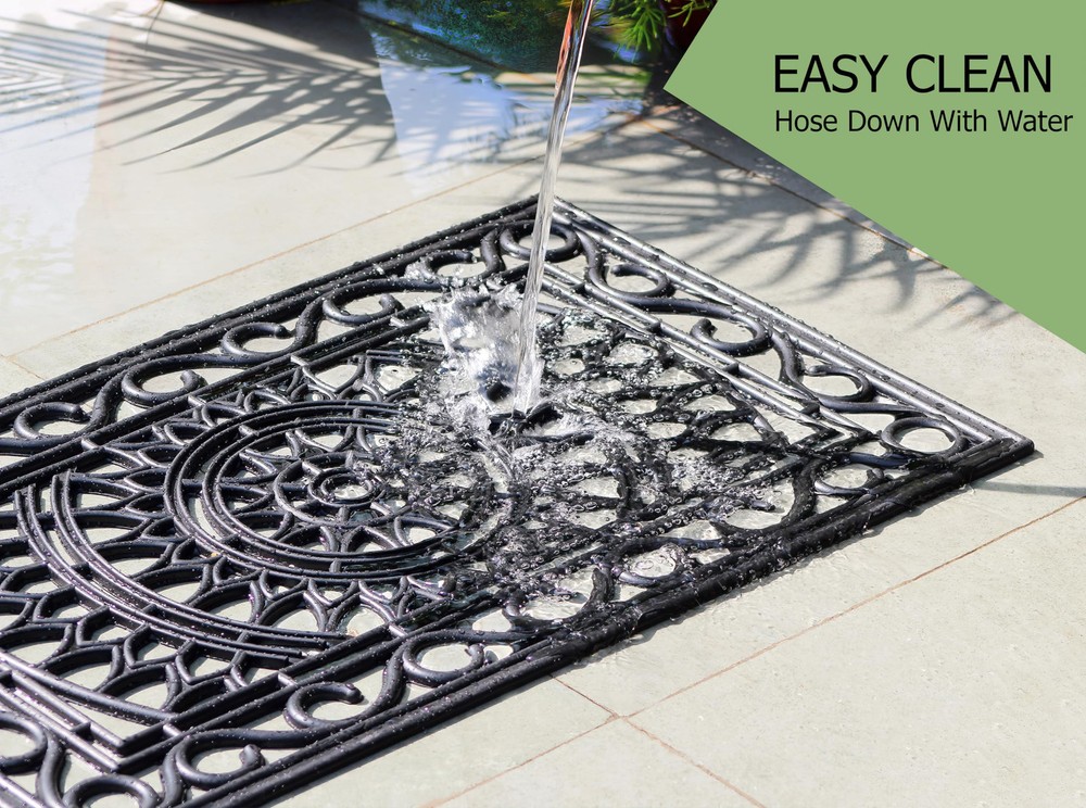 CONTENTS: One (1) Rubber Doormat measuring 17 inches by 30 inches. Thickness is approximately half an inch. Weighs approximately 4 pounds. Heavy duty rubber construction ensures door mat stays in place when wiping shoes. DURABLE, HIGH-QUALITY DOOR MAT: Not just a decorative element, the heavy-duty rubber construction of our doormats holds up to heavy foot traffic and protects your home from mud, dirt from the street, moisture, and foreign substances. This all-weather doormat made from durable rubber provides nonslip grip and stability allowing water to drain. Place this outdoor mat right outside the patio or front door to keep your entryways clean. VERSATILE USE: Keep one at each entryway, front door, porch, patio, deck, garage, workshop to keep dirt and debris outside while adding an aesthetic touch to your decor. Pet parents - limit the mess at mealtimes by placing these under the pet food bowls. Use in the kitchen for cushioning to prevent fatigue as you wash dishes and cook meals. Keep them in doorways throughout the home, in hallways, entryways or at bedroom doors to add a little charm to these spaces. GUEST FRIENDLY WELCOME DOORMAT: Our doormat's picture perfect intricately molded rubber design makes a great first impression and will ensure your guests feel welcome as they arrive at your home. CARE INSTRUCTIONS: Clean with wet cloth or just hose down with water.