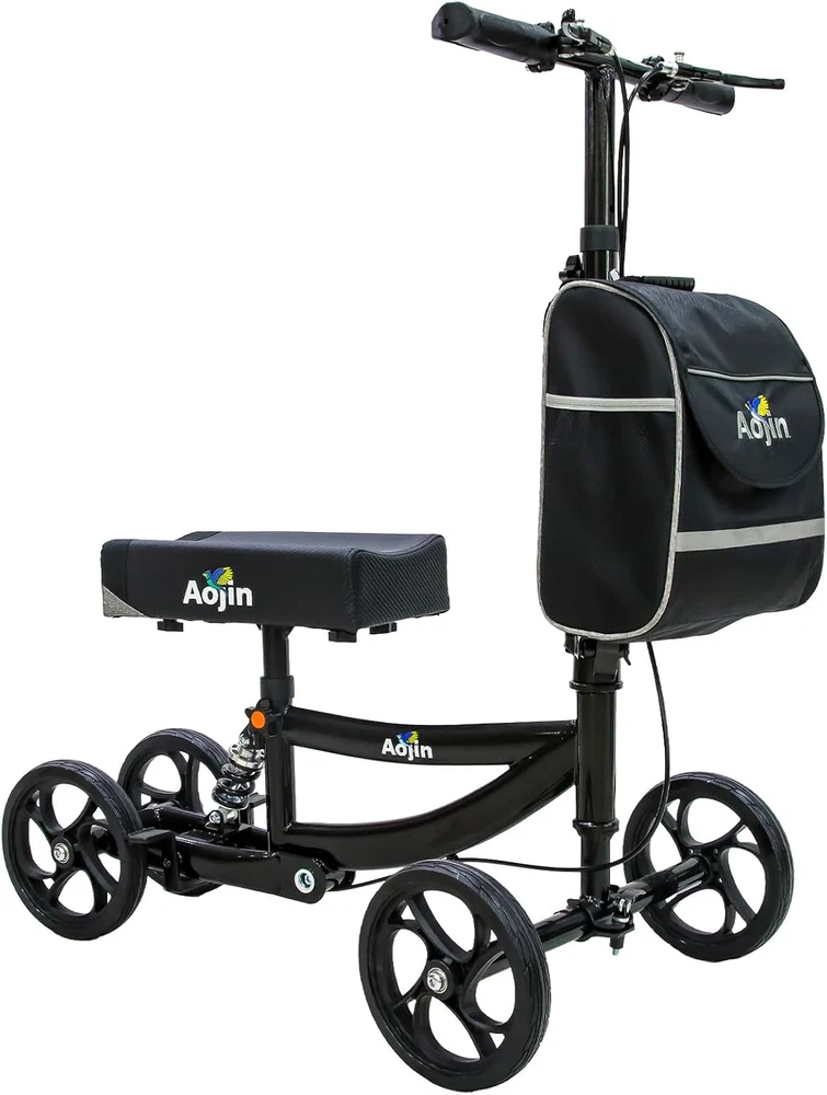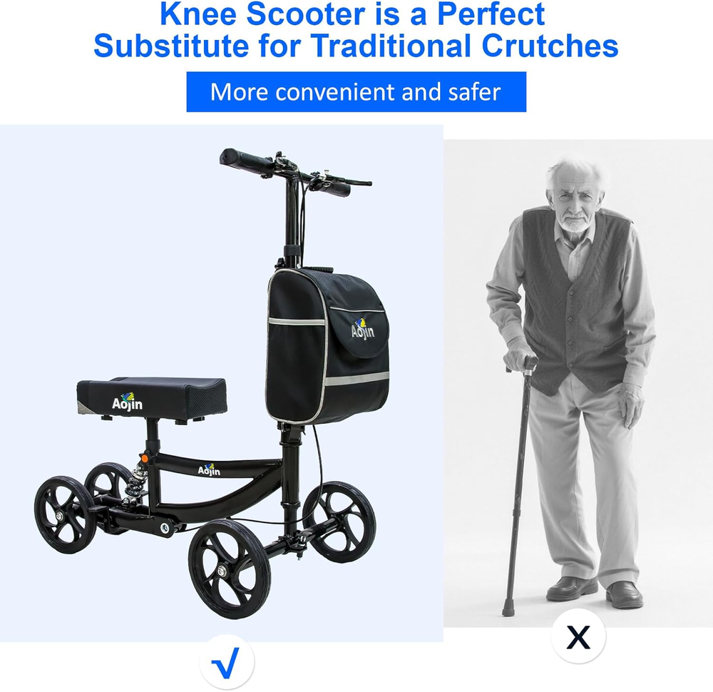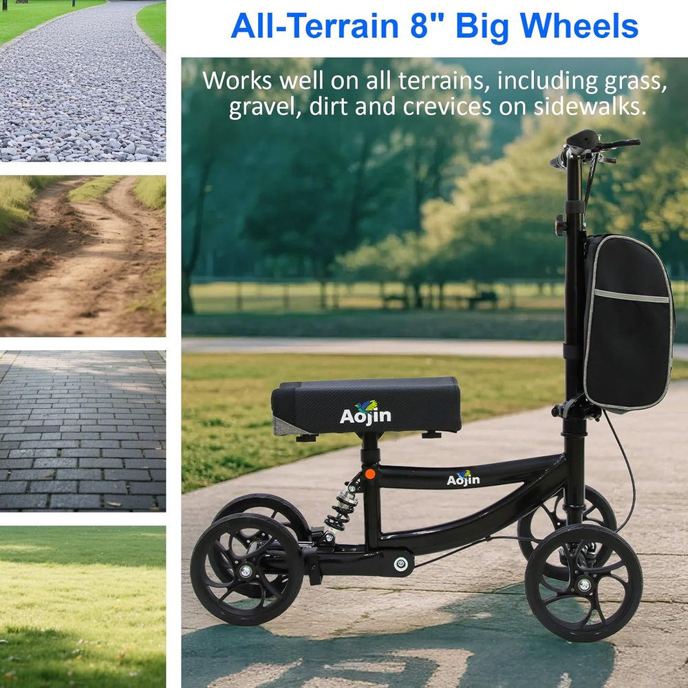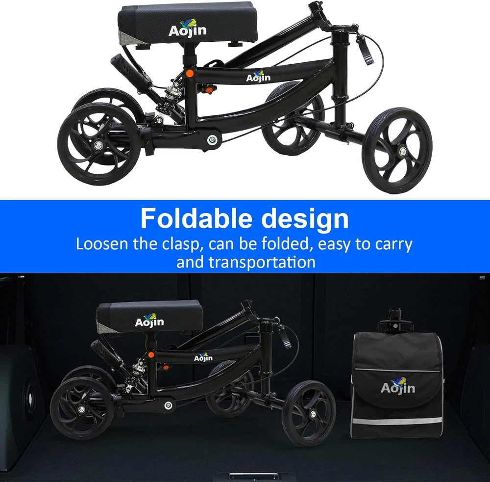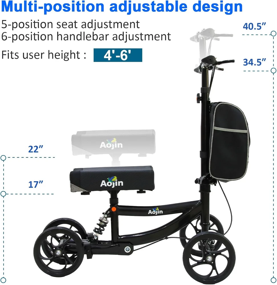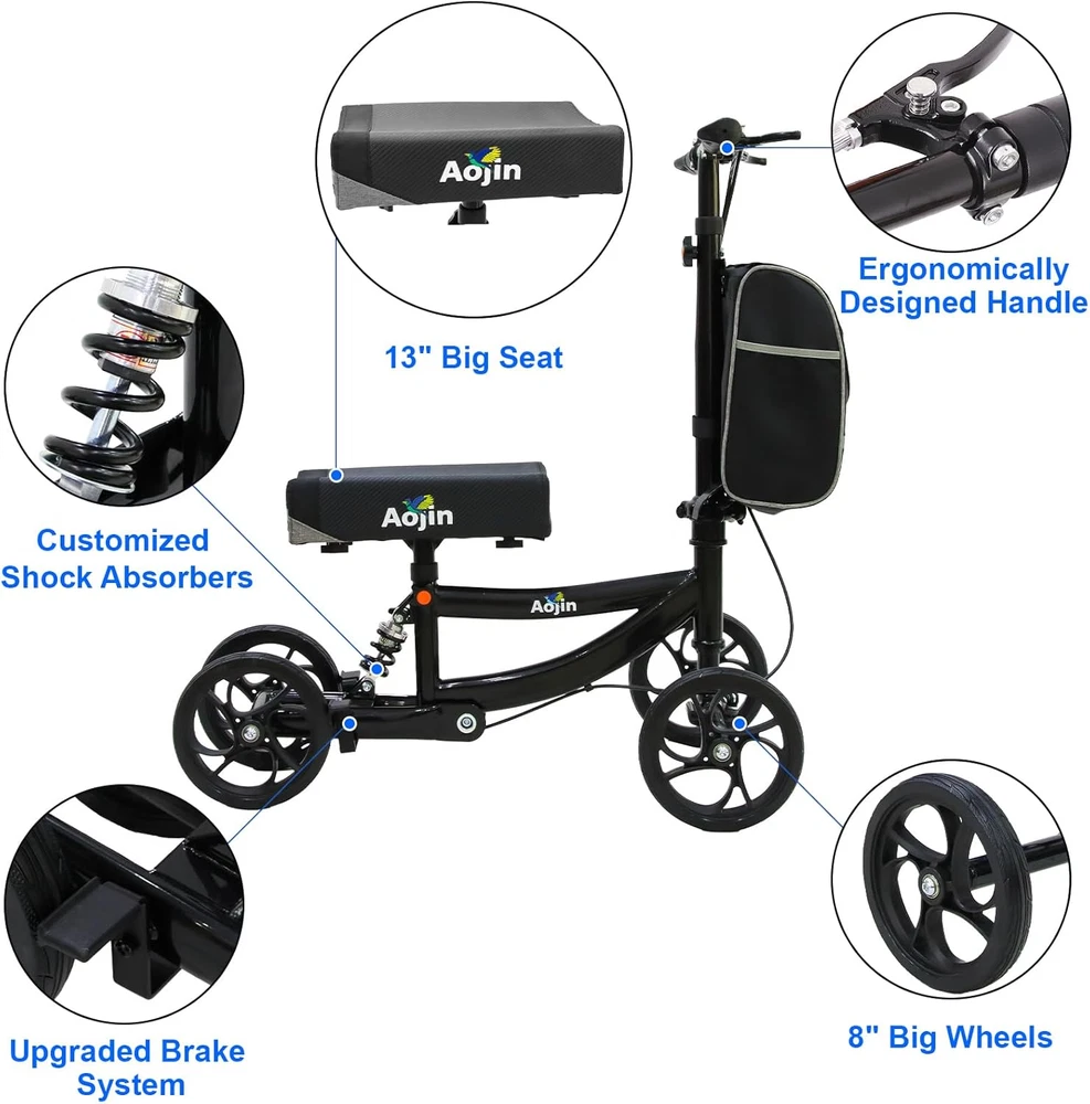 【Stability and Convenience Constructed】Constructed with a military-grade aircraft aluminum frame (23 lbs) that supports up to 300 lbs, this knee walker features custom shock absorbers reducing vibration by 41% and includes a detachable large front storage bag for optimal weight distribution. 【Comfort and Control】AOJIN knee scooter features a 13"D x 7"W x 3"H seat cushion made with innovative PU material, providing optimal user experience.Precision 120° Swivel Front Axle enhances maneuverability, One-touch parking at the handbrake design. 【Adjustable and Foldable Design】BlessReach knee walker cane replacement offers six-level adjustable knee pads and handlebars, and is recommended for users who are 5'6" to 6'6" tall. The folding knee scooter also features handlebars with a quick release folding mechanism for easy transport and storage. 【All-Terrain Big Wheels】These easy to maneuver steerable knee scooter walkers feature four 8" wheels, No need to inflate and explosion-proof , Reduces the trouble of inflating pneumatic tires, and is more stable and softer than other pvc wheels for knee scooter. Works well on all terrains, including grass, gravel, dirt and crevices on sidewalks. 【Trusted Reliability】Backed by 30+ years of medical mobility expertise, we control every process from in-house R&D to precision manufacturing. Every AOJIN walker undergoes 37 aligned quality inspections pre-shipment. Shop confidently with 30-day returns + 24/7 expert support. Product Description Aojin Rollator Walkers Add to Cart Add to Cart Add to Cart Add to Cart Customer Reviews 4.2 out of 5 stars 780 4.5 out of 5 stars 163 4.5 out of 5 stars 163 4.6 out of 5 stars 160 4.6 out of 5 stars 160 Price $96.99 $ 96 . 99 $129.99 $ 129 . 99 $129.99 $ 129 . 99 $116.99 $ 116 . 99 $139.99 $ 139 . 99 Foldable ✔ ✔ ✔ ✔ ✔ Weight Capacity 300 lbs 350 lbs 350 lbs 350 lbs 350 lbs Product Weight 23 lbs 16.5 lbs 16.5 lbs 16.5 lbs 16.5 lbs User Height 4'-6' 4'7"-6'5" 4'7"-6'5" 5.5'-6.5' 5.5'-6.5' Wheels Size 8" 8" 8" 8" 8" Material Aluminum+ Carbon steel Aluminum+ Carbon steel Aluminum+ Carbon steel Aluminum+ Carbon steel Aluminum+ Carbon steel Seat Size 13" 18" 18" 18" 18"