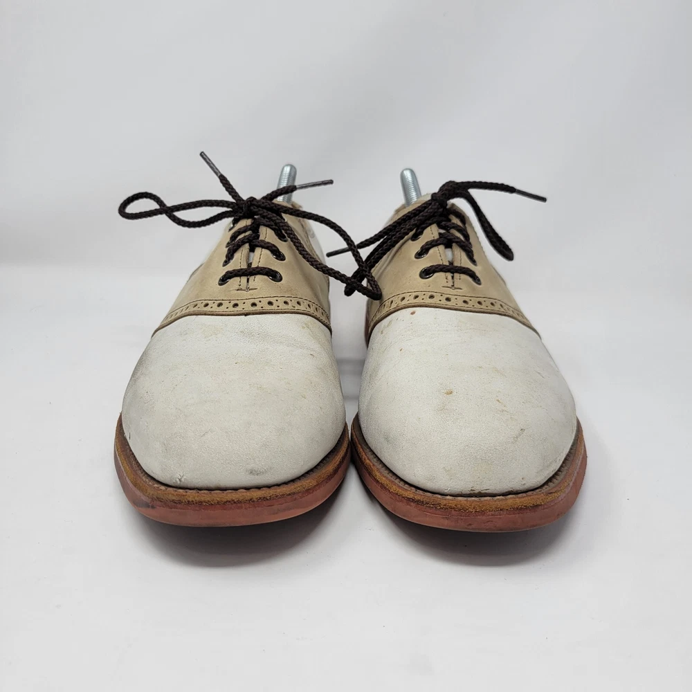 Elevate your style with these Allen Edmonds men's dress shoes. Crafted from premium beige and tan leather, these Oxford lace-up shoes feature an almond toe and colorblock pattern with the brand's iconic logo accents. The adjustable straps and Vibram gumlite outsole provide comfort and performance, making them perfect for any occasion. These shoes are tailored for a classic look with a preppy city vibe and are suitable for winter, summer, fall, and spring. They are available in US size 10.5 and UK size 10, with a C shoe width. The lining, insole, and outsole are made of leather, ensuring durability and quality. Add a touch of sophistication to your wardrobe with these timeless Allen Edmonds saddle shoes. These shoes are in excellent “pre owned” condition. For more information, please see photos or feel free to contact me with any questions. All orders are shipped within 24 hours of payment received.
