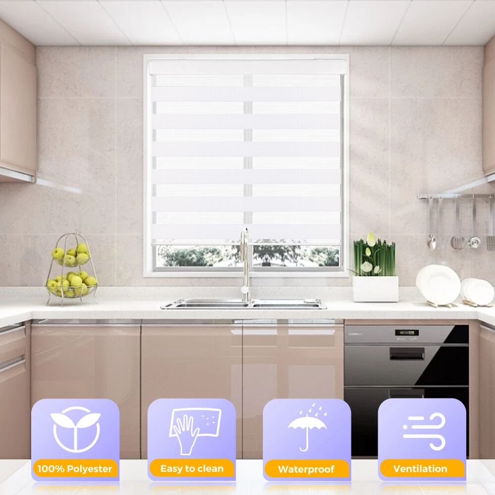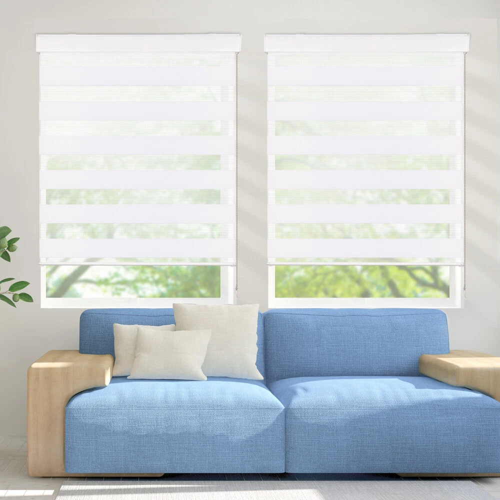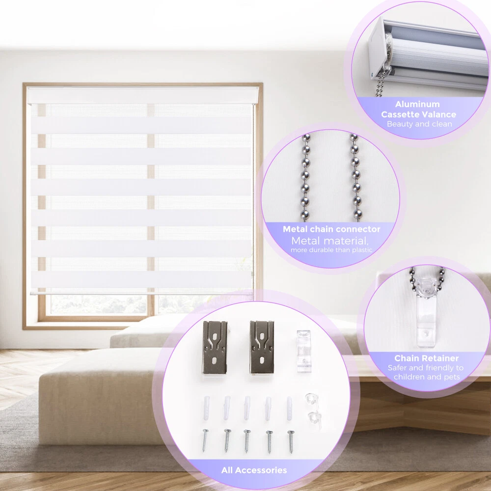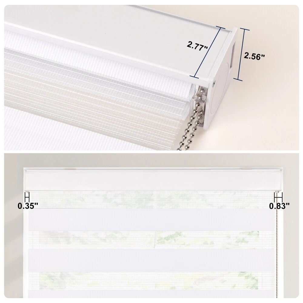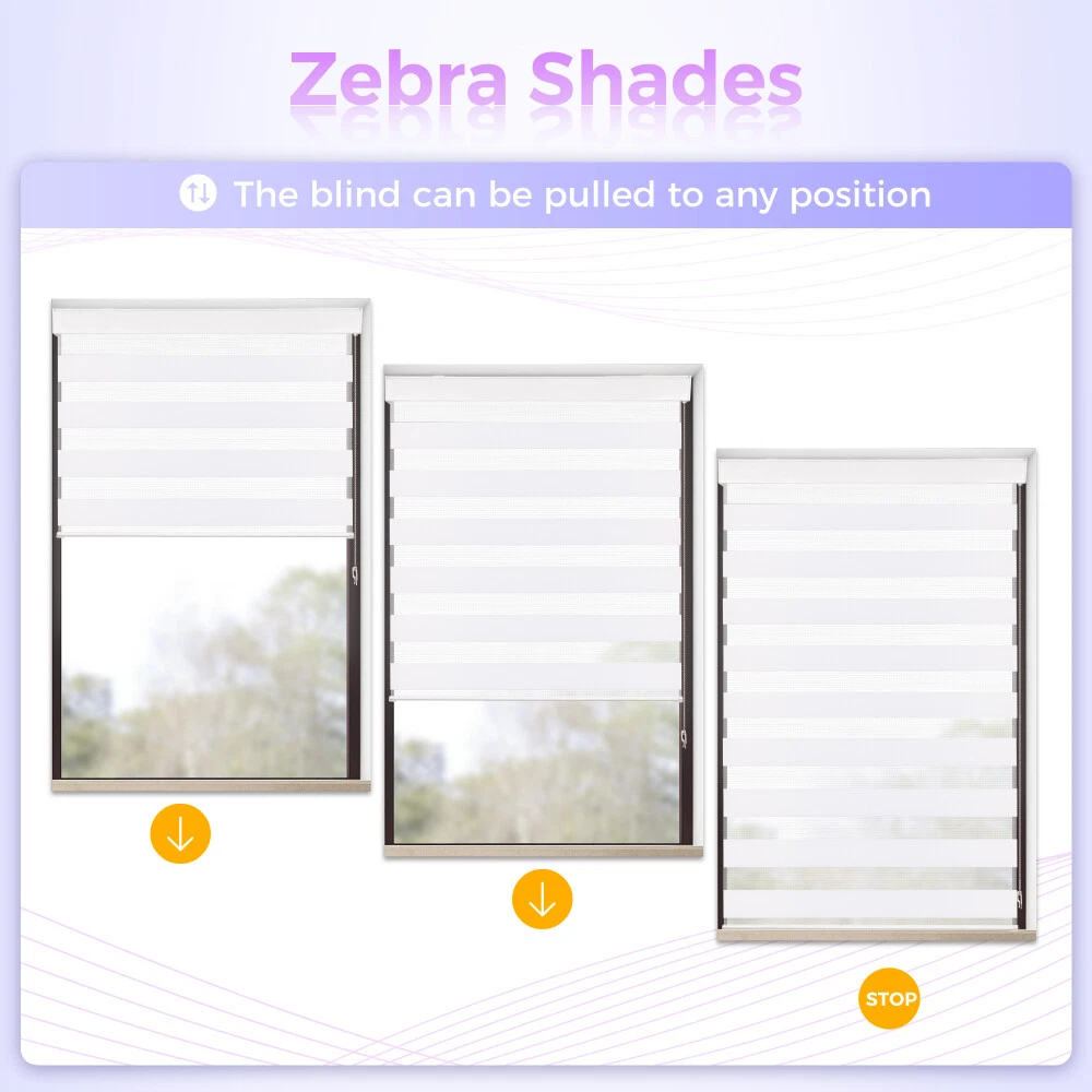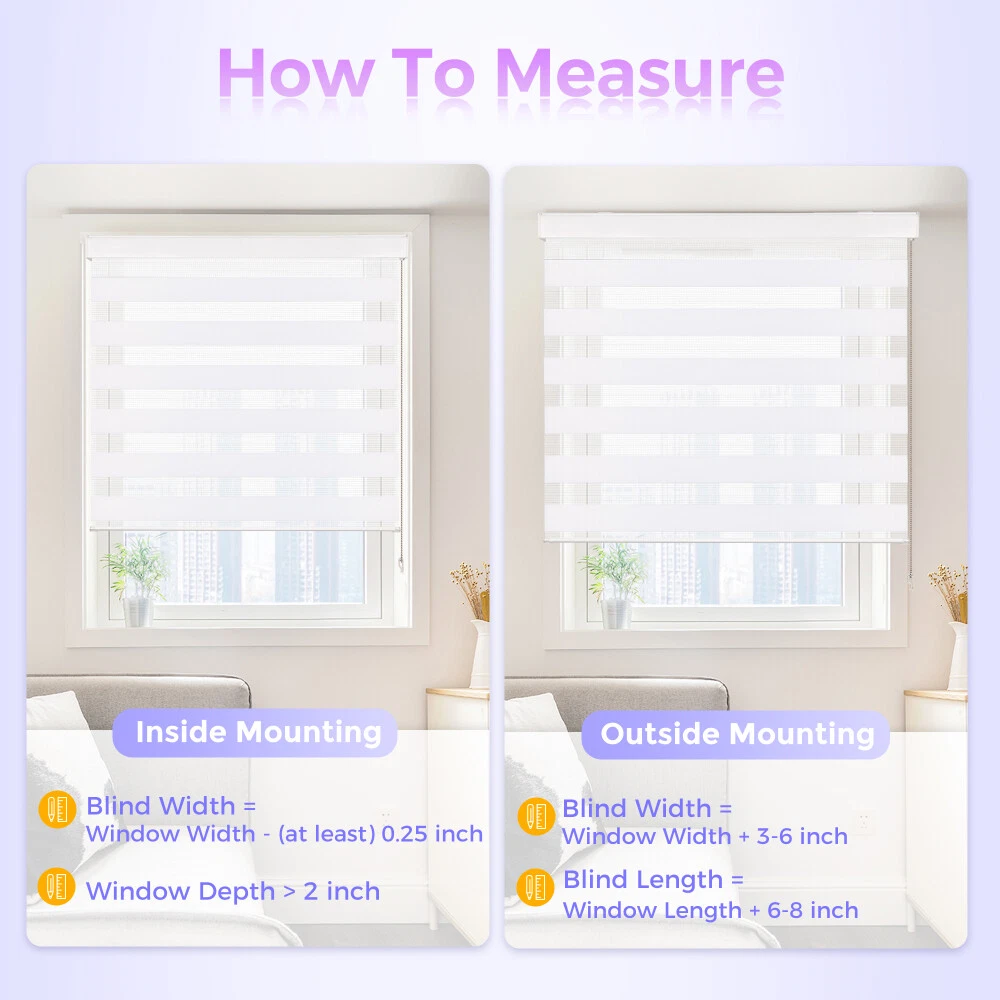 Light Filtering Coreded Zebra Window Shades More Colors Heather Grey L ight Grey Car bon Grey White D esign Details of Blinds How to Measure Size Durable Material:Zebra Blinds are made of pure polyester fiber;featuring waterproof;anti-static;dustproof qualities.With a mix of transparent mesh and opaque fabric slats, you can adjust light and privacy.Offer UV protection and durability for all seasons Blinds Function: Our Zebra Shades feature a sturdy aluminum box above the fabric tto ensure that the fabric is dustproof, stays clean and lasts longer. This design blocks light effectively, creating a more comfortable sleeping environment Widely Used:This zebra window blinds is suitable for any indoor style. Its modern functionality and basic colour options make these zebra colours perfect for your living room, bedroom, dining room, kitchen, office and more Simple cleaning: Use a feather duster or soft brush or cold water to clean the zebra shade, which can be used for many years. Zebra blind are very easy and quick to install, we provide detailed instructions for your reference Size and Installation: For Inside Mount, blind width is window width reduced by at least 0.25 ", with window depth over 2 ". For Outside Mount, blind width is window width increased by 3 to 6 ", and blind length is window length increased by 6 to 109 "