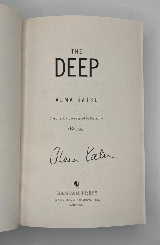 THE DEEP [Signed] Author: Katsu, Alma Title: THE DEEP [Signed] Publication: London, UK: Bantam, 2020 Edition: Limited Edition #116/250 Description: Octavo, 420 pages. In Very Good condition with Very Good condition dust jacket. Spine is aquamarine and black with white lettering. Dust jacket protected by mylar covering, price uncut: "£16.99" on front flap, and has moderate creasing along rear head joint and rear head edge. Boards have mild shelving wear along spine head and tail and to rear head joint. Contains publisher's THE DEEP bookmark between front endpapers. Signed flat by Alma Katsu on publisher's limitation page, limited edition #116/250. Shelved in hallway. Seller ID: 1388133 Subject: Literature Welcome to the eBay store of Second Story Books! DC's Oldest Rare and Used Bookstore, Second Story Books operates two open shops in the Washington D.C. metropolitan area. We have an extensive internet presence and provide accredited appraisals member ASA. This listing was created by Bibliopolis.