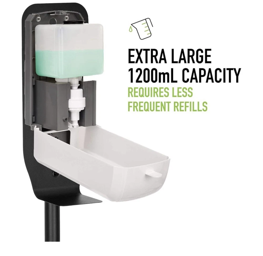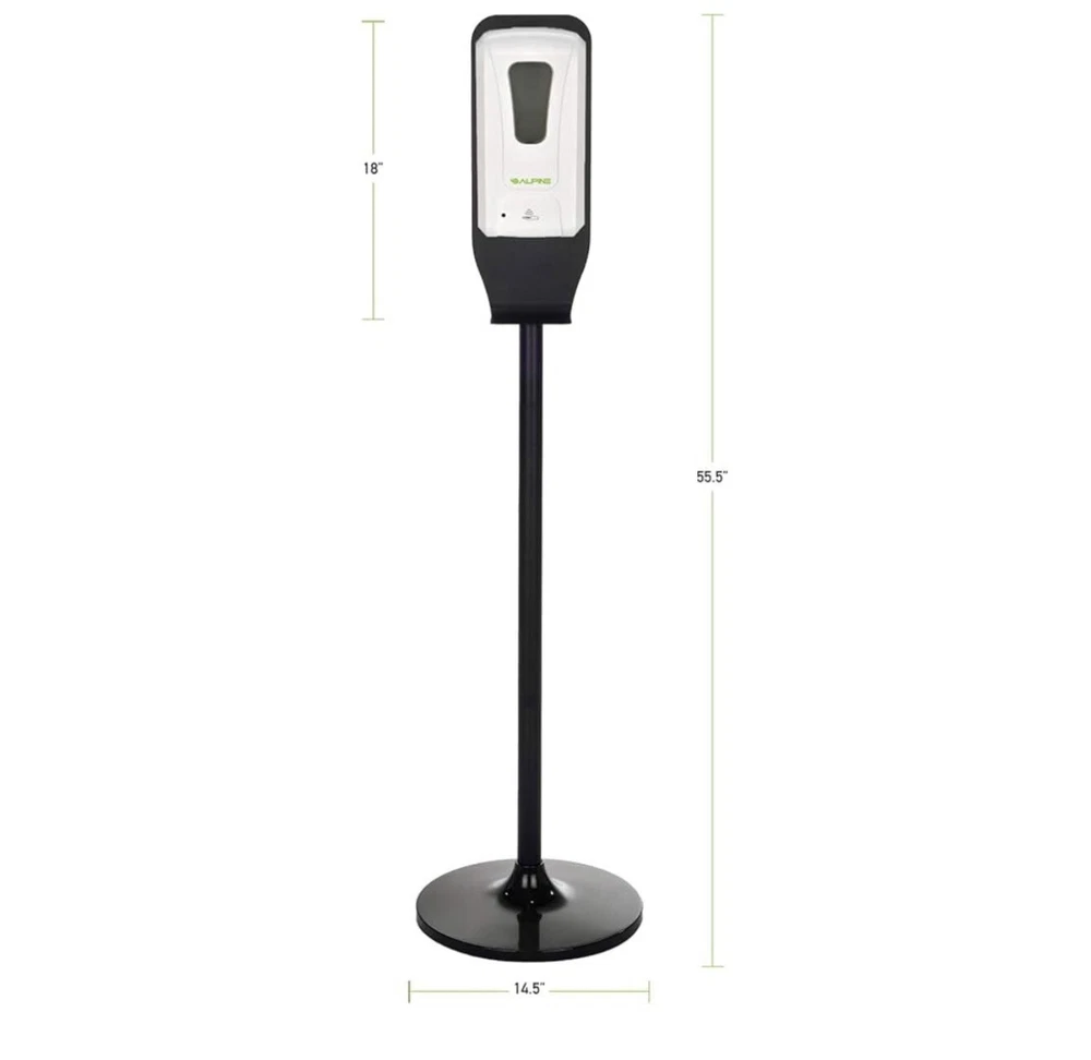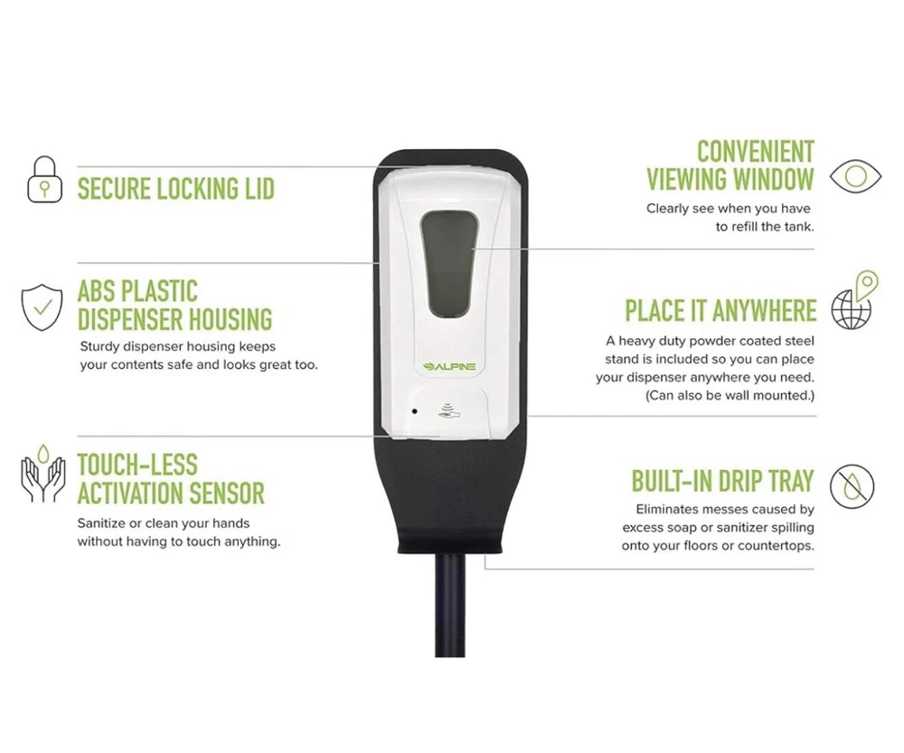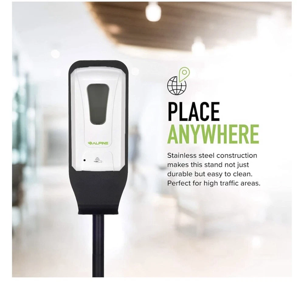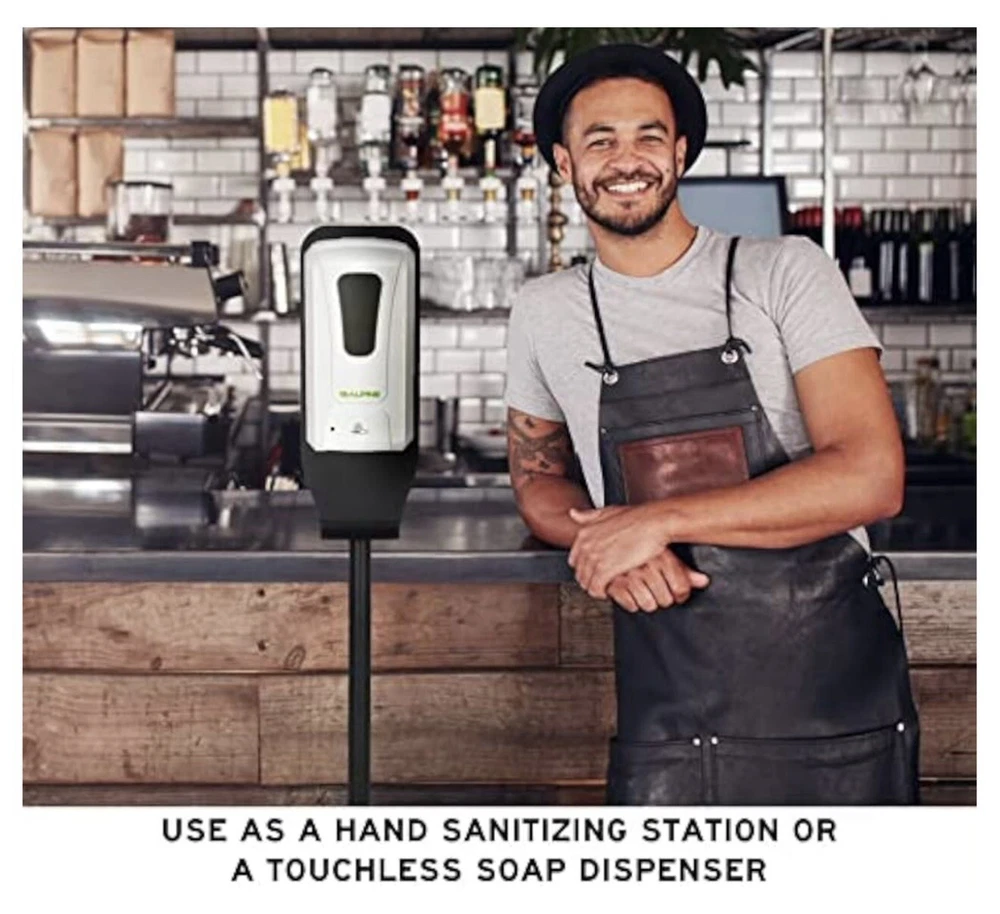 ✔️ TOUCHLESS SOAP DISPENSER: Alpine Automatic Sanitizer Dispenser Makes it Simple and Easy To Get a Shot of Hand Sanitizer Without Having To Touch, Squeeze or Pump a Dispenser. It's Designed With A Smart Motion Sensor For The Exact Amount Needed On Your Command. ✔️ YOU CHOOSE HOW TO USE: Alpine Universal Soap Dispenser Can Be Used in Kitchen, Bathroom, Garage, Porch, Classroom, Office, Airport, Hotel, Restaurant, Hospital, School, University, Supermarket, Commercial, indoor, Outdoor AND It Works With Any FOAM sanitizer You Desire. Holding A 1200ml Tank That Eliminates The Hassle of Constantly Refilling Your Dispenser, One less Thing To Worry About With Alpine. ✔️ ON A STAND OR WALL MOUNTED: Alpine Hands-Free Soap Dispenser Comes With An Elegant, Easy To Assemble Portable Stand with a Built-in Drip Tray That Catches Any Extra Drips In Case You Moved Your Hand Fast. You Also Have The Option To Take It Off The Stand And Wall Mount-It If You Wanted To! (Accessories Included). ✔️ BATTERY & ADAPTER OPERATED: Our Electronic Heavy Duty Soap Dispenser Requires (4) 4C Batteries For Long Term Usage (Not Included) or A 6V Adapter For An Even Longer Term Usage (Sold Separately). You Prefer Batteries Or Adapter? WARNING: This product can expose you to chemicals including lead and Di(2-ethylhexyl)phthalate (DEHP), which are known to the State of California to cause cancer and birth defects or other reproductive harm. For more information go to P65Warnings. ca .gov