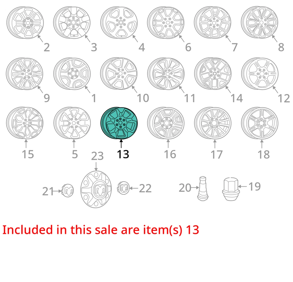 Store Home About Us Customer Resources Feedback Contact Us Aluminum 20x9 6x139.7mm Wheel 6FF70VXWAA Fits 2019 Ram 1500 2964717 Free Shipping - WHEEL ONLY - No Tire/Tpms/Center Cap Description Original Equipment Wheel Schram Auto Parts - Wheel Wheel does NOT come with TPMS, Valve Stem, or Center Cap Steel Wheel does NOT come with Wheel Cover (which may be pictured) Fitment: Please Confirm Wheel Size, Lug Pattern, and Fitment Before Purchase This listing is for a Wheel . Please note that the wheel does NOT come with TPMS, valve stem, or center cap. Fitment is the responsibility of the buyer. We will do our best to advertise fitments. Please use the part number, pictures, and description provided to ensure this part fits your vehicle. Wheel Condition Guide: For a sample of conditions, please see: ARA Wheel Grading Guide Wheel condition is listed in Conditions & Options as the first letter: A = A Condition Wheel B = B Condition Wheel C = C Condition Wheel REMAN = Remanufactured Spare = Spare Wheel Important Details **No TPMS, Valve Stem, or Center Cap with Wheel.** **If you are buying a steel wheel, it may be pictured on the vehicle with a wheel cover which is not included.** Get Expert Advice from Chad If you have any questions, please don't hesitate to ask us on eBay or call and ask for Chad. We're here to assist you with your automotive needs. Vehicle 2019 RAM15NEW Mileage 65000 Part Grade B What's this? Conditions B,20,ALUM,LR Fitment Guide This item will fit the following vehicles / applications: DODGE 1500 PICKUP 19 new style (6 lug wheel), 20x9, road wheel, 5 spoke, opt WRW (painted black) R# 2964717 Stk# LR0956 Holl# 560-02675 More Parts for 2019 RAM15NEW » More Parts from this exact vehicle. » Accessories Brakes and suspension Cooling Systems Electrical and Lighting Engine and Drivetrain Exterior Parts & Sheet Metal Interior Parts Wheels and Tires Customer Service Payments Shipping International Returns FAQs Contact Us Quick Links Store Home About Us Feedback