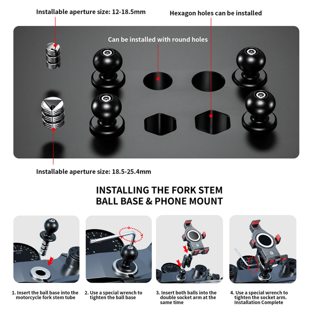 Store Home Promotion Hot Item Add to Fav Contact us Feedback New arrival travelstylespot^-^ Merry Christmas Home & Garden Crafts Clothing, Shoes, Accessories Baby Sporting Goods Jewellery & Watches Computers/Tablets & Networking Vehicle Parts & Accessories Health & Beauty Phones & Accessories Pet Supplies Industrial Toys, Hobbies Cameras Electronics Musical Instruments Video Games & Consoles Home Entertainment Home Appliances Business Collectables Dolls, Bears Prodcution Description : Ball Mount Adapter 17mm 25mm Motorcycle Fork Stem Mount Aluminum Alloy Front Fork Bar Ball Head Anti-theft Motorbike Accessories Feature: 1. Versatile Design: The black fork stem base design is suitable for cylindrical or hexagonal hole walls of motorcycle fork stems, making it compatible with a wide range of vehicles such as motorcycles, bicycles, scooters, SUV, and electric cars. 2. Two Size Options: The package includes two metal washers in two different sizes to fit tube holes ranging from 12mm to 25.4mm in diameter. You can select the appropriate washer size based on the diameter of your tube. 3. Simple Installation: The ball mount adapter is easy to install and comes with pre-installed screws that require no additional tools. Simply select and install the correct washer before mounting the ball base. 4. Anti-Theft Design: The screw head of the mobile phone holder has a specially designed screw slot, and it comes with a special wrench to tighten or loosen the bolt, providing extra security for devices connected to this mount. 5. Compatible with Various Devices: This motorcycle fork stem mount can be used as a phone holder base, sports camera mount, GPS mount, and more, increasing its versatility and practicality. Specification: Origin: Mainland China Material Type: Aluminum Alloy+ZincAlloy+TPU Model Name: Black Fork Stem Base Colour: black Type (optional): 17mm/25mm Applicable calibre:12-25.4mm Package size: 100 x 50 x 30mm/3.94 x 1.97 x 1.18inch Note: Due to the different monitor and light effect, the actual color of the item might be slightly different from the color showed on the pictures. Thank you! Please allow 1-2cm measuring deviation due to manual measurement. Included 1 x Front Fork Bar Ball Head 1 x Wrench Pictures PAYMENT DELIVERY WARRANTY PAYMENT We accept PayPal only. All major credit cards are accepted through secure payment processor PayPal. Payment must be received within 7 business days of auction closing. If you have bought multiple items from me, you can send me one payment for all the items instead of paying for them individually. When you click the Pay Now button, eBay will automatically determine if there are other items you have won or purchased from me and will combine them for your review. NOTE: Import duties, taxes and chargers are not included in the item price or shipping charges. These charges are the buyer's responsibility. Please check with your country's customs office to determine what these additional costs will be prior to bidding buying. DELIVERY 1. We Ship to Worldwide. 2. Items will be shipped within 2 business day on payment received. 3. Item are shipped from shenzhen using Airmail, reach most of the countries within 10 to 20. 4. Delivery time depends on destination and other factors, it may takes up to 20 business days. WARRANTY 12 months Warranty. Buy with confidence! If you are not satisfied when you receive your item, please return it within 14 days for a replacement or money back. Please contact me before you return it. If item is defective in 3 months, We will send you a replacement without extra charger, or offer refund after we receive the defective item. If item is defective after 3 months, you can still send it back to us. We will send you a new one after receiving the defective item. But you have to pay the extra shipping fee.