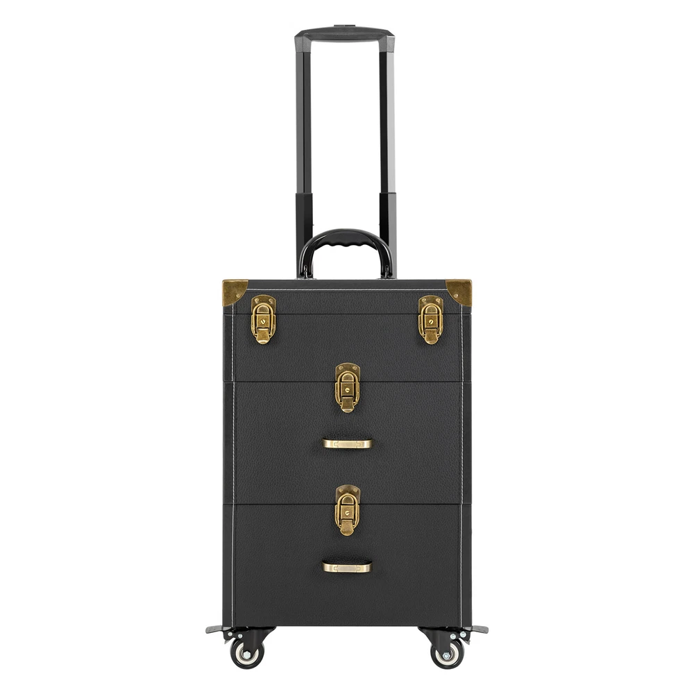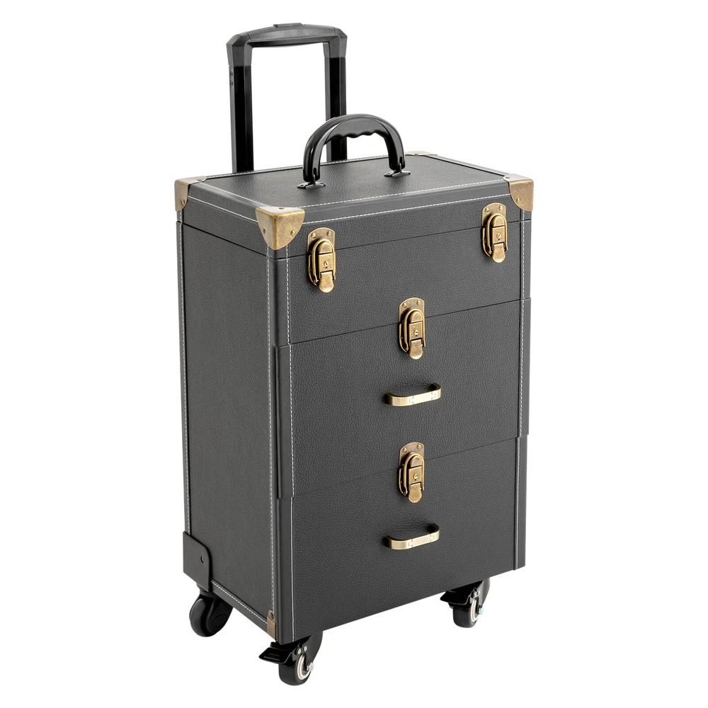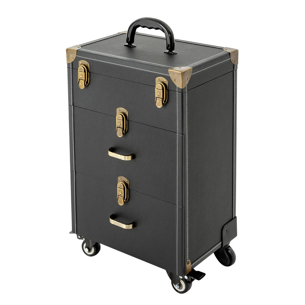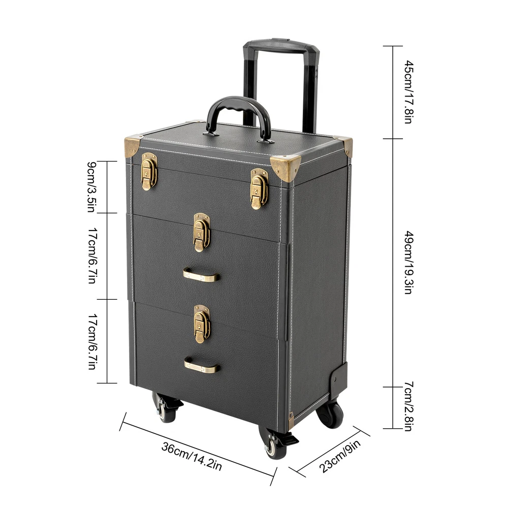 Aluminum Cosmetic Case Professional Trolley Makeup Train Case with Drawer Black Makeup Train Case, Rolling Makeup Trolley Case, Nail Polish Organizer, Jewelry Travel Cosmetic Train Case w/ 4 Wheels, Black Description If you are troubled by storing all your hairdressing tools in order and finding them easily, our makeup train case can be of great help to you. Featuring high durability, attractive appearance, large capacity, universal wheels, humanized handles, a telescopic rod, and more, this product is easy to carry outside while keeping practical and beautiful. It is an ideal choice for young manicurists, make-up artists, and hairdressers/cosmetics lovers to store various cosmetics. Key Features Beautiful Appearance: Elegant black color combined with a rectangular frame, smooth lines, and delicate lychee texture gives this product a stylish and beautiful look. High-quality bronze hardware and exquisite stitching also add to its appearance. Durable and Sturdy: This product is constructed with premium PU, PVC, and reinforced corners, aluminum alloy rod, zinc alloy-wrapped edge , which is waterproof, wear-resistant , and has a long service life. Categorized Storage : The 3-tier and compartment designs, cubicles, and a large clear pocket on the lid give this case a large capacity to hold your daily cosmetics and makeup tools in a categorized way, allowing you to quickly find what you want. And the dividers are removable for organizing different sized bottles. Easy to Move&Carry: 4 universal wheels (2 of which are lockable) ensure that the case can be moved smoothly and silently in all directions and allow for safe fixation to handle different road conditions. The telescopic handle and top handle give it high portability. Easy to Clean: The lid and drawer designs can prevent dust from entering, along with the waterproof surface, making it easy to clean. You just need to wipe off the dirt with a wet cloth. High Safety: The 4 latch locks and waterproof surface provide maximum protection and security for your toiletries, giving you peace of mind while traveling. Excellent Load-bearing Capacity: The sturdy construction and the zinc alloy frame provide the product with an excellent weight-bearing capacity of 88.2 lbs. You can place all kinds of hairdressing and beauty tools in it with confidence. Protective Packaging: To prevent the product from being damaged and bumped during transportation, we pack it with pearl cotton for maximum protection of your products. After-sales Service : We aim to provide quality products and services. If you have any problems, please feel free to contact us, and we will reply and solv e the problem for you as soon as possible. Details Back Buckles: The back of the luggage has two hardware eight-nail back buckles to make the case more stable and to ensure that it remains as good as new when repeatedly opened and closed. User-friendly Drawer Handle: The 2 comfortable drawer handles of the second and third tiers allow for convenient closing/opening of the drawers, thus ensuring easy access to the inside items. Application It is good for manicurists, makeup artists, both beginner and professional, freelance makeup artists, wedding makeup artists, celebrity makeup artist, and cosmetic trainees. Structure Overview The inside of the lid has a makeup bag where you can keep the things you use regularly for quick and easy access. The first tier can be used for nail varnish or other small items. The second tier is suitable for larger items such as hair dryers, curling wands, nail art machines, and more. The third tier has two compartments for medium items, such as cosmetics, hairspray spray. Specification Target Audience: Unisex Adult Caster Type: Swivel Mounting Type: Free Standing Material: PU, PVC, Zinc Alloy, Aluminum Alloy Color: Black Shape: Rectangular Number of Tiers: 3 Number of Wheels: 4 Max. Load-bearing Capacity: 40kg/88.2lbs Number of Keys: 2 Lid Size: 36*23cm/14.2*9inch Wheel Height: 7cm/2.8inch Telescopic Rod Length (Min.): 38cm/14.9inch Telescopic Rod Length (Max.): 86cm/33.8inch Second Tier Inside Size: 30*19.5*13.5cm/11.8*7.7*5.3inch Each Compartment of Top Tier Size(L*W): 3.5*3.5cm/1.4*1.4inch Each Compartment of Third Tier Size: 14.5*19*13.5cm/5.7*7.5*5.3inch Top Tier Height: 9cm/3.5inch Second&Third Tier Height: 17cm/6.7inch Overall Case Body Size: 36*23*49cm/14.2*9*19.3inch Overall Product Size: 36*23*101cm/14.2*9*39.76inch Package Size: 63*32*41cm/ 24.8*12.6*16.14inch Gross Weight: 10kg/22.04 lbs Product Weight: 9kg/19.84 lbs Package Included 1*Makeup Train Case 2*Keys Notes Please note that cosmetics or makeup tools are not included. This product is a carry case only. This product includes two keys. Please allow the slight color difference caused by the shooting light and 1-3 cm error due to manual measurement, and make sure you do not mind before ordering. Payment Delivery details Terms of sales About us Contact us Payment We accept ebay payment 。 Fees such as import duties, taxes are not included in the item price or shipping costs. These charges are the buyer's responsibility. Delivery details Shipping: 2-9 working days to: USA Terms of sales We maintain high standards of excellence and strive for hundred percent customer satisfaction. Feedback is very important to us. We hope that you contact us immediately before you give neutral or negative feedback, so that we can address your concerns. It is impossible to address issues if we do not know about them! About us Your satis faction is our ultimate goal. We work hard to earn your trust and future business. Our certified technicians have tested each item before shipping. The unit comes with 1 year limited warranty on all manufacturing defects. a) If you receive a defective item, you may return it or ask for a discount. Please contact us within 14 days after you receive the package. b) What you returned must be intact and in its original packaging as re? u. Customer is responsible for shipping costs of