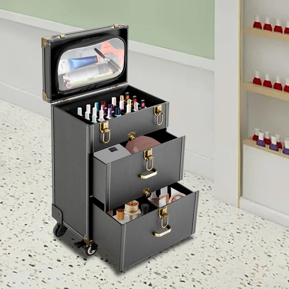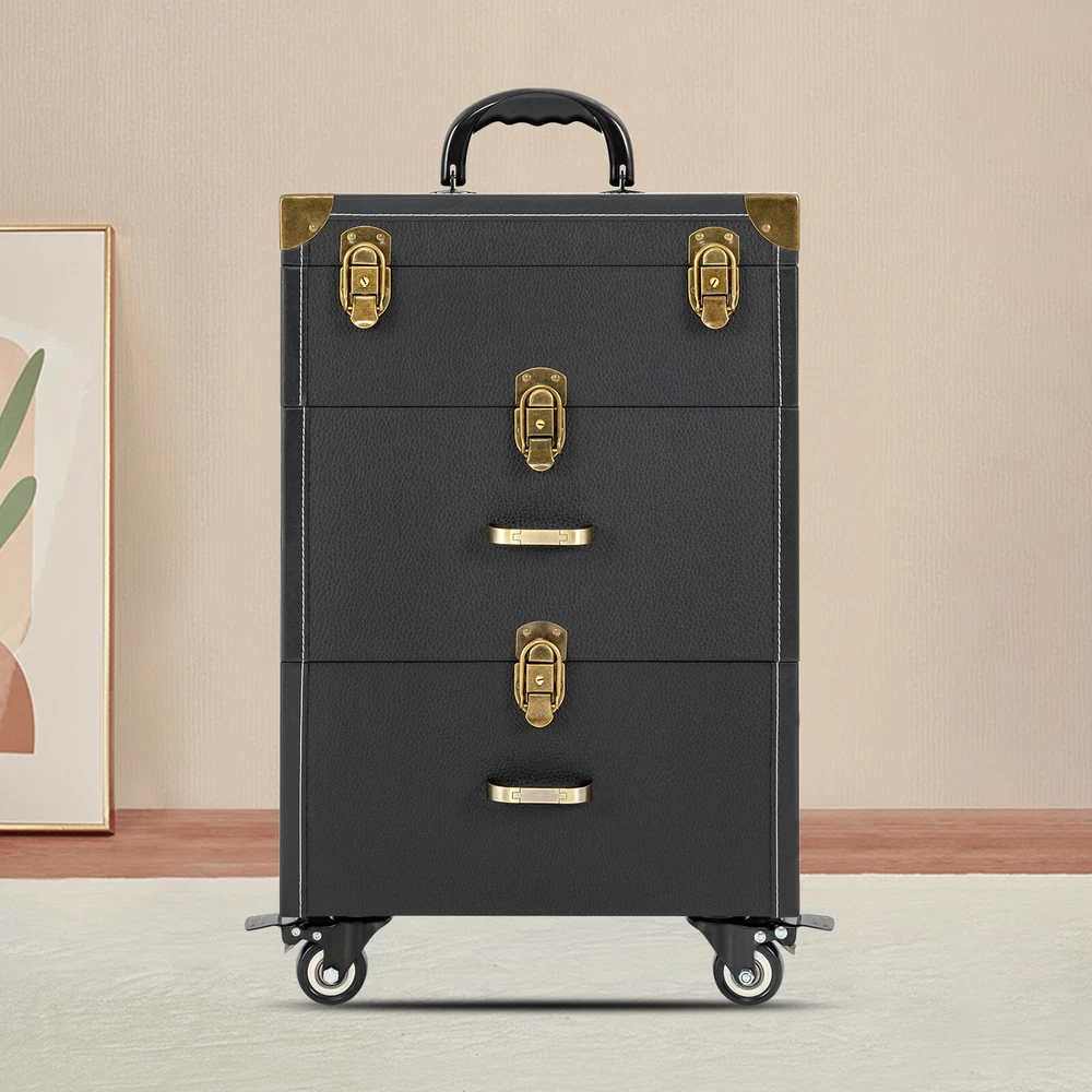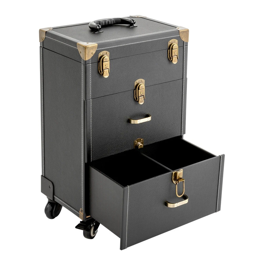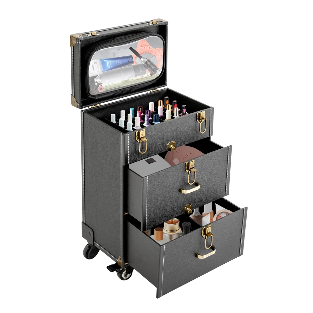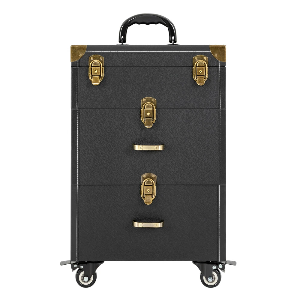 Aluminum Cosmetic Case Professional Trolley Makeup Train Case with Drawer Black Makeup Train Case, Rolling Makeup Trolley Case, Nail Polish Organizer, Jewelry Travel Cosmetic Train Case w/ 4 Wheels, Black Description If you are troubled by storing all your hairdressing tools in order and finding them easily, our makeup train case can be of great help to you. Featuring high durability, attractive appearance, large capacity, universal wheels, humanized handles, a telescopic rod, and more, this product is easy to carry outside while keeping practical and beautiful. It is an ideal choice for young manicurists, make-up artists, and hairdressers/cosmetics lovers to store various cosmetics. Key Features Beautiful Appearance: Elegant black color combined with a rectangular frame, smooth lines, and delicate lychee texture gives this product a stylish and beautiful look. High-quality bronze hardware and exquisite stitching also add to its appearance. Durable and Sturdy: This product is constructed with premium PU, PVC, and reinforced corners, aluminum alloy rod, zinc alloy-wrapped edge , which is waterproof, wear-resistant , and has a long service life. Categorized Storage : The 3-tier and compartment designs, cubicles, and a large clear pocket on the lid give this case a large capacity to hold your daily cosmetics and makeup tools in a categorized way, allowing you to quickly find what you want. And the dividers are removable for organizing different sized bottles. Easy to Move&Carry: 4 universal wheels (2 of which are lockable) ensure that the case can be moved smoothly and silently in all directions and allow for safe fixation to handle different road conditions. The telescopic handle and top handle give it high portability. Easy to Clean: The lid and drawer designs can prevent dust from entering, along with the waterproof surface, making it easy to clean. You just need to wipe off the dirt with a wet cloth. High Safety: The 4 latch locks and waterproof surface provide maximum protection and security for your toiletries, giving you peace of mind while traveling. Excellent Load-bearing Capacity: The sturdy construction and the zinc alloy frame provide the product with an excellent weight-bearing capacity of 88.2 lbs. You can place all kinds of hairdressing and beauty tools in it with confidence. Protective Packaging: To prevent the product from being damaged and bumped during transportation, we pack it with pearl cotton for maximum protection of your products. After-sales Service : We aim to provide quality products and services. If you have any problems, please feel free to contact us, and we will reply and solv e the problem for you as soon as possible. Details Back Buckles: The back of the luggage has two hardware eight-nail back buckles to make the case more stable and to ensure that it remains as good as new when repeatedly opened and closed. User-friendly Drawer Handle: The 2 comfortable drawer handles of the second and third tiers allow for convenient closing/opening of the drawers, thus ensuring easy access to the inside items. Application It is good for manicurists, makeup artists, both beginner and professional, freelance makeup artists, wedding makeup artists, celebrity makeup artist, and cosmetic trainees. Structure Overview The inside of the lid has a makeup bag where you can keep the things you use regularly for quick and easy access. The first tier can be used for nail varnish or other small items. The second tier is suitable for larger items such as hair dryers, curling wands, nail art machines, and more. The third tier has two compartments for medium items, such as cosmetics, hairspray spray. Specification Target Audience: Unisex Adult Caster Type: Swivel Mounting Type: Free Standing Material: PU, PVC, Zinc Alloy, Aluminum Alloy Color: Black Shape: Rectangular Number of Tiers: 3 Number of Wheels: 4 Max. Load-bearing Capacity: 40kg/88.2lbs Number of Keys: 2 Lid Size: 36*23cm/14.2*9inch Wheel Height: 7cm/2.8inch Telescopic Rod Length (Min.): 38cm/14.9inch Telescopic Rod Length (Max.): 86cm/33.8inch Second Tier Inside Size: 30*19.5*13.5cm/11.8*7.7*5.3inch Each Compartment of Top Tier Size(L*W): 3.5*3.5cm/1.4*1.4inch Each Compartment of Third Tier Size: 14.5*19*13.5cm/5.7*7.5*5.3inch Top Tier Height: 9cm/3.5inch Second&Third Tier Height: 17cm/6.7inch Overall Case Body Size: 36*23*49cm/14.2*9*19.3inch Overall Product Size: 36*23*101cm/14.2*9*39.76inch Package Size: 63*32*41cm/ 24.8*12.6*16.14inch Gross Weight: 10kg/22.04 lbs Product Weight: 9kg/19.84 lbs Package Included 1*Makeup Train Case 2*Keys Notes Please note that cosmetics or makeup tools are not included. This product is a carry case only. This product includes two keys. Please allow the slight color difference caused by the shooting light and 1-3 cm error due to manual measurement, and make sure you do not mind before ordering. Payment Delivery details Terms of sales About us Contact us Payment We accept ebay payment 。 Fees such as import duties, taxes are not included in the item price or shipping costs. These charges are the buyer's responsibility. Delivery details Shipping: 2-9 working days to: USA Terms of sales We maintain high standards of excellence and strive for hundred percent customer satisfaction. Feedback is very important to us. We hope that you contact us immediately before you give neutral or negative feedback, so that we can address your concerns. It is impossible to address issues if we do not know about them! About us Your satis faction is our ultimate goal. We work hard to earn your trust and future business. Our certified technicians have tested each item before shipping. The unit comes with 1 year limited warranty on all manufacturing defects. a) If you receive a defective item, you may return it or ask for a discount. Please contact us within 14 days after you receive the package. b) What you returned must be intact and in its original packaging as re? u. Customer is responsible for shipping costs of