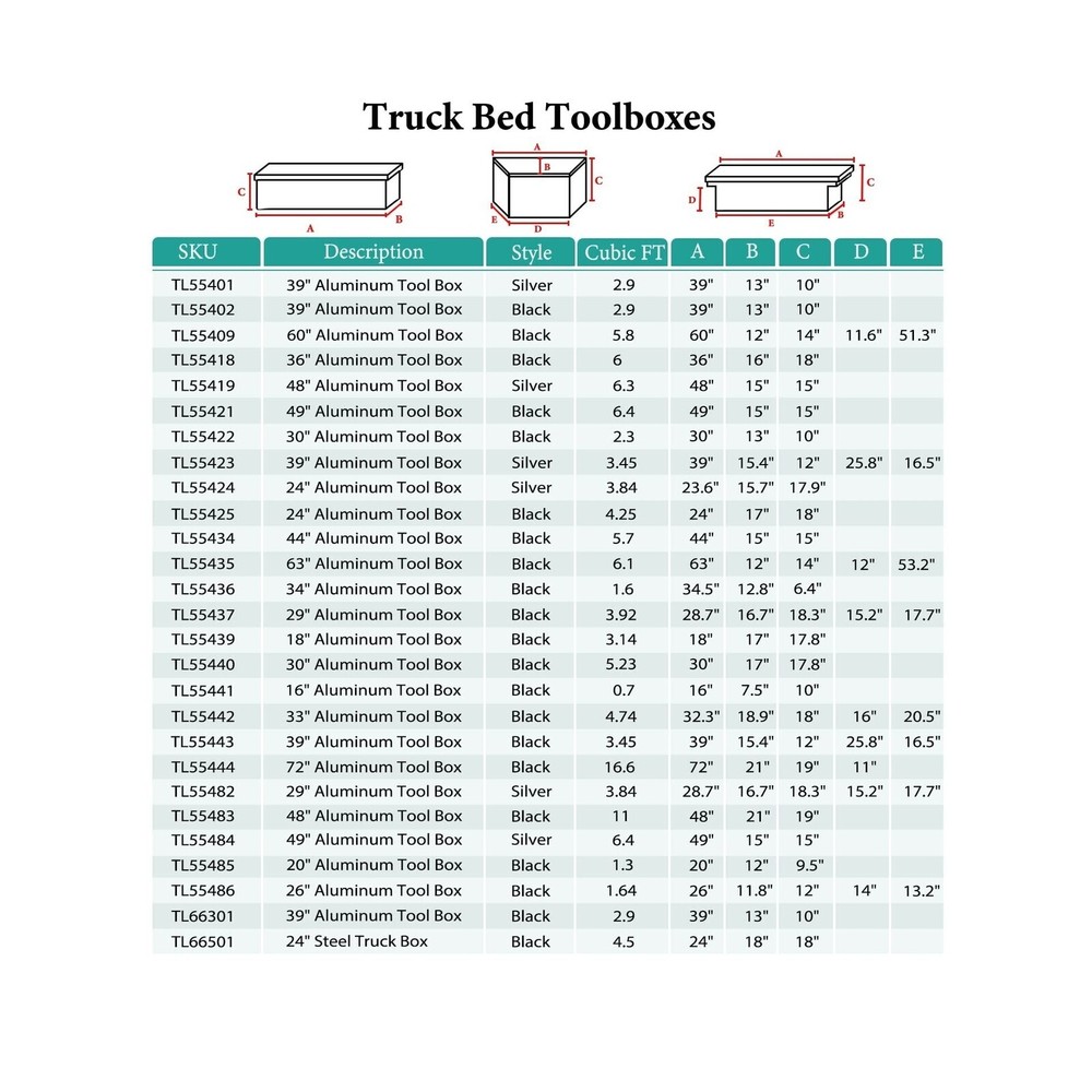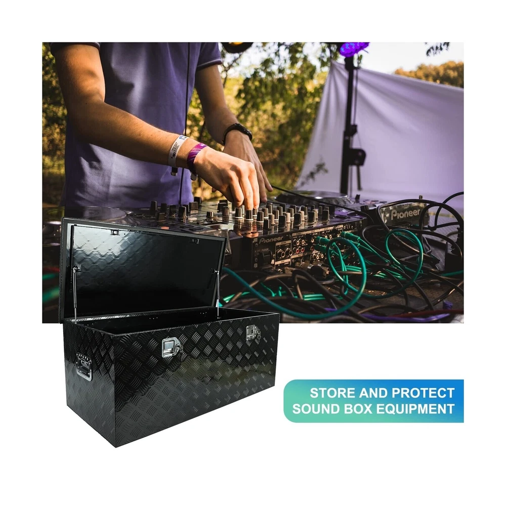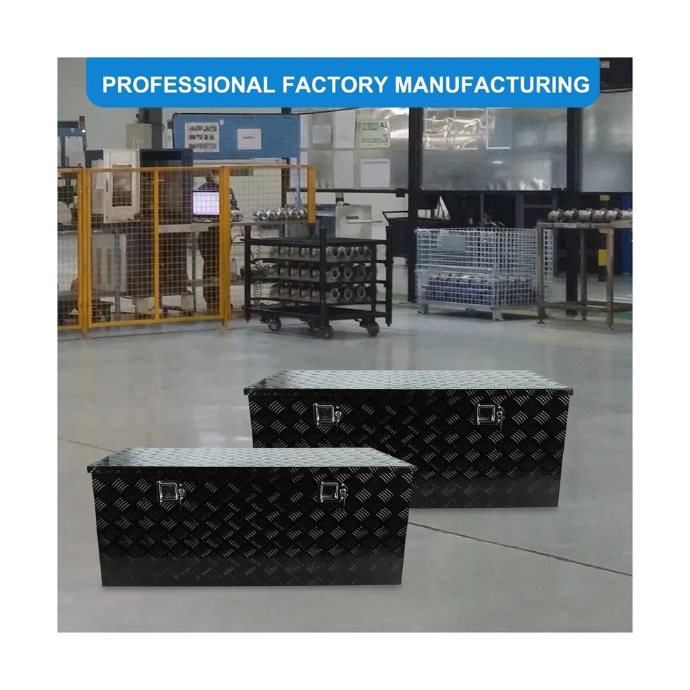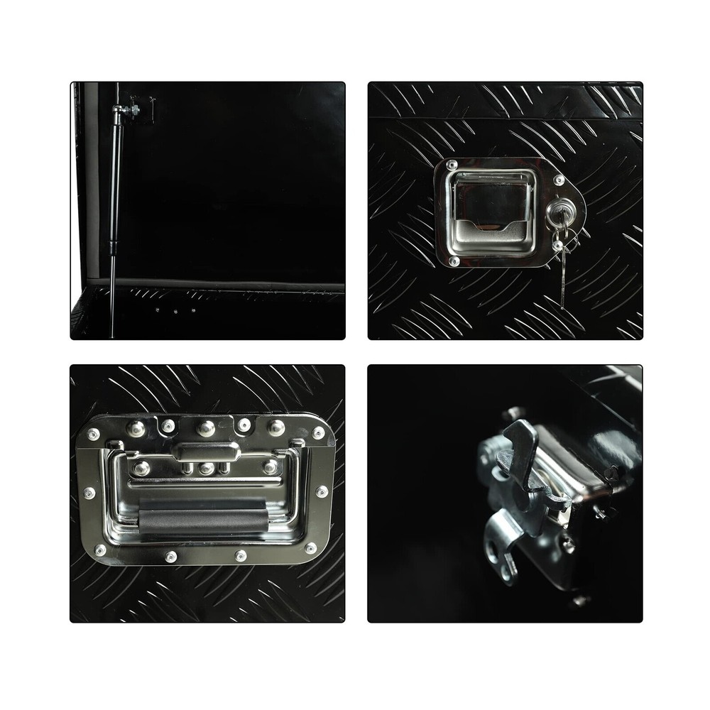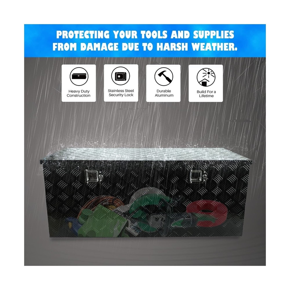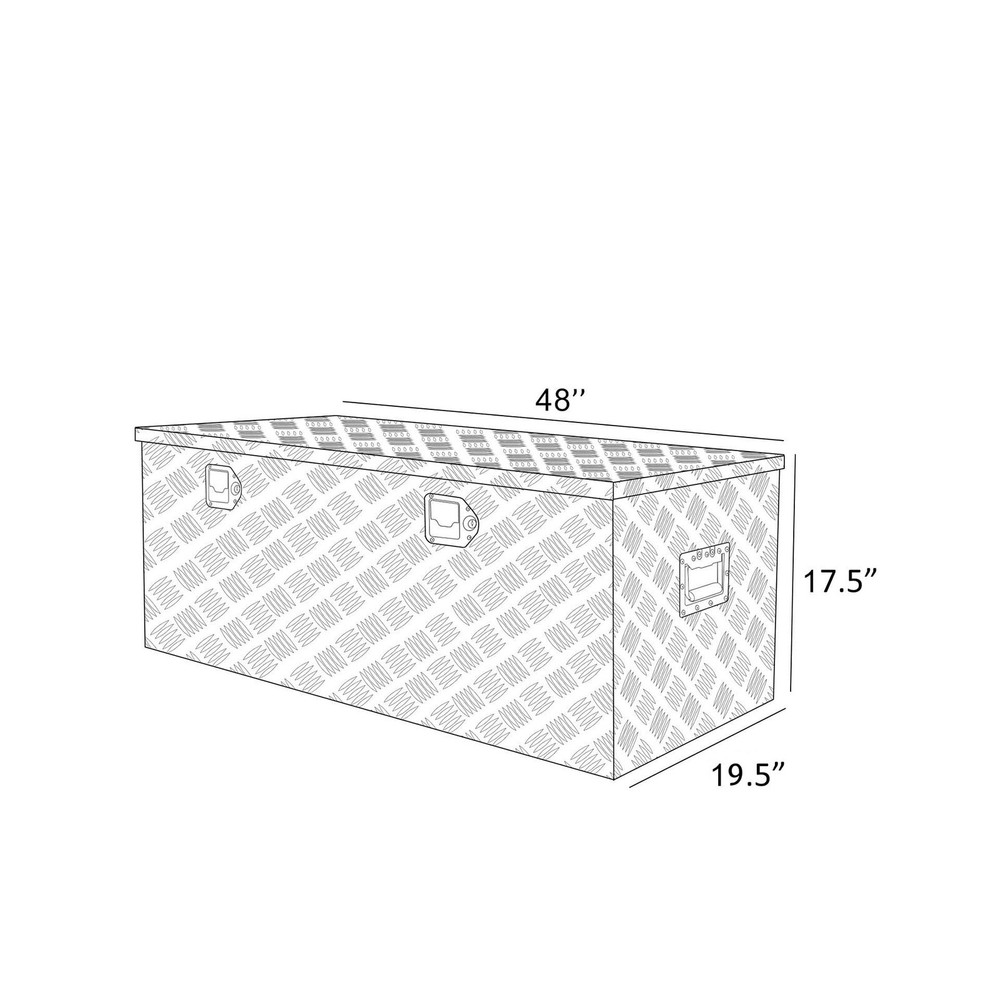 Aluminum Stripes Plated Truck Tool Box Pick Up Truck Bed RV Trailer Toolbox Storage Organizer with Side Handles, Lock and Keys - 48" x 19.5" x 17.5",Black Description Features: Overall Size:48"(L) x 19.5"(W) x 17.5"(H) ;Please choose the appropriate size according to your own use Stainless steel security lock keeps your contents secure. Comes with keys and side handles that provide an easy grip.Durable aluminum construction with a diamond tread pattern and polished finish resists corrosion and offers several years of long-lasting use. Hand welded seams provide extra strength and durability. Fold up doors provide full access to all contents within the box, making this tool box easy and convenient to use at job sites or camp grounds.Doors feature a tight seal that prevents moisture or water from seeping in, protecting your tools and supplies from damage due to harsh weather. Perfect Tool Cabinet for Anywhere: This tool box can be mounted on a hitch rack, cargo rack of your camper, perfect for the tongue of your enclosed trailer, suitable to be installed on the rear of your RV for extra storage.Widely used: From snow and ice equipment to toolboxes, hydraulics, towing, truck , trailer hardware and Stage sound box storage It can be installed on the truck in your own way, which can increase storage space and prevent theft. Product Details: Brand: Eivojor Material: Aluminum Color: Black Product Dimensions: 48"L x 19.5"W x 17.5"H Water Resistance Level: Water Resistant Brand: Eivojor Material: Aluminum Color: Black Product Dimensions: 48"L x 19.5"W x 17.5"H Water Resistance Level: Water Resistant Number of Compartments: 1 Capacity: 11 Cubic Feet Manufacturer: Eivojor Item Weight: 40.7 pounds Country of Origin: China Manufacturer Part Number: TL55483 Special Features: Waterproof, Lockable, Impact Resistance Date First Available: September 16, 2022 Delivery We Do Not Ship Outside of the Continental US. Return Policy All items qualify for returns within 30 days of receipt. Buyer is responsible for return shipping on any item that is not damaged. Feedback We take our reputation seriously, we buy and sell online, so we understand the value of trust. If you are unsatisfied with your order, please contact us and we will work with you to resolve it to your satisfaction.