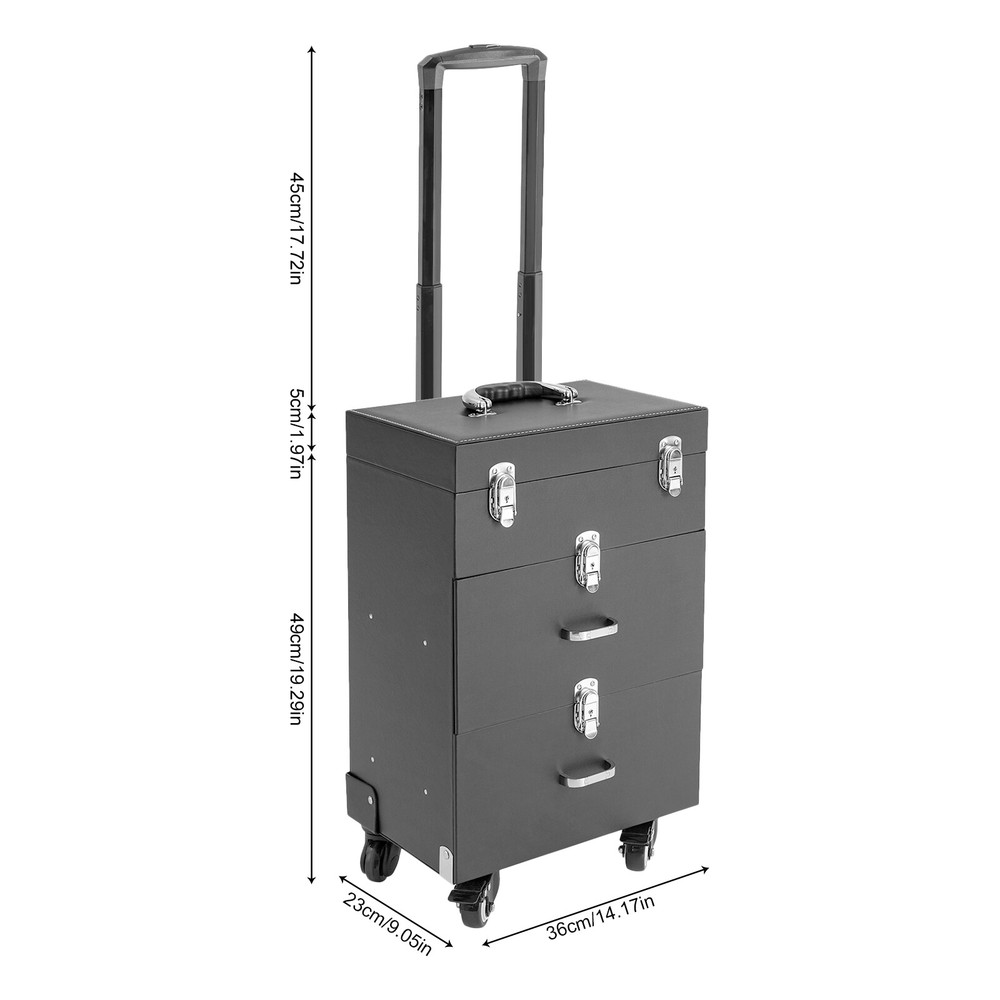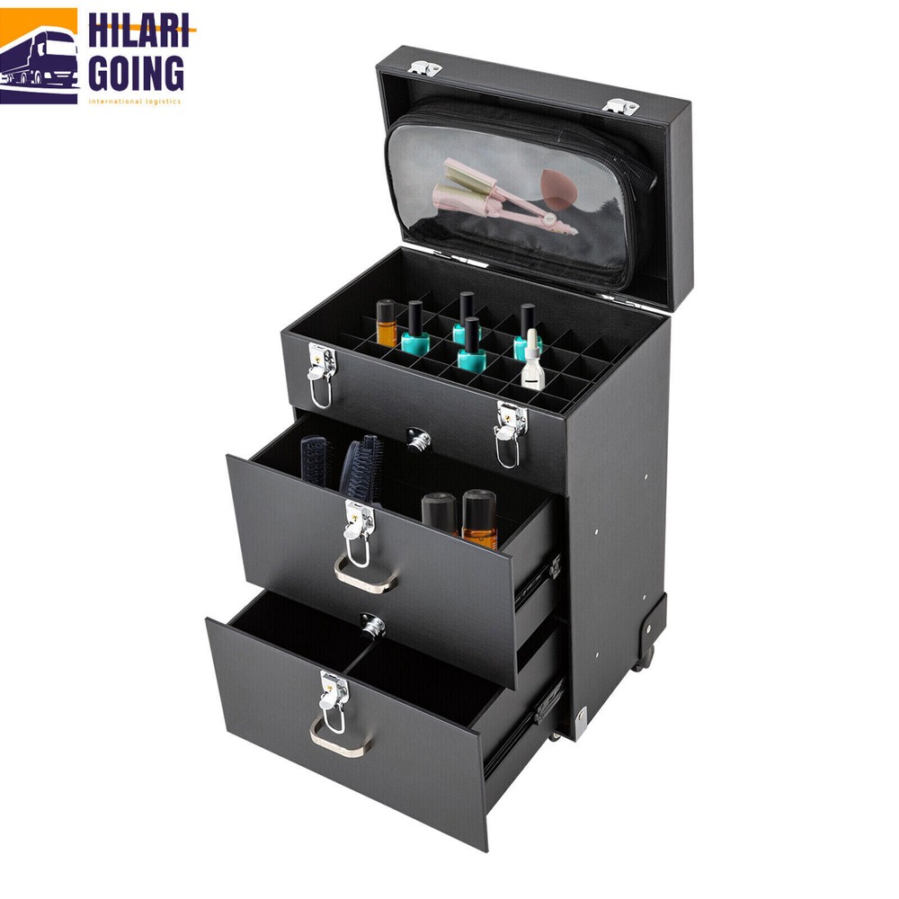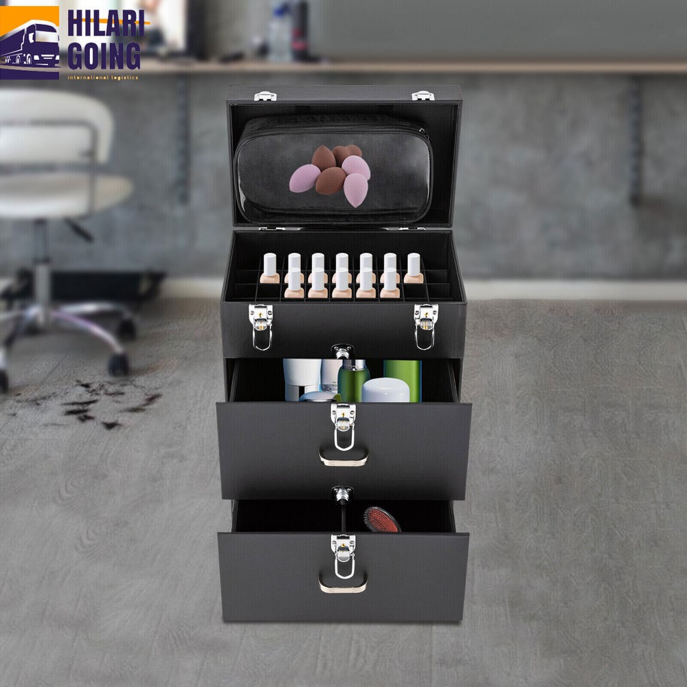 Rolling Makeup Train Case Aluminum Salon Cosmetic Trolley Organizer Box+Drawer Description This is a rolling makeup train case designed for professional beauty artists to make up anytime and anywhere. It is constructed of high-quality PU, wood, PVC , and aluminum alloy that is sturdy and durable. It has extra large capacity compartments and multi-layer drawers. This case is ideal for all people who love beauty or nail art. Key Features High-quality Material: This product is made of high-qualit y PU, wood, PVC, and aluminum alloy, with c orrosion resistance , wear resistance , and not easy to fade. Categorized Storage: Three compartments and a removable grid tray allow you to organize beauty products of different functions and sizes and make it easy to find the tools you want quickly . High Privacy: Four locking cylinders securely protect your valuables inside the box and maximize your privacy. Large Capacity: One 3.54in high tray and two 6.69 high trays can store a variety of cosmetics and beauty appliances, such as perms, nail machines and light therapy supplies, its ample storage space will be able to meet your multiple storage needs. Outstanding Load Capacity: The rectangular structure gives it an excellent load capacity (up to 99 lbs). You can put all your beauty tools in it with confidence. Easy to Move and Carry: The easy-to-move silent universal wheels (two of them can be fixed), three-position telescopic trolley rod, and a top handle make it more convenient to carry on the go, especially suitable for nail technicians and cosmetologists who have a lot of tools and need to be on the go frequently. Stylish Appearance: Its simple structure and black color give people a fashionable and elegant feeling. Such a vintage makeup case can nicely decorate your dressing room and make a good impression when you go out to work. Protective Shipping: To prevent the product from being damaged during transportation as much as possible, this product uses a rigid cardboard box, plastic bag, and foam that can effectively resist normal compression and drops. Details Clear Storage Bag: The clear storage bag on the inside of the lid allows for wet and dry storage and avoids cross-contamination. In addition, the double zipper design not only makes it easier to open and close, but also gives it a better seal. Corner Reinforcement: The bottom corner reinforcement design makes the box structure more stable, thus providing you with more excellent quality assurance. Smooth Tracks: Smooth drawer tracks make the drawing smoother and less noisy. Ergonomic Handles: The top handle has an ergonomic four-finger structure and a slow rebound damping design, making it more comfortable to hold and less likely to break. In addition, two drawer handles make it easy to pull out the drawer. Application This rolling makeup train case is suitable for professional make-up artists, hairdressers, nail technicians, and beauticians in beauty centers, salons, private homes, parties, and other occasions. Specification Material: PU, Wood, PVC, Aluminum Alloy Color: Black Shape: Rectangular Assembly Required: No Opening Method: Latch Carrying Parts: Retractable Handle Rolling Wheel Style: Universal Wheel Number of Trays: 3 Maximum Load: 45kg/99lbs Gross Weight: 9.2kg/ 20.28 lbs Net Weight: 8kg/ 17.64 lbs Package Size: 42*34*64 cm/ 16.54* 13.39*25.2 in Footprint: 36*23cm/14.17*9.05in Top Cover Height from Ground: 49cm/19.29in Top Cover Size: 29*23*5cm/11.4*9.05*1.97in Telescopic Rod Extension Height from Case: 45cm/17.72in First Tier Height: 9cm/3.54in Second Tier Height: 17cm/6.69in Third Tier Height: 17cm/6.69in Package Included 1 * Rolling Makeup Train Case 2 * Keys Notes It's normal for the tie rod to wobble a little bit as it needs clearance to move back and forth better. If it is too tight, it will harm the tie rod instead. Please make sure you don't mind before purchasing. Please allow the slight color difference caused by the shooting light and the 1-3 cm error due to manual measurement, and make sure you do not mind before ordering. Payment Delivery details Terms of sales About us Contact us Payment We accept ebay payment 。 Fees such as import duties, taxes are not included in the item price or shipping costs. These charges are the buyer's responsibility. Delivery details Shipping: 2-9 working days to: USA Terms of sales We maintain high standards of excellence and strive for hundred percent customer satisfaction. Feedback is very important to us. We hope that you contact us immediately before you give neutral or negative feedback, so that we can address your concerns. It is impossible to address issues if we do not know about them! About us Your satis faction is our ultimate goal. We work hard to earn your trust and future business. Our certified technicians have tested each item before shipping. The unit comes with 1 year limited warranty on all manufacturing defects. a) If you receive a defective item, you may return it or ask for a discount. Please contact us within 14 days after you receive the package. b) What you returned must be intact and in its original packaging as re? u. Customer is responsible for shipping costs of the returned item. c) We will cover the cost of shipping back t with the shipping rate indicated in the registration page. We will send you a new unit or refund the full payment you paid. Thank you. Contact us Business Hour Business Hour: Monday To Friday: 8:30 AM to 5:00 PM (Beijing China time) Due to time zones, our reply to your questions may not be immediately. But within above working time, we will reply your email within 24 hours. If it's non-workdays, please kindly be patient and wait till Monday. Please contact us with ebay message. Please feel free to contact us if you have any questions. Monday To Friday: 8:30 AM to 5:00 PM (Beijing China time) Due to time zones, our reply to your questions may not be immediately. But within above working time, we will reply your email within 24 hours. If it'
