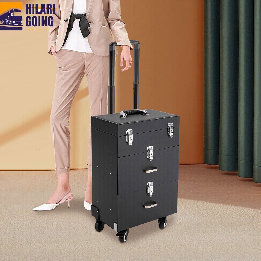 Rolling Makeup Train Case Aluminum Salon Cosmetic Trolley Organizer Box+Drawer Description This is a rolling makeup train case designed for professional beauty artists to make up anytime and anywhere. It is constructed of high-quality PU, wood, PVC , and aluminum alloy that is sturdy and durable. It has extra large capacity compartments and multi-layer drawers. This case is ideal for all people who love beauty or nail art. Key Features High-quality Material: This product is made of high-qualit y PU, wood, PVC, and aluminum alloy, with c orrosion resistance , wear resistance , and not easy to fade. Categorized Storage: Three compartments and a removable grid tray allow you to organize beauty products of different functions and sizes and make it easy to find the tools you want quickly . High Privacy: Four locking cylinders securely protect your valuables inside the box and maximize your privacy. Large Capacity: One 3.54in high tray and two 6.69 high trays can store a variety of cosmetics and beauty appliances, such as perms, nail machines and light therapy supplies, its ample storage space will be able to meet your multiple storage needs. Outstanding Load Capacity: The rectangular structure gives it an excellent load capacity (up to 99 lbs). You can put all your beauty tools in it with confidence. Easy to Move and Carry: The easy-to-move silent universal wheels (two of them can be fixed), three-position telescopic trolley rod, and a top handle make it more convenient to carry on the go, especially suitable for nail technicians and cosmetologists who have a lot of tools and need to be on the go frequently. Stylish Appearance: Its simple structure and black color give people a fashionable and elegant feeling. Such a vintage makeup case can nicely decorate your dressing room and make a good impression when you go out to work. Protective Shipping: To prevent the product from being damaged during transportation as much as possible, this product uses a rigid cardboard box, plastic bag, and foam that can effectively resist normal compression and drops. Details Clear Storage Bag: The clear storage bag on the inside of the lid allows for wet and dry storage and avoids cross-contamination. In addition, the double zipper design not only makes it easier to open and close, but also gives it a better seal. Corner Reinforcement: The bottom corner reinforcement design makes the box structure more stable, thus providing you with more excellent quality assurance. Smooth Tracks: Smooth drawer tracks make the drawing smoother and less noisy. Ergonomic Handles: The top handle has an ergonomic four-finger structure and a slow rebound damping design, making it more comfortable to hold and less likely to break. In addition, two drawer handles make it easy to pull out the drawer. Application This rolling makeup train case is suitable for professional make-up artists, hairdressers, nail technicians, and beauticians in beauty centers, salons, private homes, parties, and other occasions. Specification Material: PU, Wood, PVC, Aluminum Alloy Color: Black Shape: Rectangular Assembly Required: No Opening Method: Latch Carrying Parts: Retractable Handle Rolling Wheel Style: Universal Wheel Number of Trays: 3 Maximum Load: 45kg/99lbs Gross Weight: 9.2kg/ 20.28 lbs Net Weight: 8kg/ 17.64 lbs Package Size: 42*34*64 cm/ 16.54* 13.39*25.2 in Footprint: 36*23cm/14.17*9.05in Top Cover Height from Ground: 49cm/19.29in Top Cover Size: 29*23*5cm/11.4*9.05*1.97in Telescopic Rod Extension Height from Case: 45cm/17.72in First Tier Height: 9cm/3.54in Second Tier Height: 17cm/6.69in Third Tier Height: 17cm/6.69in Package Included 1 * Rolling Makeup Train Case 2 * Keys Notes It's normal for the tie rod to wobble a little bit as it needs clearance to move back and forth better. If it is too tight, it will harm the tie rod instead. Please make sure you don't mind before purchasing. Please allow the slight color difference caused by the shooting light and the 1-3 cm error due to manual measurement, and make sure you do not mind before ordering. Payment Delivery details Terms of sales About us Contact us Payment We accept ebay payment 。 Fees such as import duties, taxes are not included in the item price or shipping costs. These charges are the buyer's responsibility. Delivery details Shipping: 2-9 working days to: USA Terms of sales We maintain high standards of excellence and strive for hundred percent customer satisfaction. Feedback is very important to us. We hope that you contact us immediately before you give neutral or negative feedback, so that we can address your concerns. It is impossible to address issues if we do not know about them! About us Your satis faction is our ultimate goal. We work hard to earn your trust and future business. Our certified technicians have tested each item before shipping. The unit comes with 1 year limited warranty on all manufacturing defects. a) If you receive a defective item, you may return it or ask for a discount. Please contact us within 14 days after you receive the package. b) What you returned must be intact and in its original packaging as re? u. Customer is responsible for shipping costs of the returned item. c) We will cover the cost of shipping back t with the shipping rate indicated in the registration page. We will send you a new unit or refund the full payment you paid. Thank you. Contact us Business Hour Business Hour: Monday To Friday: 8:30 AM to 5:00 PM (Beijing China time) Due to time zones, our reply to your questions may not be immediately. But within above working time, we will reply your email within 24 hours. If it's non-workdays, please kindly be patient and wait till Monday. Please contact us with ebay message. Please feel free to contact us if you have any questions. Monday To Friday: 8:30 AM to 5:00 PM (Beijing China time) Due to time zones, our reply to your questions may not be immediately. But within above working time, we will reply your email within 24 hours. If it'