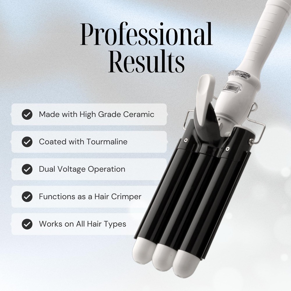 Alure Three Barrel Curling Iron Wand with LCD 1 inch, Zblack/White Product Details WORKS ON ALL HAIR TYPES: Whether you have short or long locks; thick or thin, this three barrel curling iron works like a charm. The heated ceramic produces negatively charged ions that create soft, shiny waves without any frizz. And unlike single barrel styling irons that take ages to curl hair, this 3 barrel curling iron does it in a matter of minutes.