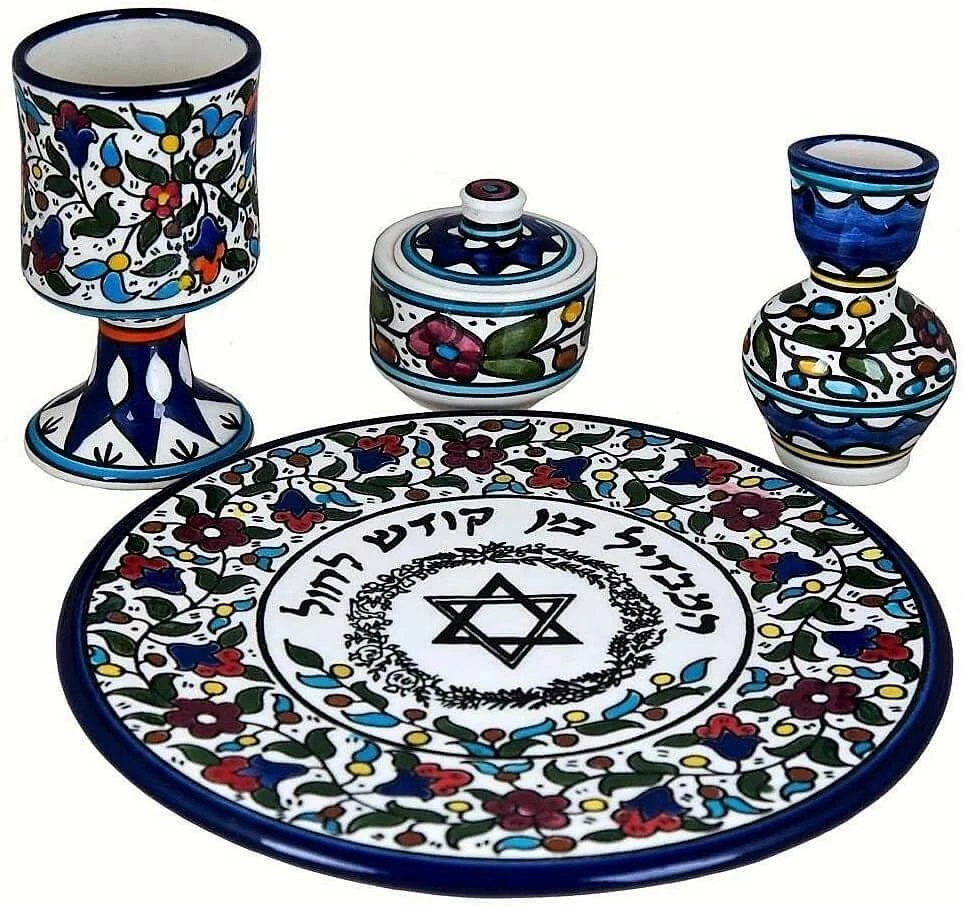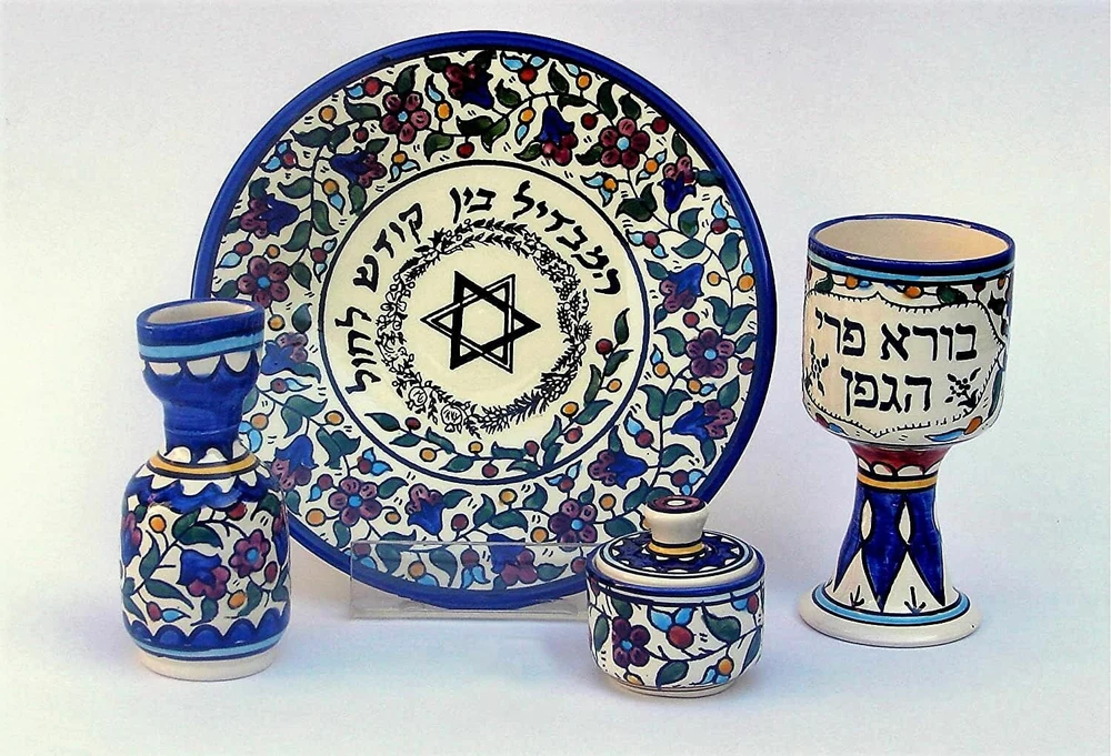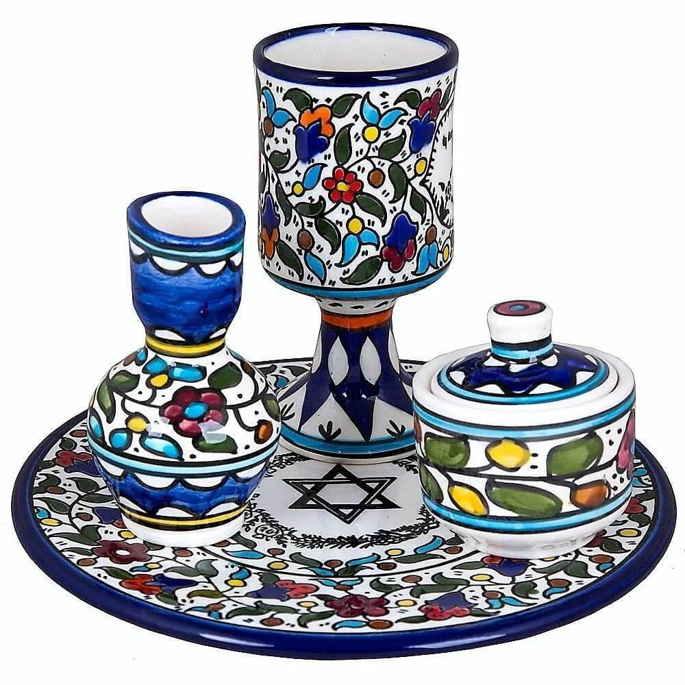 Amaizing Armenian Ceramic Havdalah Set Multi Colored Shabbat Judaica Gift Armenian Ceramic Havdalah Set with Four Pieces Shabbat Jewish 4 piece ceramic Havdalah set. Includes plate, Kiddush cup, candle holder and Bessomim dish. Kiddush cup features the inscription 'Bore Pri Hagefen'. Plate features a Havdalah blessing. Hand made and hand painted ceramic. Available in various styles. A unique, hand painted and glazed Havdalah set that will stay in your family for years. This beautiful ceramic design, brought to Israel by Armenian master craftsmen, has become one of the country's most distinctive styles. Set includes: Plate - Diameter: 21cm Kiddush Cup - Height: 17cm, Diameter: 8cm Candle Holder - Height: 13cm Bessomim Dish - Height: 6.5cm, Diameter: 6cm ARMENIAN HAVDALAH SET SKU: AR-771 Each individual item is hand made, fired, then hand painted using metallic and oxidised paint in order to keep its natural colour. It is then finished with a fine glaze that gives it its attractive appearance before being re-fired to harden the glaze. Easy to clean. Suitable for dishwashers.