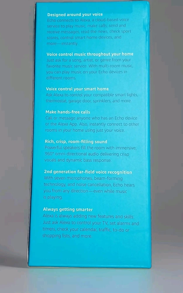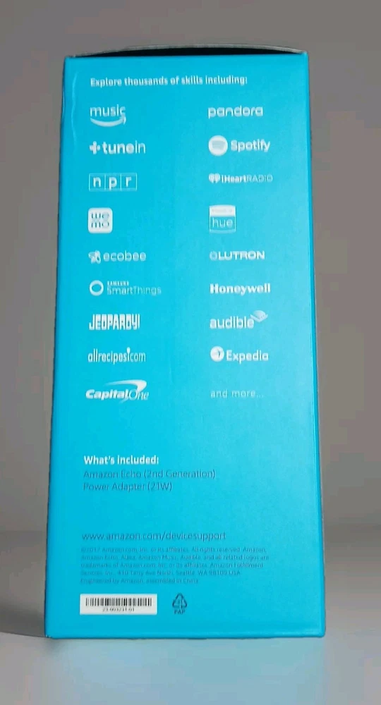 The Amazon Echo (2nd Generation) Smart Assistant in Charcoal Fabric is a Bluetooth-enabled smart speaker with Wi-Fi connectivity. It features music streaming, alarm clock function, internet radio, and voice control through Alexa. Compatible with Android and Amazon devices, it is ideal for smart home integration with Pandora and Spotify support. Made of fabric, this model was manufactured in 2017.