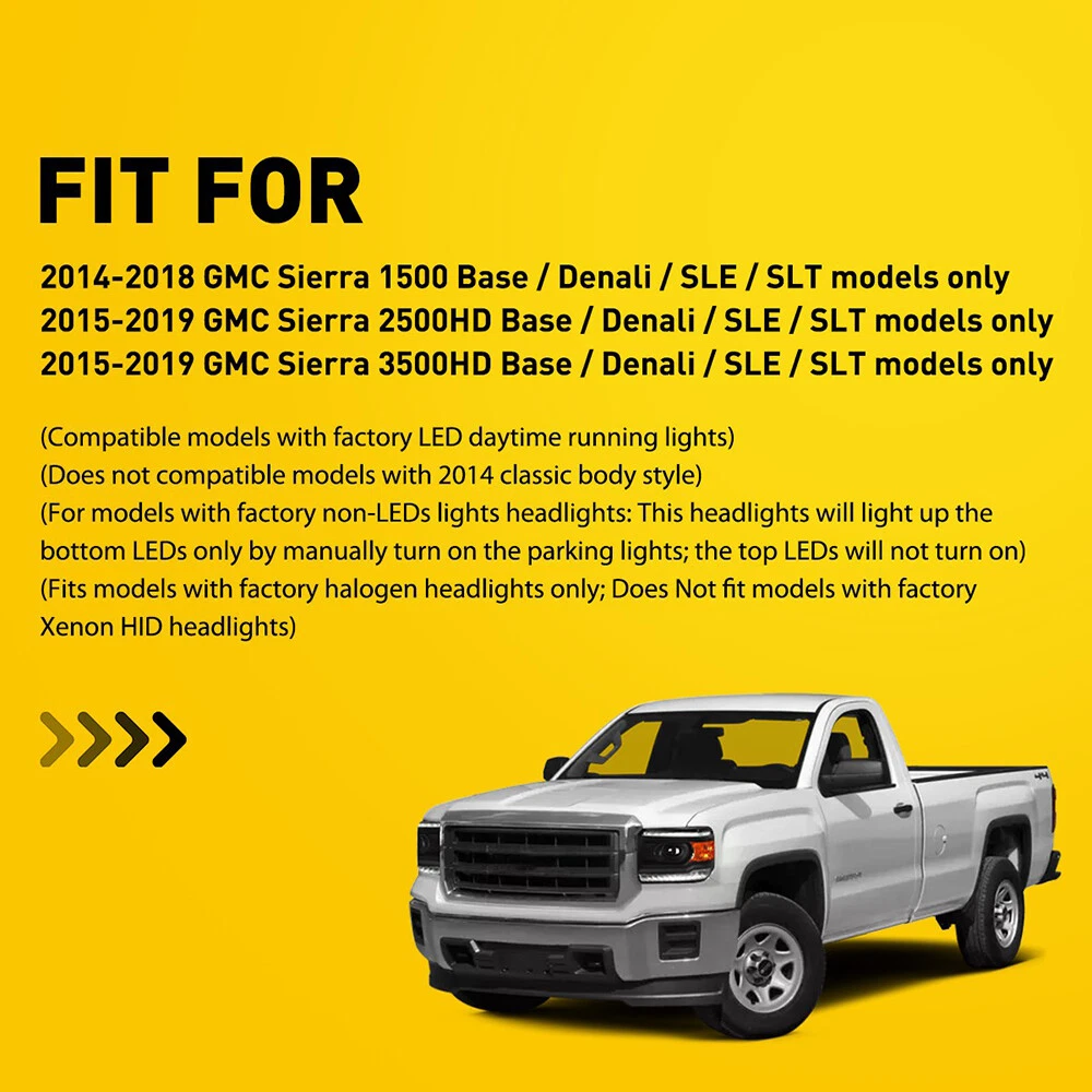 Fit for: 2014-2018 GMC Sierra 1500 Base / Denali / SLE / SLT models only 2015-2019 GMC Sierra 2500HD Base / Denali / SLE / SLT models only 2015-2019 GMC Sierra 3500HD Base / Denali / SLE / SLT models only (Compatible models with factory LED daytime running lights) (Does not compatible models with 2014 classic body style) (For models with factory non-LEDs lights headlights: This headlights will light up the bottom LEDs only by manually turn on the parkinglights; the top LEDs will not turn on) (Fits models with factory halogen headlights only; Does Not fit models with factory Xenon HID headlights) Specifications: OE number: GM2502390, GM2503390, GM2502394, GM2503394 Amber Headlight Corner W/ Projector DRL For 15-19 GMC Sierra 2500HD 3500HD EOOH Fit for: 2014-2018 GMC Sierra 1500 Base / Denali / SLE / SLT models only 2015-2019 GMC Sierra 2500HD Base / Denali / SLE / SLT models only 2015-2019 GMC Sierra 3500HD Base / Denali / SLE / SLT models only (Compatible models with factory LED daytime running lights) (Does not compatible models with 2014 classic body style) (For models with factory non-LEDs lights headlights: This headlights will light up the bottom LEDs only by manually turn on the parkinglights; the top LEDs will not turn on) (Fits models with factory halogen headlights only; Does Not fit models with factory Xenon HID headlights) Specifications: OE number: GM2502390, GM2503390, GM2502394, GM2503394 23130715, 23130716, 23130717, 23130718 Material: ABS+PC (ABS Plastic Housing/Polycarbonate lens) Appearance color: 1.Housing Color:Black 2.Lens Color:Clear 3.Reflector Color:Amber Note: Projector √ ???Include???/span> DRL √ (Not Include) Bulb × ( Not include) Features: *Easy to install: Direct replacement, drilling and cutting are not required. *Superior quality: Made of ABS and PC materials with toughness and heat resistance functions to ensure its long service life and durability. *Angle adjustment: Equipped with a headlamp Angle adjustment knob, you can adjust the best Angle of view through the knob. *Suggestion: 1.Please confirm the OE number before purchasing!!! 2.Professional installation is required!!! Packaging include: Headlights*2(Left+Right) Item Specifics Brand AUXITO Number of Bulbs No Bulbs Included Type Headlight Assembly Features w/ Projector, DRL, Direct Fit, Easy Installation Placement on Vehicle Front, Left, Right OE/OEM Part Number GM2502390, GM2503390, GM2502394, GM2503394 Manufacturer Warranty 2 Years Material ABS Plastic Housing & Polycarbonate Lens Tips Professional installation is required Housing Color Black Lens Color Clear Reflector Housing Color Amber Interchange Part Number GM2502390, GM2503390, GM2502394, 23130715, 23130716 Universal Fitment No Number of Pieces 2 Fitment Type Direct Replacement Fitment 1 For 2014-2018 GMC Sierra 1500 Base / Denali / SLE / SLT Fitment 2 For 2015-2019 GMC Sierra 2500HD Base / Denali / SLE / SLT Fitment 3 For 2015-2019 GMC Sierra 3500HD Base / Denali / SLE / SLT With Projector Yes With DRL Yes Payment We accept PayPal via eBay Secure Check-Out only. Immediate payment needs to be processed for items with Add to Cart option so that any promotional discounts can be applied to your order immediately. Shipping 1 .We do everything we can to ship your orders out as soon as possible. 2. Shipping and Handling: We process orders within two business day after the payment was clear. Returns Our 30-day Satisfaction Guarantee assures our customers that they will receive all orders promptly and exactly as described. In addition, it allows customers to return new and unused products in their original factory condition for any reason within 30 days from the date of purchase. 1. All returns must be pre-approved by AUXITO and have a return merchandise authorization(RMA) number. Unauthorized returns will not be accepted. 2. Buyers are responsible for appropriate packing, returning shipping cost, insurance and returning the item in "new" condition. Used items will not be accepted for return. 3. We will replace the returning item with an identical item, issue a full store credit or a full refund. Contact Us Our Working Time:(GMT+8)Monday to Friday,9:00-18:00. For inquires and customer support, please send your email via ebay email system. All emails will be responded to within 24 hours during business days. Feedbacks 1. We appreciate your business and strived to improve our customer service and our commitment to quality. 2. We will leave a positive feedback immediately after payment is received. We appreciate a positive feedback as much as you do. 3. If for some reason there is any issue with the purchase, please contact us prior to leaving feedback, and we will be glad to work with you to have it resolved. DESCRIPTION PAYMENT SHIPPING RETURN POLICY CONTACT US Hot Item Fit For 2015-2019 Hyundai Center Light Gray Sonata Armrest Console Lid Cover USD 12.34 190 PCS Bumper Fender Moulding Side Garnish Grille Retainer Clip ABS Various USD 10.44 4" Red Truck Long Performance High Flow Cold Air Intake Cone Dry Filter Cotton USD 26.59 Waterproof Motorcycle Handlebar Dual USB Phone Charger Cigarette Lighter Socket USD 13.99 146PCS For Toyota RAV4 Fender Door Hood Bumper Trim Clip Retainer Fastener Kit USD 10.92 Hot Item 190 PCS Bumper Fender Moulding Side Garnish Grille Retainer Clip ABS Various USD 10.44 Waterproof Motorcycle Handlebar Dual USB Phone Charger Cigarette Lighter Socket USD 13.99 146PCS For Toyota RAV4 Fender Door Hood Bumper Trim Clip Retainer Fastener Kit USD 10.92 4" Red Truck Long Performance High Flow Cold Air Intake Cone Dry Filter Cotton USD 26.59 Fit For 2015-2019 Hyundai Center Light Gray Sonata Armrest Console Lid Cover USD 12.34 Amber Headlight Corner W/ Projector DRL For 15-19 GMC Sierra 2500HD 3500HD EOOH Fit for: 2014-2018 GMC Sierra 1500 Base / Denali / SLE / SLT models only 2015-2019 GMC Sierra 2500HD Base / Denali / SLE / SLT models only 2015-2019 GMC Sierra 3500HD Base / Denali / SLE / SLT models only (Compatible models wi