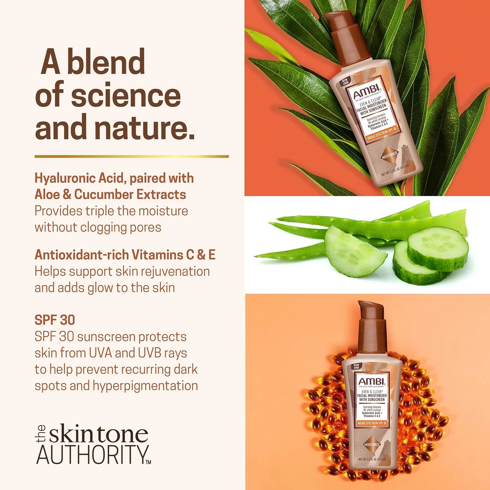 Ambi Even & Clear Daily Facial Moisturizer with SPF 30, 3.5 Ounce Daily Moisturizer with SPF 30: This moisturizer combines natural extracts, proteins, and vitamins to refine, soften and even skin tone; Organic SPF 30 formula, unlike mineral formulas, does not leave a white or ashy cast on melanin-rich skin Hydrating Formula: Featuring Hyaluronic Acid paired with Aloe and Cucumber Extracts to provide triple the moisture without clogging pores, plus antioxidant-rich Vitamins C and E to rejuvenate and add glow The Ambi Regimen: We make dermatologist-recommended products to cleanse, moisturize and nourish, help fade dark spots and discoloration, treat acne, dry skin and eczema, and other solutions for melanin-rich skin Your Skincare Journey: For smooth, even-toned, flawless looking skin try our cleansers, bar soaps, serums, moisturizers and fade creams specifically formulated for and by those with diverse skin tones The Skin Tone Authority: For 50 years, Ambi has been rooted in catering to the skincare needs of women of color, blending science and nature to create affordable, high-quality skincare products Ambi Even & Clear Nourishing Daily Facial Moisturizer combines natural extracts, proteins, and vitamins to refine, soften and help even skin tone. It is specifically formulated with Hyaluronic Acid paired with Aloe and Cucumber Extracts, which provide triple the moisture without clogging pores and antioxidant-rich Vitamins C & E, which rejuvenate and add glow to the skin. Our organic SPF 30 formula, unlike the mineral formulas; it does not leave white / ashy cast on melanin-rich skin. It statistically performs better on consumer skin protection longevity tests. Paraben-free, Phthalate-free and fragrance-free. Shipping We offer FREE shipping on all orders! We ship within Three business days of payment, usually sooner. We use a selection of shipping services such as UPS, FedEx, USPS etc. We only ship to the lower 48 states, no APO/FPO addresses or PO Boxes allowed. Local pickups and combined shipping options are not provided at this time. Return You can return a product for up to 30 days from the date you purchased it. Any product you return must be in the same condition you received it and in the original packaging. Please keep the receipt. Payment We accept payment by any of the following methods: PayPal Please pay as soon as possible after winning an auction, as that will allow us to post your item to you sooner! Feedback Customer satisfaction is very important to us. If you have any problem with your order, please contact us and we will do our best to make you satisfied. Contact Us If you have any queries, please contact us via ebay. We usually respond within 24 hours on weekdays. Please visit our eBay store to check out other items for sale! Thank you for shopping at our store.