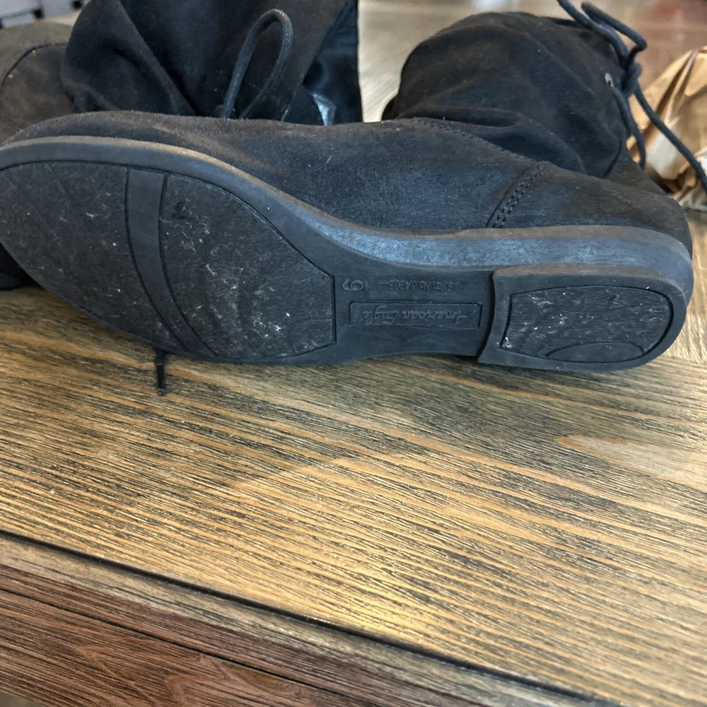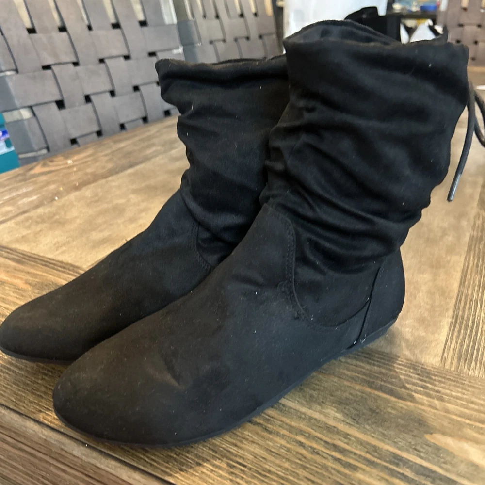 Elevate your shoe game with these stylish American Eagle Outfitters ankle booties in black suede. The almond toe and pull-on closure make them comfortable for everyday wear, while the low block heel adds a touch of sophistication for work or formal occasions. The perforated accents and cotton lining material give them a trendy yet versatile feel, perfect for any season or outfit. These booties come in a women's size 6 and are made with high-quality leather and synthetic outsole material. Whether you're going out with friends or attending a business meeting, these ankle booties are the perfect addition to your wardrobe.
