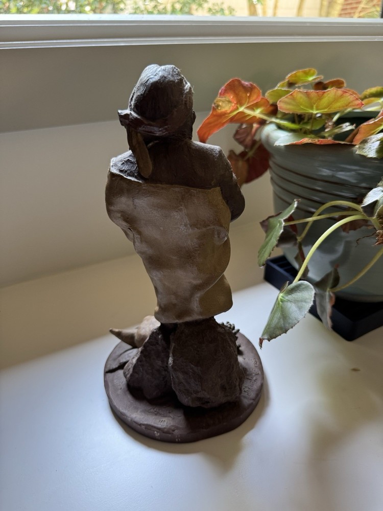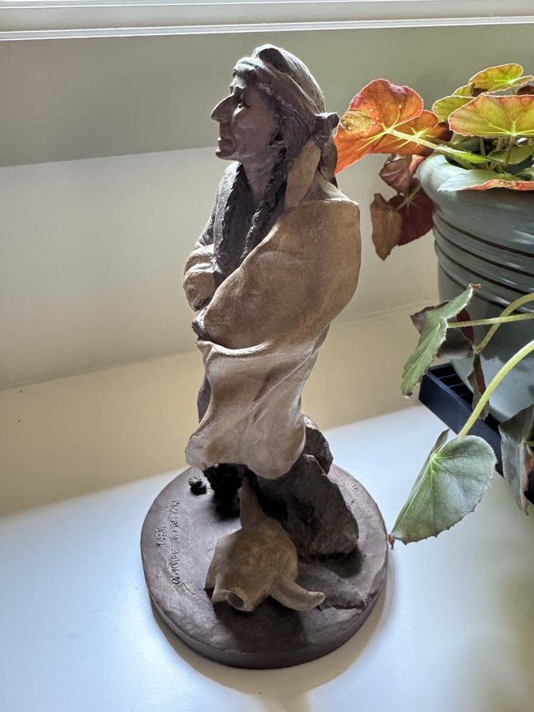 The figurine is "American Indian 1899" by Tom Clark, created in 1983. Additional details include: • Made in Davidson, North Carolina. • Inspired by a photograph of a Sioux medicine man. • The statue is part of the History Series, item #307. • Tom Clark, who passed away on January 14, 2022, is often compared to Norman Rockwell for his ability to capture warmth and feeling in his characters. • The number "1577" is inscribed on the figurine.