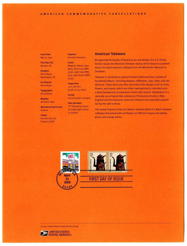 Official USPS 2002-09 American Toleware Pair Souvenir Commemorative Cancellation Page May 31, 2002, Scott #3612 FDC. The plate # coil is position 3, right, #S1111111. Shipping cost $3.00, USPS First Class. Ship this page with any other within 3 days for an additional $1.00