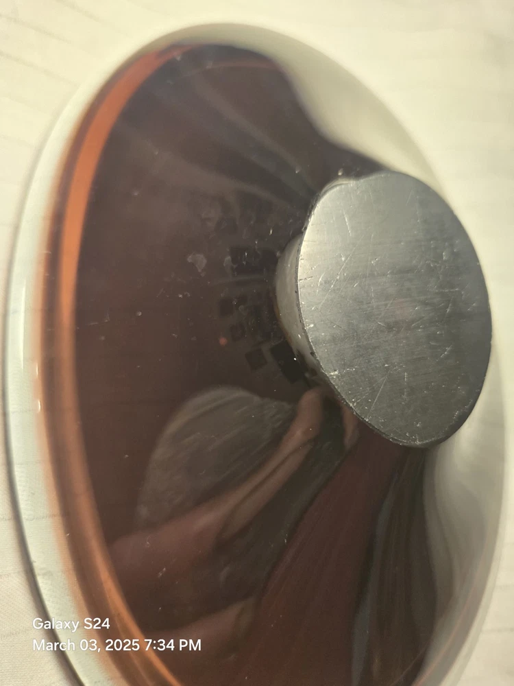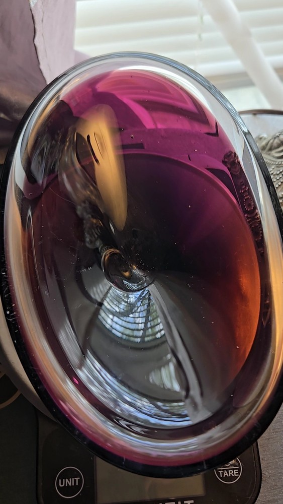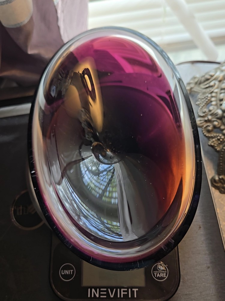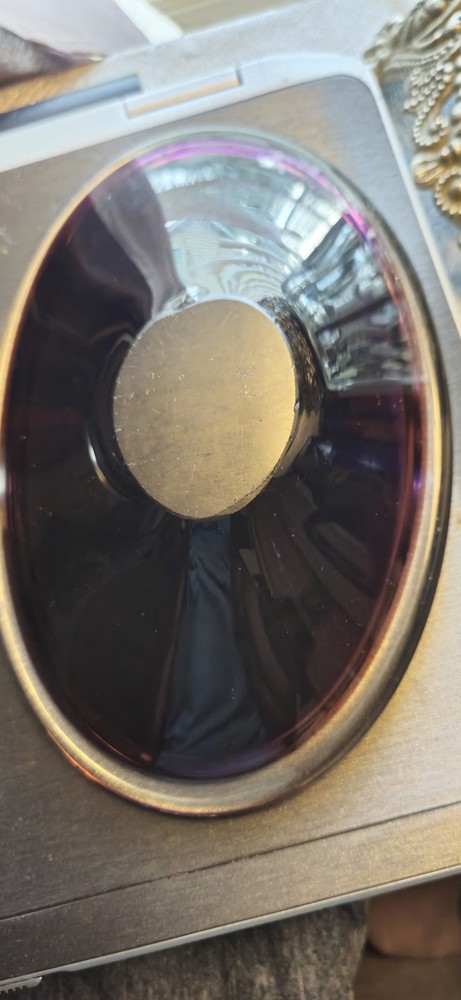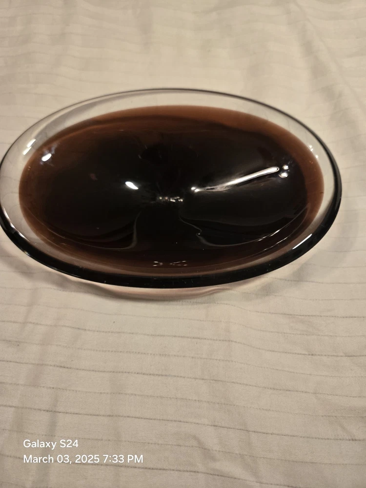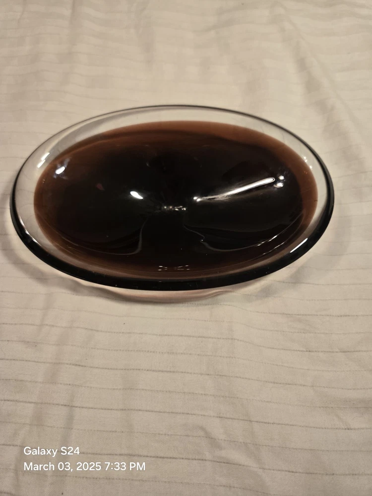 This beautiful amethyst-colored glass dish is perfect for your candy or trinkets. Measuring 7.5 inches in length and 5 inches in width with a depth of 1.5 inches, this oval-shaped dish has one compartment to keep your items organized. It is made of high-quality glass and has a smooth, shiny finish. The dish is unmarked but is of great quality. Use it as a decorative piece or to store your small items, this dish is versatile and will complement any decor. It is Amethyst in the light and in the darkness it looks brown.