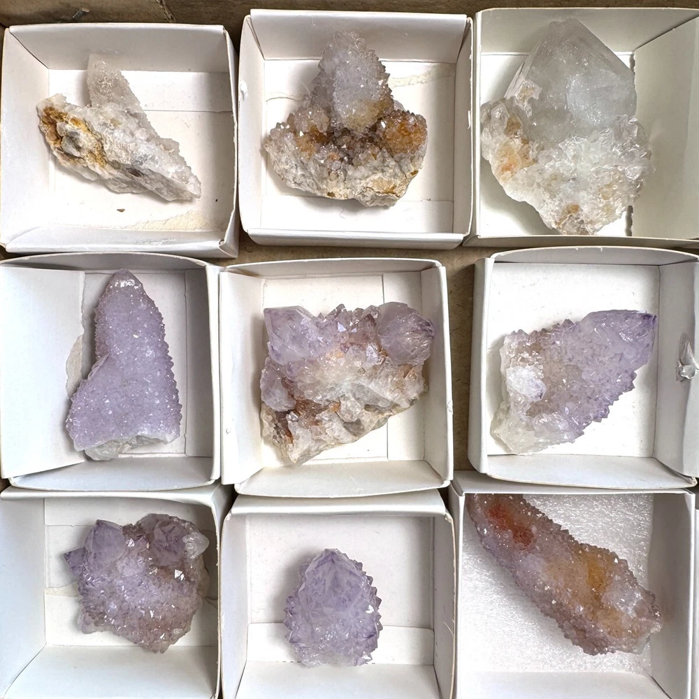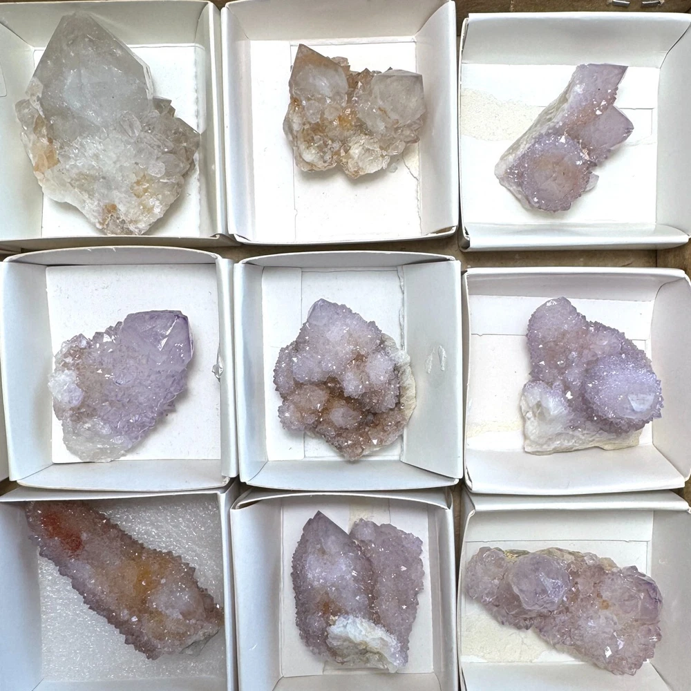 Cactus Quartz or Spirit Quartz View My Other Items For Sale Visit My eBay Store Add me to your Favorite Sellers A cactus or spirit quartz is a quartz crystal that is encrusted by a second generation of smaller crystals grown on its prism faces. These crystals were first discovered in 1986 in the Magaliesberg Mountain Range near Pretoria, South Africa. It occurs as quartz, citrine and amethyst, and comes in a wide range of colors, including purple amethyst, violet amethyst, smoky, milky clear and golden citrine. FAQ/Tips Crystals are priced by quality, color and size. Purple amethyst is more highly prized and will cost more for a smaller lesser quality crystal. Lavender is the most common color and where you will find the best quality/value for price Crystals change colors with changes in type angle and intensity of light. Color may also vary between monitors. Pictures were taken in bright natural light. We do our best to give you many views so you can judge the quality of the given crystals. If you have questions please ask before bidding or buying. Many of the crystals have special color properties: Many have phantoms, not just the ones we’ve indicated. Some have “floating” purple tips. The placement of darker purple against purple or white crystals appears to change as the crystal is turned. Many are a mixture of citrine and amethyst. The ones called “Golden Healers” or “Sunshine” have a rainbow effect on crystal faces.