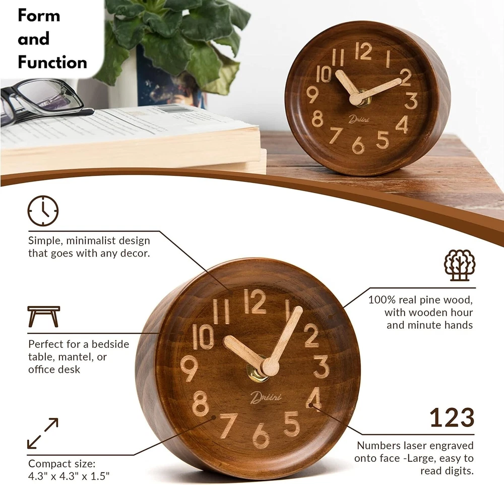 Analog Pinewood Desktop Clock - Silent Sweep Mantle Clock - Easy to Read - Brown ‹ › ‹ › ‹ › ‹ › ‹ › ‹ › ‹ › ‹ › Analog Pinewood Desktop Clock -Silent Sweep Mantle Clock -Easy to Read -Brown Features: Contemporary minimalist design Silent analog operation Laser-engraved pinewood construction 4.3 inch size fits into narrow spaces Available in 4 colors Simple setup with AA battery (not included) Quiet and smooth clock hands movement Benefits: Fits in any room or space Enhances any decor style Easy to read and operate Silent operation for peaceful environment Durable and long-lasting construction Backed by commitment to customer satisfaction Why choose our Analog Pinewood Desktop Clock? Elevate your space with our Analog Pinewood Desktop Clock, featuring a sleek design and silent operation. Made from high-quality pinewood, this clock fits seamlessly into any room or space, adding a touch of elegance to your decor. With easy setup and quiet movement, this clock is the perfect blend of style and functionality. Don't settle for ordinary clocks - choose our Analog Pinewood Desktop Clock for a unique and stylish addition to your home or office. Shipping Free & Fast Shipping - We offer free shipping to most of the USA with a normal delivery time of 3-7 days. However, due to the current situation, additional delivery time (up to 3 weeks) may be required for some items. Alternative Carriers - We may use alternative carriers (e.g. USPS, FedEx, UPS, etc.) to ensure your package arrives safely and on time. Due to the use of multiple carriers, we are unable to provide a tracking number automatically. Handling Time - Orders are processed and shipped within 1-2 business days of receiving cleared payment. Shipping Restrictions - Shipping to Alaska, Hawaii, Puerto Rico, Guam, and other US territories may incur shipping charges or delivery restrictions. Please contact us before ordering, or your order can be refunded/cancelled. State Restrictions - There may be restrictions based on your state of purchase. For example, certain items may not be shipped to California due to state regulations. Contact for Tracking Updates - If you require tracking updates or have any concerns about the delivery of your order, please feel free to contact us, and we will be happy to assist you. Return 30-Day Hassle-Free Returns - We want you to be completely satisfied with your purchase. If you are not, you can return the item within 30 days of receiving it for a full refund or exchange. Easy Return Process - To start a return, simply contact us and we will provide you with a prepaid return shipping label and detailed instructions. Restocking Fee - There are no restocking fees for returns. However, the buyer is responsible for return shipping costs if the return is not due to a seller's error. Refund Processing Time - Refunds will be processed within 5 business days of receiving the returned item in its original condition. Payment We accept all major credit cards, PayPal, and Apple Pay for your convenience. Your payment information is secure and encrypted to ensure a safe and seamless transaction. Please complete your payment within 3 days of purchase to avoid any delays in shipping. Feedback Your feedback is extremely important to us. We strive to provide the best products and customer service possible. If you are satisfied with your purchase, please take a moment to leave us a positive review. If you have any concerns or issues with your order, please contact us before leaving negative feedback. We are committed to resolving any problems and ensuring your satisfaction. Contact Us If you have any questions or concerns, please feel free to reach out to our customer support team. You can contact us through the eBay messaging system. We are available Monday to Friday, 9:00 am to 5:00 pm EST, and we will do our best to respond to your inquiry within 24 hours. Thank you for supporting our small family business!