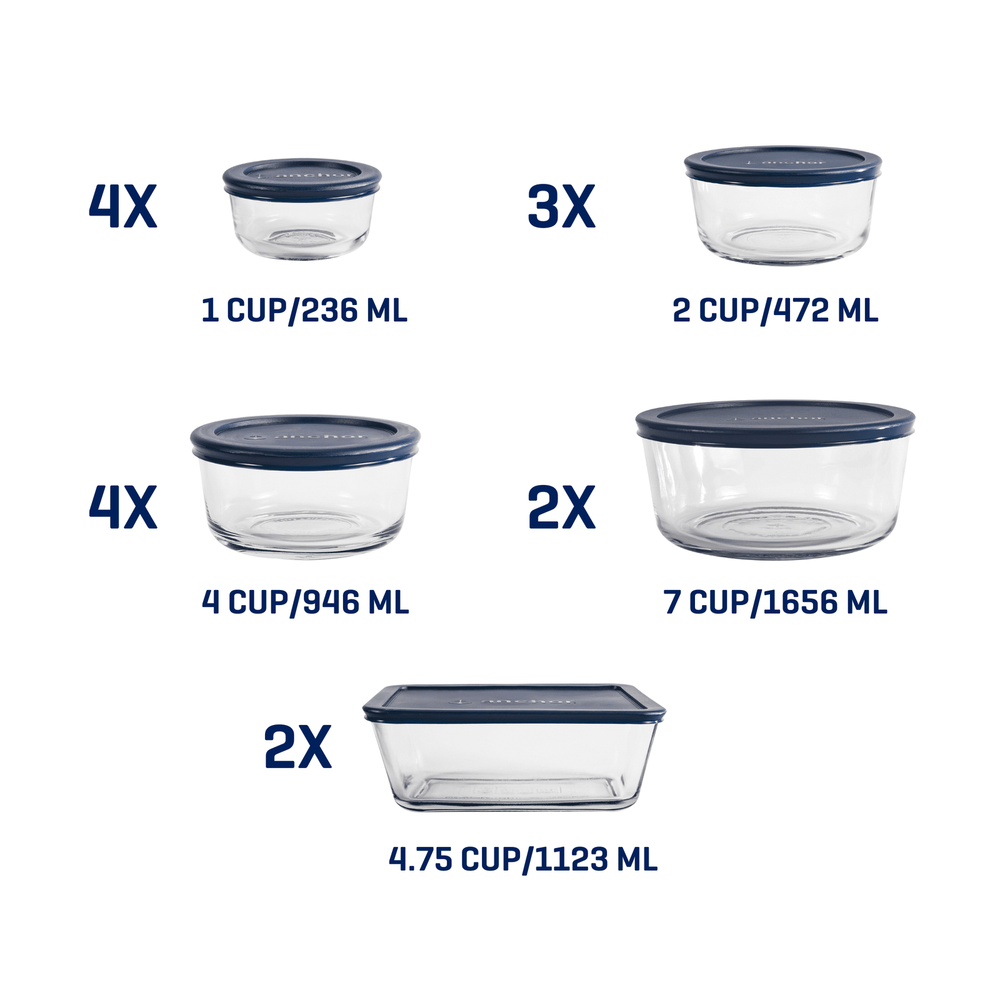 Anchor Hocking glass food storage containers with SnugFit lids are a kitchen essential. BPA-free plastic lids sit on glass containers that are extra-durable. The two pieces join together smoothly and tightly to store, transport, and reheat all manner of lunches, leftovers, and more. Glass is dishwasher (lids are top-rack safe), microwave, fridge/freezer, and oven safe up to 425°. INCLUDES: (4) 1-Cup Round, (3) 2-Cup Round, (4) 4-Cup Round, (2) 4.75- Cup Square and (2) 7-Cup Round food storage containers, (2) with (15) matching navy SnugFit lids. Unlike plastic, our glass storage doesn’t stain, warp, or retain smells. OVEN, MICROWAVE, DISHWASHER, FRIDGE/FREEZER SAFE GLASS: Our tempered-tough glass food storage set with lids is versatile but affordable. Prep, reheat, and store without worry. PROTECTS FOOD’S FLAVORS: Our glass storage containers with lids are made of pure glass that guards your food and protects its flavor. EXTRA DURABLE: These tempered-tough glass meal prep containers are built to withstand most kitchen and transport stresses. SnugFit Lids guard against most spills.
