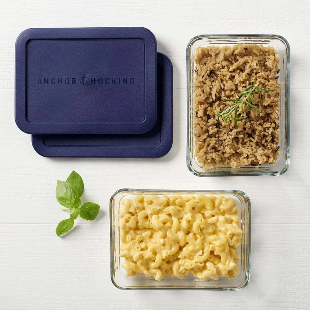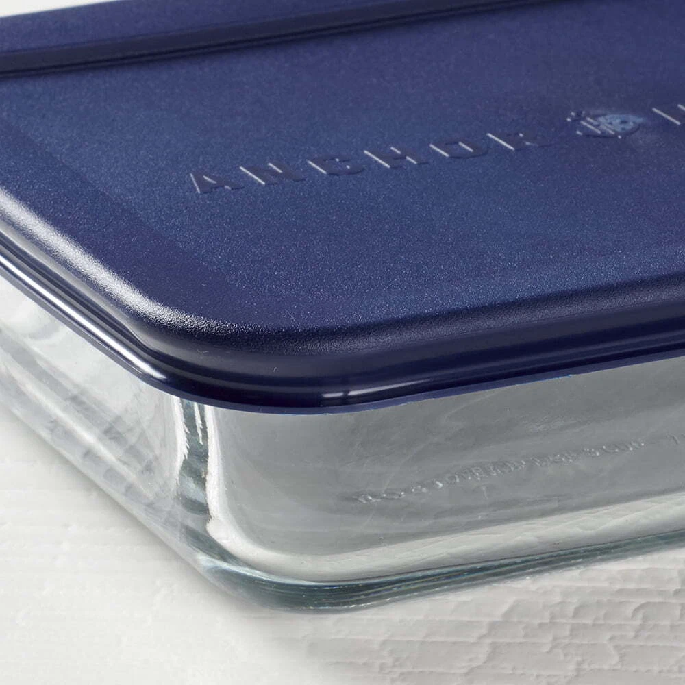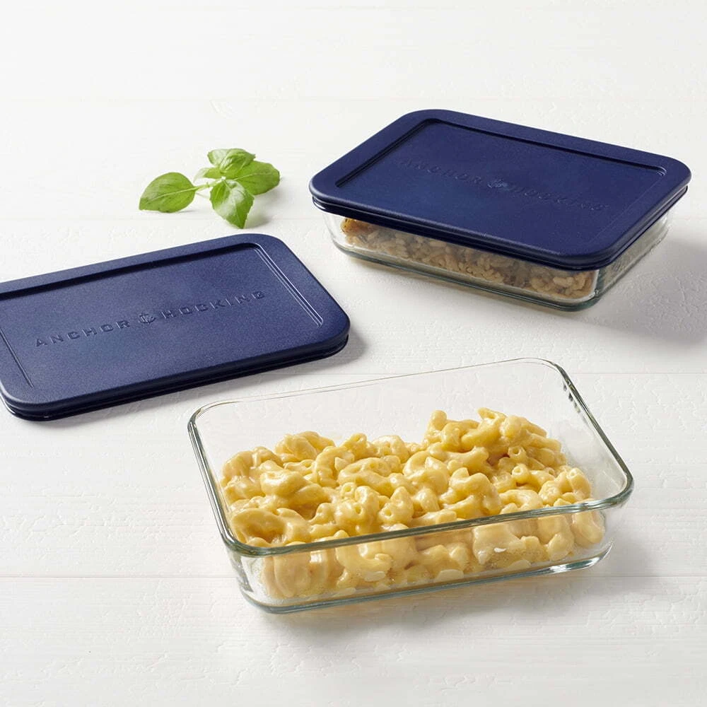 This Anchor Hocking 4pc 3 cup Rectangle Food Storage Value Pack set includes two 3 cup rectangle glass food storage vessels with quality conventional blue lids. Anchor Hocking is known for high-quality glass Tabletop and Bakeware items. Glass is microwave, pre-heated oven, refrigerator, freezer, and dishwasher safe. Plastic lids let you cover any leftovers and conveniently store them in the refrigerator. The lids allow you to take your food anywhere. Lids are BPA-free and top-rack dishwasher safe. This set is great for registries, holidays and new homeowners! Anchor Hocking 4pc- 3 cup rectangle food storage value pack Set Contains: 2- 3 cup rectangle glass food storage with blue lids Tempered Tough Glass that is Microwave, Oven, Freezer, & Dishwasher Safe Made of glass, which does not stain or absorb odors Lids are BPA Free- Free of harmful chemicals Features 5 year warranty