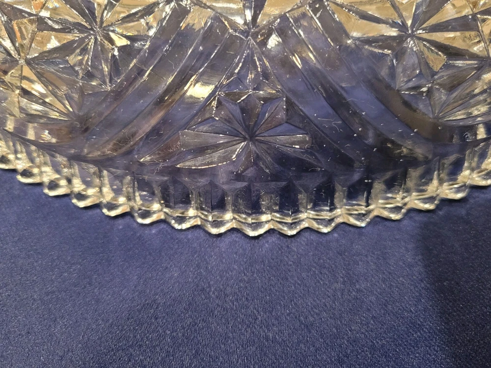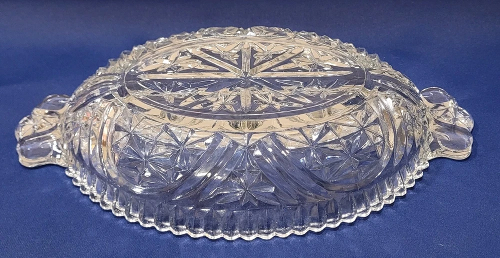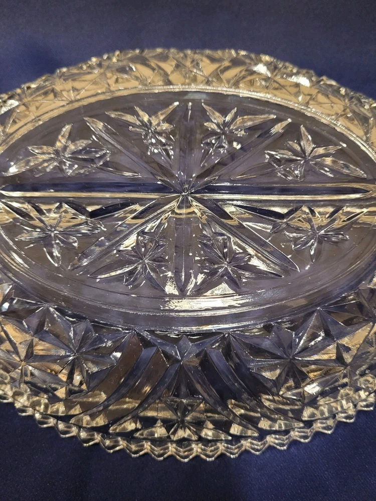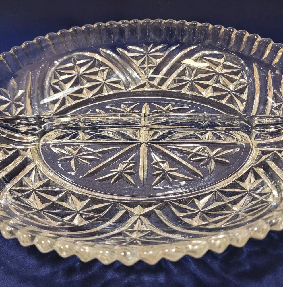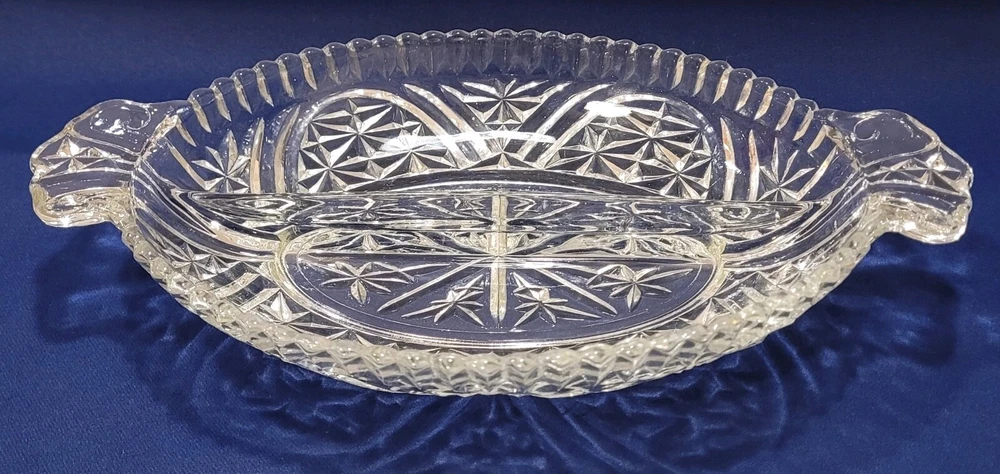 The Anchor Hocking Relish Dish is a vintage Mid-Century Modern piece from the 1960s, featuring a unique Thousand Line Stars & Bars pattern in clear pressed glass. This oval dish has two compartments, making it perfect for serving various condiments or snacks. It has handles for easy carrying and a glossy finish, adding to its charm. The item is part of the Early American Prescut/EAPC product line and was made in the United States, showcasing American craftsmanship in a classic design. It is recommended to hand wash only to preserve its original quality.