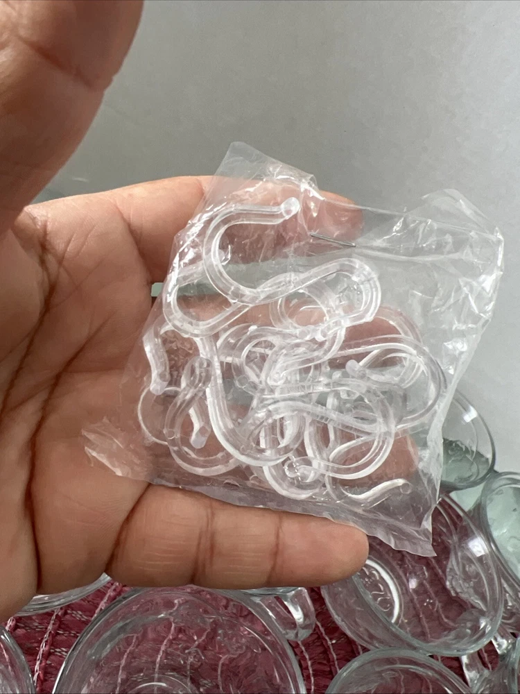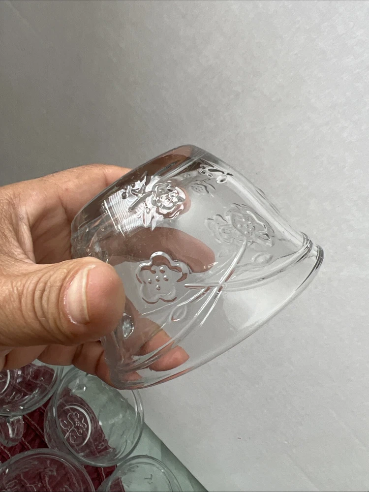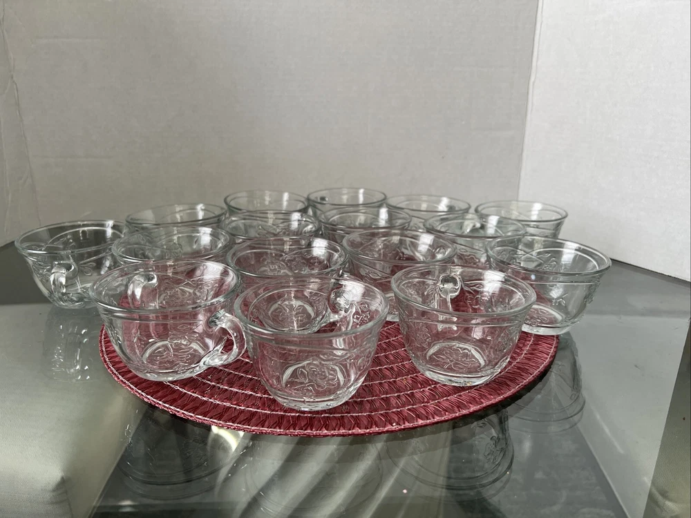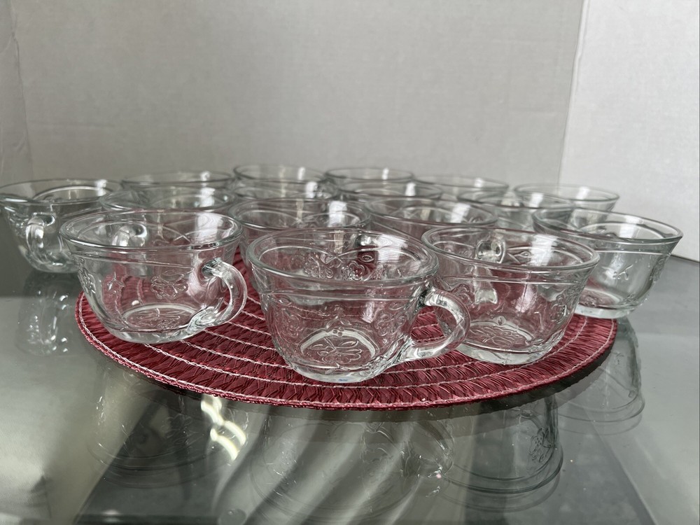 This is an Anchor Hocking Savannah Punch Set that includes 16 cups and 16 plastic hocks. The set features a mid-century modern style with a flower theme, made of pressed glass in clear color. It is an original vintage set from the United States, designed by Anchor Hocking. The cups and hocks are dishwasher safe and decorative, making them perfect for serving punch at gatherings. Open box , never used cups and plastic cups only