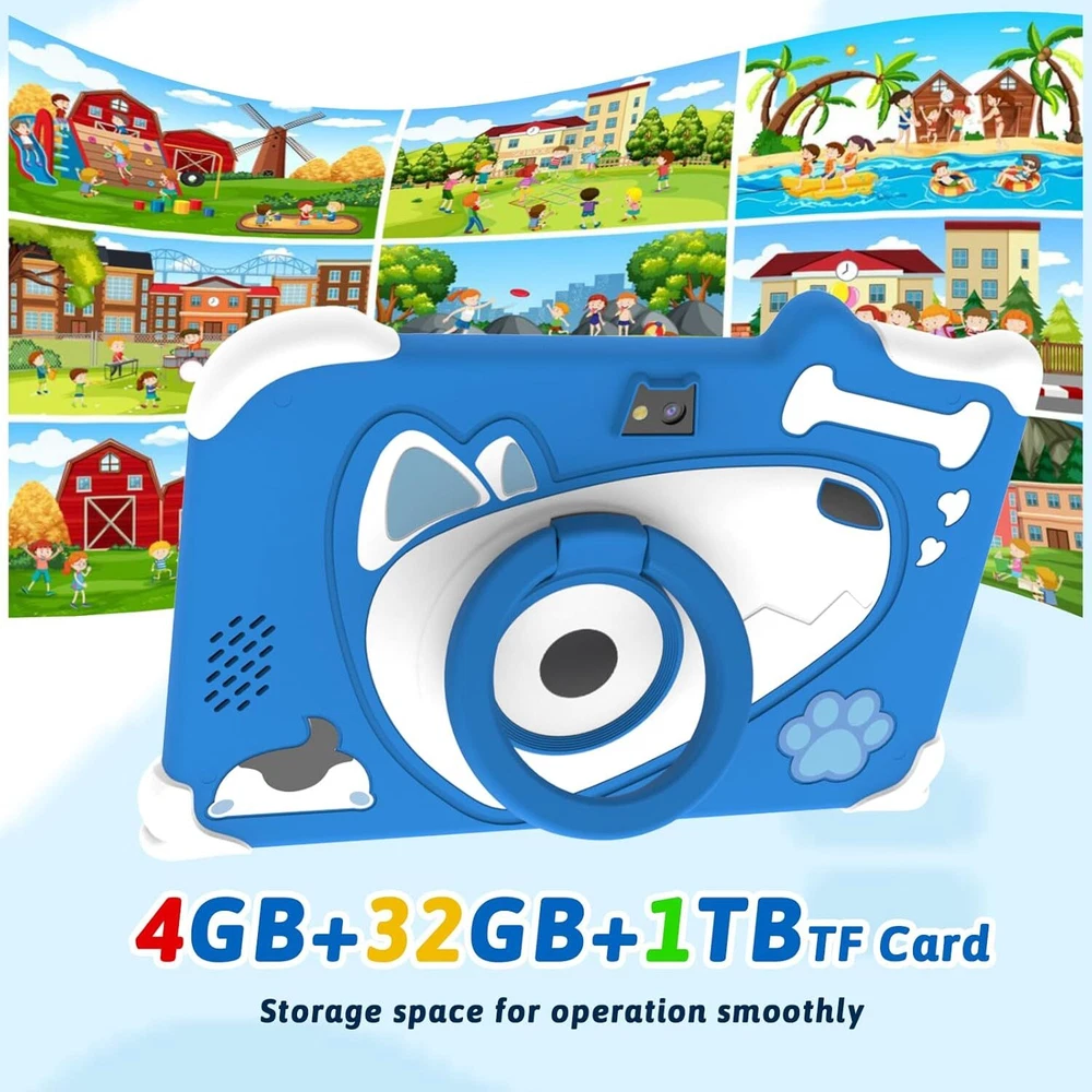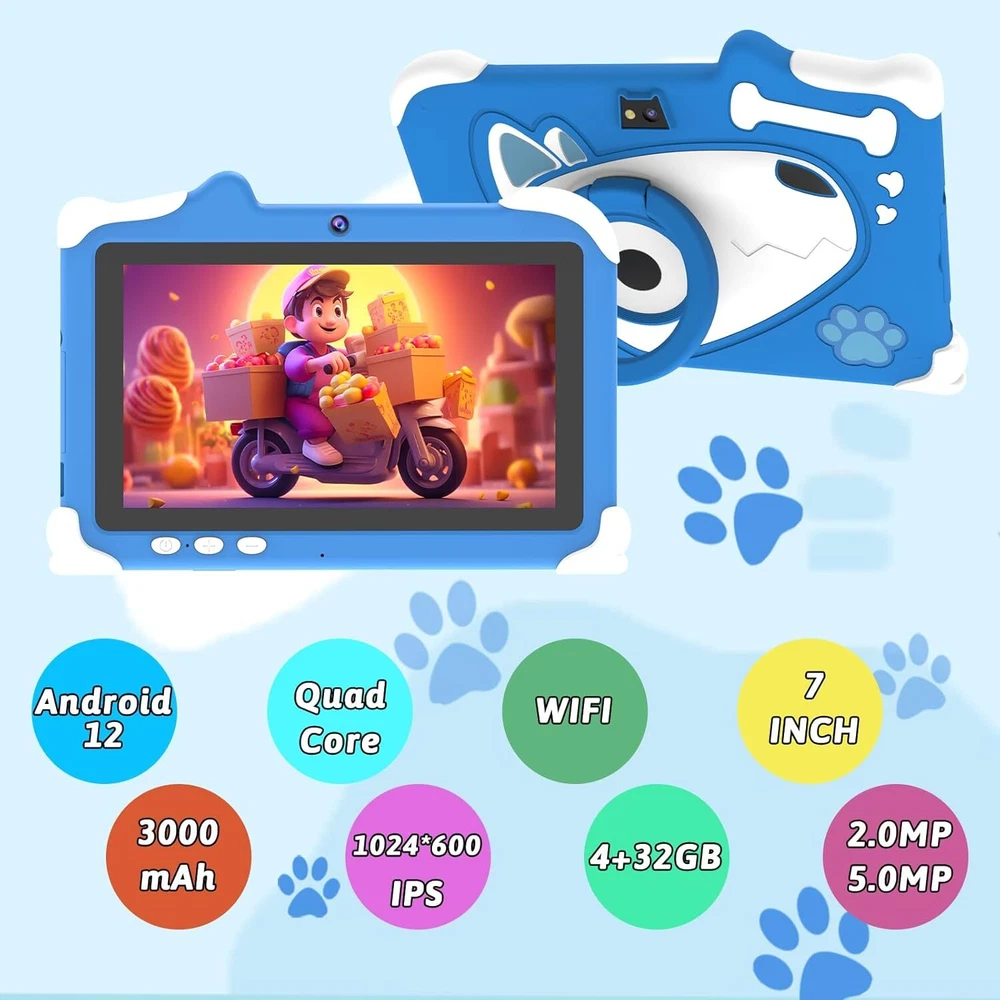Android 12 Kids Tablet, 7 inch Tablet for Kids, 4GB RAM 32GB ROM Blue Product Details 【New Android 12 Kids Tablet】 IWEGGO kids tablet equipped with the latest Android 12 operating system and powerful quad-core processor, ensures fast running when opening applications and multitasking, pre-installed kids apps, specially designed for different age kids, different color for choice. 【4GB +32GB Performance Kids Tablet】 The toddler tablet adopt 4GB RAM (2GB fixed memory, 2GB virtual memory) and 32GB ROM and supports Micro SD card expand up to 512GB, so that you can storage more photos and videos. Tablet passed the GMS certification, you can download much kids apps, support widevine L1, Netflix. 【Parental Control Tablet for Kids】 This kids tablet support parental control function, parents can limit screen time, set password, set separate profiles for each kid, add or block apps, filter unsafe web pages. Ensure your kid online safety through the parental control mode. 【Eye Protection Screen】 7 inch tablet for kids with quality 1024x600 IPS HD display screen. clear and bright screen provides outstanding visual experience when kids reading and watching the videos. automatic brightness adjustment can better protect your eyes, reduce eye fatigue. 【Ideal Gift Choice】 This kids tablet with slim and compact body, with soft and lightweight protective case, more durable, it can protect your tablet when drops. And the adjustable plastic stand can stand tablet stable. This tablet PC can bring a lot of fun and knowledge for your kids learning while playing. The toddler tablet is an ideal gift for birthday, Christmas, holiday season etc.