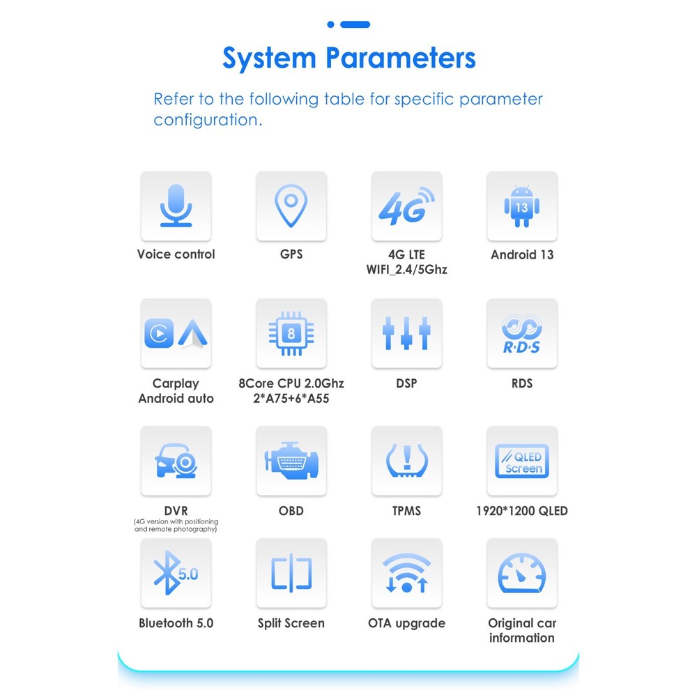 6S131 - Power Supply: DC 12V (allowance range: 10.8-14.5V) - Max. Current: 10A - Screen Size: 13.1 inch General - Operation System: Android 13 - Series:S6 Series - CPU: ARM Coretex UIS 7862S 8 Core(8x2.0GHz) - RAM: 6GB - ROM: 64GB System - Touch Screen: Yes - Resolution: 1920*1200 - Capacitive or Resistance Screen: Capacitive - Built-in Clock and Calendar: Yes, show real time and can use network-provided time - Main Menu Status Bar display: Can be changed to Music/Radio/BT-Stereo Player and Clock/Date/Week - Change Apps-Icon Position: Yes Display - WiFi: Built-in WiFi Modem, support 802.11b/g/n - 4G LTE module: Built-in - 4G LTE sim card slot: Yes - 4G LTE Antenna: YES - You just need to insert the 4G LTE sim card before you can enjoy the 4G LTE serivce. WiFi/4G LTE - Explorer: Opera, UCWeb, SkyFile, Dolphin and more explorer for your selection - Online Entertainment: Online Video, TV, Movie, Music, Radio, Video Chat - Online Navigation: Online Maps Navigating - Online Games: Yes, online play or you can download it from google play store - Online Communication: WeChat, Twitter, Facebook, Skype, Gmail, Whatsapp etc. - Read and edit Office Software: Yes, support Word, Excel, Powerpoint, PDF, TXT Internet - Format: MP3/WMA/MP2/OGG/AAC/MA4/FLAC/APE/WAV etc. Could play via song list - Record: MP3, WMA - Other: LRC synchronized display; ID3 search; Search by files; Album Picture; User-defined audio effect - Amp IC: TDA7851 - SNR: Noise rations:=90dB Audio - Format: Support AVI (H.264, DIVX, XVID), RM, RMVB, MKV (H.264, DIVX, XVID). WMA, MOV, MP4 (H.264, MPEG, DIVX, XVID). DAT (VCD format). VOB (DVD format). PMP, MPEG, MPG. FLV (H.263, H.264). ASF, TS, TP, 3GP, MPG etc. =30 formats, Playing internet video directly (while downloading) - Play: Up to 1920*1080 Pixels, 30Mb. Fluent play without light spot Video - Operation System: Android - Support Maps: Android Map, Sygic, Kudos - Voice Guidance: Yes - Support 2D/3D Map Views: Yes - Dual Zone: Yes, navigating while music playing - Online Navi: Yes, support maps online navigating GPS - Hands Free: Yes - A2DP (Bluetooth Stereo Music): Yes, can play stereo music through Bluetooth - Bluetooth Music Control: Yes, play/pause/previous/next - PB-Download: Yes, can download phonebook from mobile to this unit - PB-Search: Yes, can use the first letter to search contact member in PB-Listings - Calling Records: Yes, Dialed Call, Received Call, Missed Call - Setup: Auto Answer, Auto connect, Device name - Built-in Microphone: Yes, on the front panel - Bluetooth Version: 5.0 Bluetooth - AM Tuning Range: 531-1620KHz - AM Increment: 9KHz(EU)/10KHz(US) - FM Tuning Range: 87.5-108MHz - FM Increment: 0.05MHz(EU)/0.1MHz(US) - FM Area: Europe/USA1/USA2/Japan/Russia - RADIO IC: TDA7708 - It doesn't support XM radio, but you can access the same channels using the XM radio app. Radio - Position: 3 USB Port, can be connected with Media/Camera/DAB+ Box / Smartphone - Capacity: 2TB - Play MP5 Videos: Yes, can play RMVB Videos up to 1080P - Touch Music Title to play directly: Yes USB - Built-in Car Recorder App: Yes, just connect a USB Camera to use this function - Support HD CCD Camera: Yes, 1080P - Play recorded Video directly: Yes - Storing Position: Nand Flash/GPS Card/SD Card/USB Storage can be changed DVR - Built-in DAB Player App: Yes - Connection Port: USB - Power Supply to DAB+ Box directly: Yes - Touch Control DAB+ Box on unit: Yes DAB(+)-IN - Built-in Digital TV Tuner: No (you can contact us to buy it together) - External Port for TV Box: Yes, Support DVB-T/DVB-T2/ATSC/ISDB Box - Power Supply to TV Box directly: Yes, you can connect our TV Box to achieve this function - Remote Control the TV Box on unit: Yes, you can use the Remoter of the TV Box to achieve this function DTV-IN - Textbook: Could change font, font color, background color, bookmark, reading E-book while listening music - Photo Viewer: Support JPS, BMP, PNG, GIF etc. format. play by revolve, Powerpoint Support 4096*4096 Pixels - Wallpapers: 5 live wallpapers, 17 standard wallpapers, support DIY wallpaper from Gallery - APK Installer: Support Android Package installer - Support Torque Pro(OBD2 &Car): Yes, you can connect a Bluetooth OBD2 Scanner Tool to use this function - Support Mirror Link function: Yes, support screen mirroring from iPhone and android smartphone - Support TPMS: YES (Not Included, you can contact us to buy it together) Additional - WiFi/Hotspot/Bluetooth: Yes - Brightness level adjustable: Yes - Wallpaper: Wallpapers/Live Wallpapers/Gallery - Sound: Key Tone & Volume - Storage: Display Internal Storage/Nand Flash/Connected Device Storage - Apps: Running Apps display/force stop/uninstall - Security: Yes - Accounts: Yes - Languages and Input: more than 70 Languages and choose input method - Backup and Reset: Yes - Date and Time: Setting Date&Time by yourself or choose GPS/network-provided time - Accessibility: Yes - GPS: Yes, GPS application options/monitoring/sound mode/mixing ratio - Driving safety: Watching Video, Reversing X-mirror/Volume, Reversing Trajectory/radar Display, Rear view ruler - Amplifier: Rock/Pop/Jazz/Classic/Flat/Voice/Custom - Steering Wheel Control: Yes - About Device: Display Parameter Info. Setup - AUX Video In: One - Rear-View Camera Video In: One - AUX Audio In: R/L - DTV Box In: One - DAB+ Box In: One - Car DVR In: One - Radio Antenna In: One - GPS Antenna In: One Input - Audio Out: R,L - Subwoofer Output: One Output
