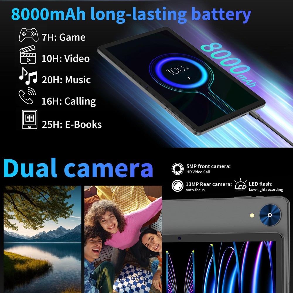 are available in a wide range of models and systems such as 10-inch . We realize that everyone has their own unique preferences and requirements, so we offer a variety of models to meet different needs. Whether you're a student, a professional, or a tech enthusiast, we have a for you. Specification Battery:8000mAh/Lithium-ion battery Operating time: 16 hours Languages: Multi-language Screen: HD 10-inch IPS 1280*800 HD Memory: 26(4+22)GB ROM: 256GB OS: Android 15 Wi-Fi: 2.4G and 5G Wi-Fi BT: Bluetooth 5.0 (HS) Dual : 5MP front + 13MP rear G Headphone Jack: #3.5mm Power adapter: USB 5V/2A Speakers: Built-in stereo speakers 8R/1.0W*2 【2025 Latest 26GB+256GB 】This Android with keyboard is equipped with a 26GB (4GB + 22GB virtual memory) RAM + 256GB ROM combination, which can easily run various games, software and office documents. Multiple applications run more smoothly, and 2TB micro SD card expansion memory, which can download various daily software and entertainment software. 【2025 Android 15 】This uses the new Android 15 operating system, has an application cold start acceleration function, shortens the application startup time, and significantly improves privacy protection and fluency. Automatically optimize background resource usage, allowing you to enjoy various applications and say goodbye to lag. 【10.1-inch IPS display and 5G WIFI】This 2-in-1 Android is equipped with a 10.1-inch large screen with a resolution of 1280*800, and the picture details are clear and delicate. The IPS screen allows you to see a clearer picture, which is suitable for long-term video watching, learning and daily office work. Equipped with 2.4Ghz/5Ghz Wi-Fi, ensure that you can browse pages and smoothly at home or in public places. 【8000mAh long-lasting battery】This 10-inch is equipped with an 8000mAh large-capacity battery and supports low-temperature fast charging. The intelligent power saving mode allows you to control the rhythm of watching movies, games or processing documents without frequent charging, and long-lasting battery life. 【Complete , ready to use]】The is equipped with a full set of , and it can be easily transformed into a -in-out of the . The package includes: 10.1-inch silver *1, Bluetooth keyboard*1, wireless *1, stylus*1, silver protective case*1, charging head*1, USB-charging cable*1, user manual*1(Tip:are all the same color, theye all silver. The color difference is reflected in the case.)