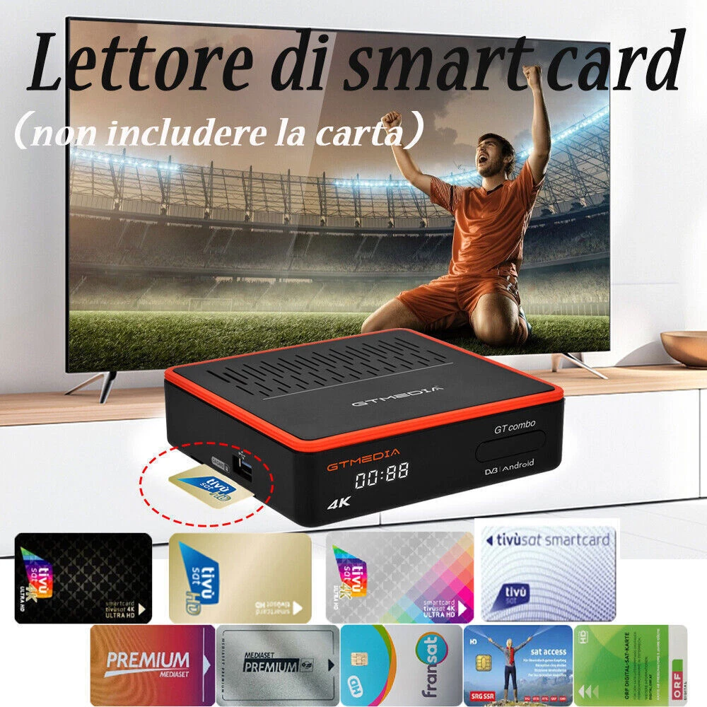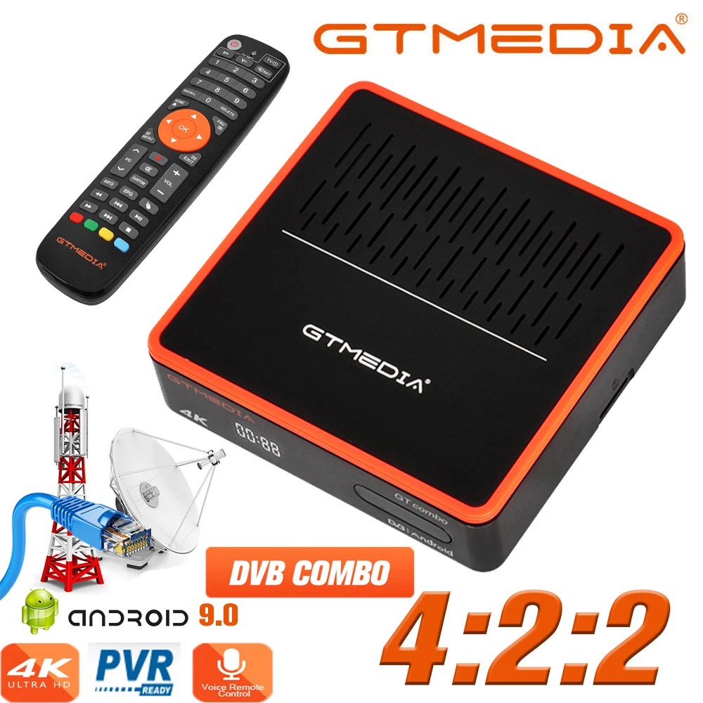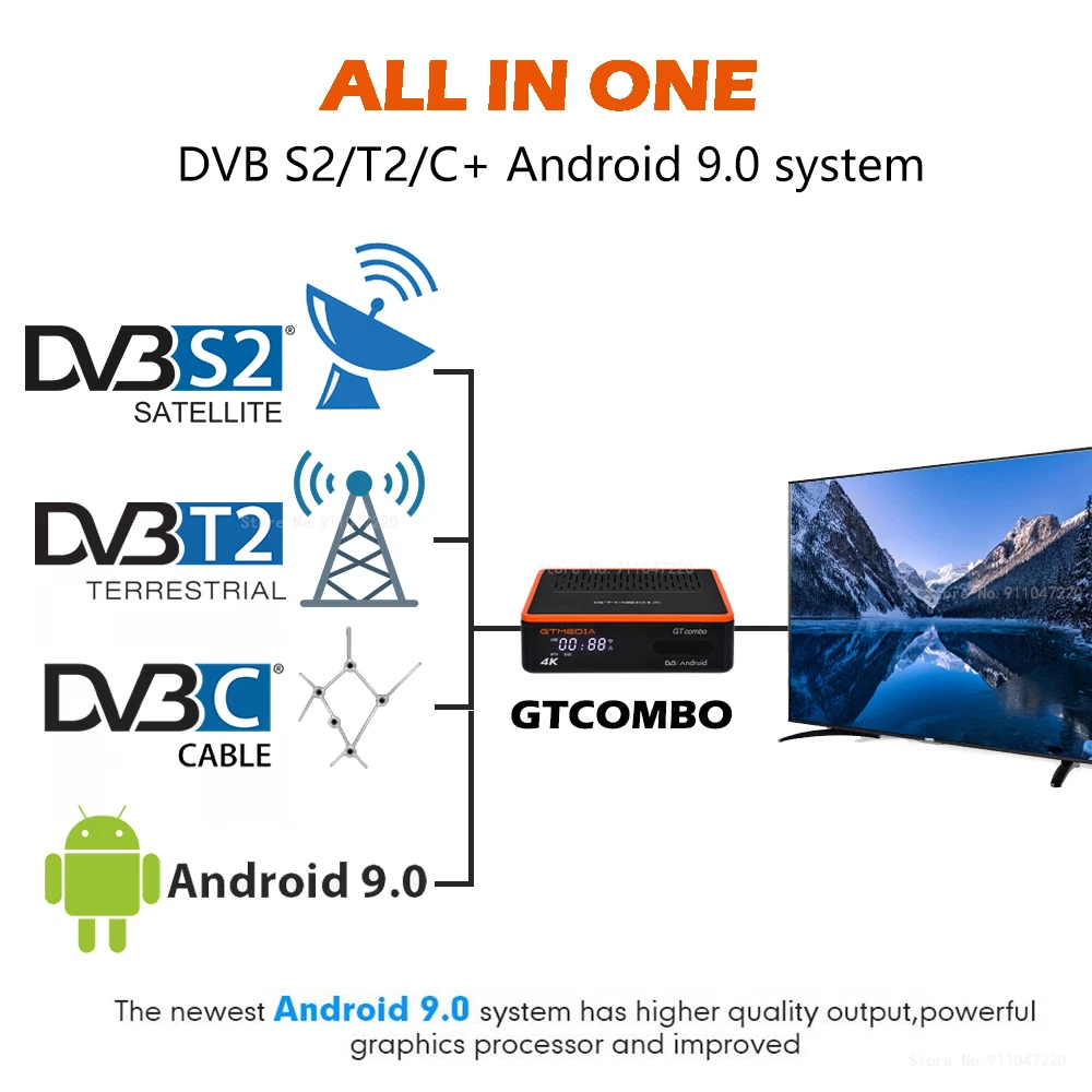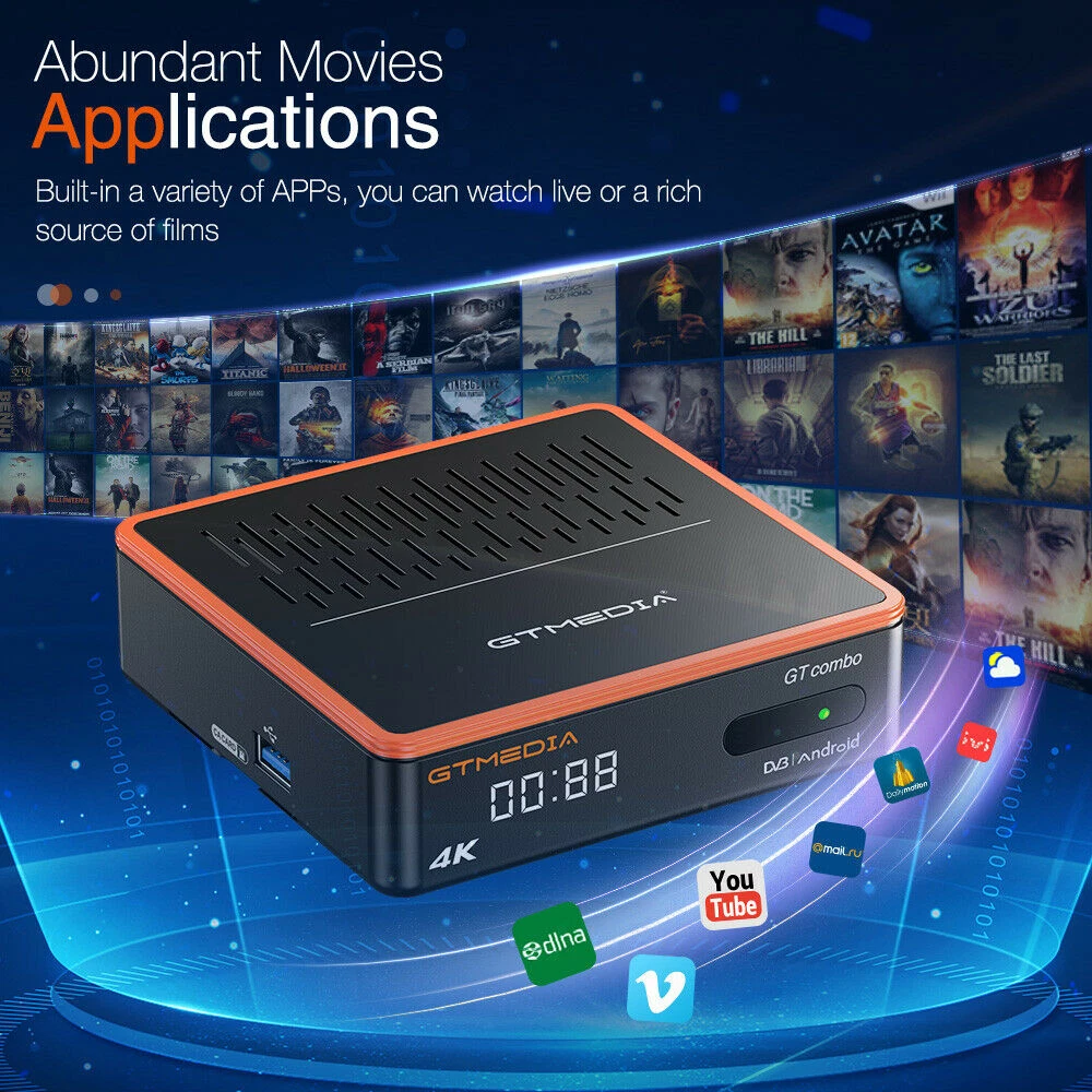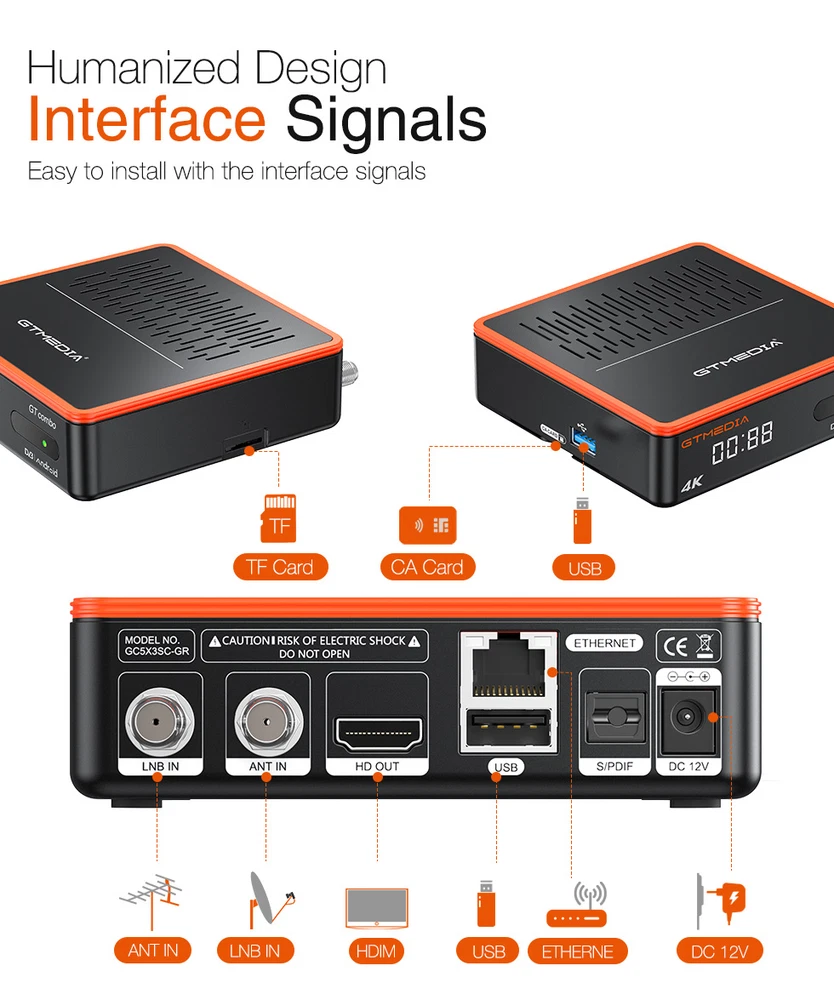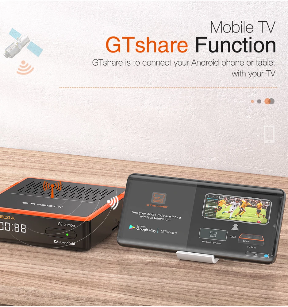Main Features: ⭐【Combo DVB Receiver+Android 9.0 TV BOX】 ⭐【YUV4: 2: 2 Video Decoding】 ⭐【Remote control with learning function】 ⭐【Supports smart card slot】 ⭐【Support for multiroom function】 ⭐【Pre-installed video application】 ⭐【2.4G /5G dual wifi + bluetooth 4.1 voice remote control】 ⭐【Customize by user】 You can change the wallpaper at any time and customize the remote control function buttons to allow for personalized customization ⭐【DLNA and SAT A IP, EPG and LCN】 Supports the mutual projection of screens of mobile phones and other devices. Support EPG and LCN worldwide and support automatic channel updates. ⭐【PVR recording function】 Support program recording while watching other live broadcasts. Accessories: 1* GTMEDIA GT Combo TV Box 1* Remote Control 1* HDMI Cable 1* Adapter Main Features: ⭐ 【 Combo DVB Receiver+Android 9.0 TV BOX 】 supports DVB-S/ S2/S2X, DVB+ T/T2/cable/ATSC-C (J.83B)/ISDBT, AVS + ,It supports all signal TV program channels, including satellite TV, terrestrial broadcast TV, and cable TV programs. It also has an Android system. You can experience smart life at any time and download and install your favorite apps at any time. ⭐【 YUV4: 2: 2 Video Decoding 】 The first machine on the market that supports YUV422 , bringing you an unprecedented viewing experience ⭐ 【Remote control with learning function】 Easy to copy button setting from other remote controls, you can use one remote control, easy to use ⭐【 Supports smart card slot 】 Support many European smart TV cards like Abertis/Mediaset/Movistar/Tivusat/BBC Satback and other CA cards (see list of supported smart cards below, or you can provide a photo of your card to ask if they are yours can read). ⭐【 Support for multiroom function 】 With the multiroom function, you can divide your card into several boxes (up to 16). When you have a smart card but have two or more boxes. You can put a smart card in a box and configure it as a server. Then define the other enclosures as clients to connect this server over the network. The customer boxes share this smart card. ⭐ 【 Pre-installed video application 】 The system is GT UI, GTStore Addons pre-installed Netflix, Youtube, Prime-Video , Online Movies, etc. ⭐【 2.4G /5G dual wifi + bluetooth 4.1 voice remote control 】 gives you more choice, more sensitive and convenient than the previous infrared remote control, you can solve your worries anytime anywhere ⭐【 Customize by user 】 You can change the wallpaper at any time and customize the remote control function buttons to allow for personalized customization ⭐【 DLNA and SAT A IP, EPG and LCN 】 Supports the mutual projection of screens of mobile phones and other devices. Support EPG and LCN worldwide and support automatic channel updates. ⭐【 PVR recording function 】 Support program recording while watching other live broadcasts. A list of smart cards that can read programs ( it has smart card slot,can read lot of smart tv cards ) : 1.Seca CAID 0100 for 19.2E Spain Movistar. 2.Nagra CAID 183E for 13E Italy Tivusat(the gold and grey). 3.Nagra CAID 183D for 13E Italy Tivusat(old card). 4.Nagra CAID 1805 for 13E Italy Mediaset Premium. 5.Nagra CAID 1805 for Italy DVB-T Mediaset Premium 6.Viacess CAID 0500 for 13E Switzerland SRG/SSR 7.Conax CAID 0B00 for 85.2E Russia Telekarta. 8.Conax CAID 0B01 for 13E Poland TNK. 9.Seca CAID 0100 for 13E Poland CYFRA+. 10.Viacess CAID 0500 for 16E Croatia OIV. 11.CryptoWorks CAID 0D98 for 19.2E Austria ORF ICE. 12.Seca CAID 0100 for 19.2E/23.5E The Netherlands Canal Digitaal. 13.CryptoWorks CAID 0D96 for 23.5E Slovakia SkyLink ICE. 14.NDS CAID 09AC for 91.5E Malaysia Astro. 15.Irdeto CAID 0602 for (unknown) Telekarta TV. 16.Conax CAID 0B00 for Cable Turkey TV. 17.Conax CAID 0B00 for Cable Bulgaria Blizoo BG. 18.Viacess CAID 0500 for 5W Fransat. Hardware: CPU: Amlogic S905X3, Quad-Core ARM Cortex-A53, 18.400 DMIPS GPU: ARM Mali-G31 MP2, 850MHz RAM: 2G DDRIII ROM: 16G EMMC Accessories: 1* GTMEDIA GT Combo TV Box 1* Bluetooth remote control 1* HDMI Cable 1* Adapter 1* User Manual 1* Gift Box