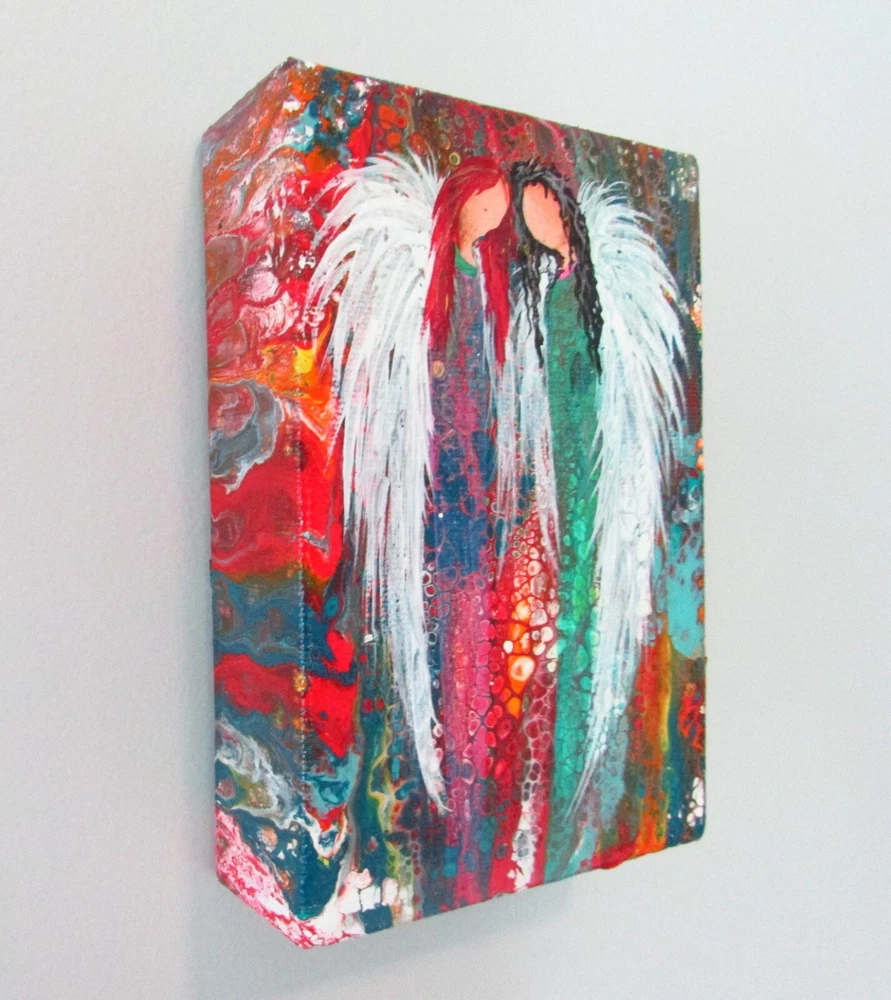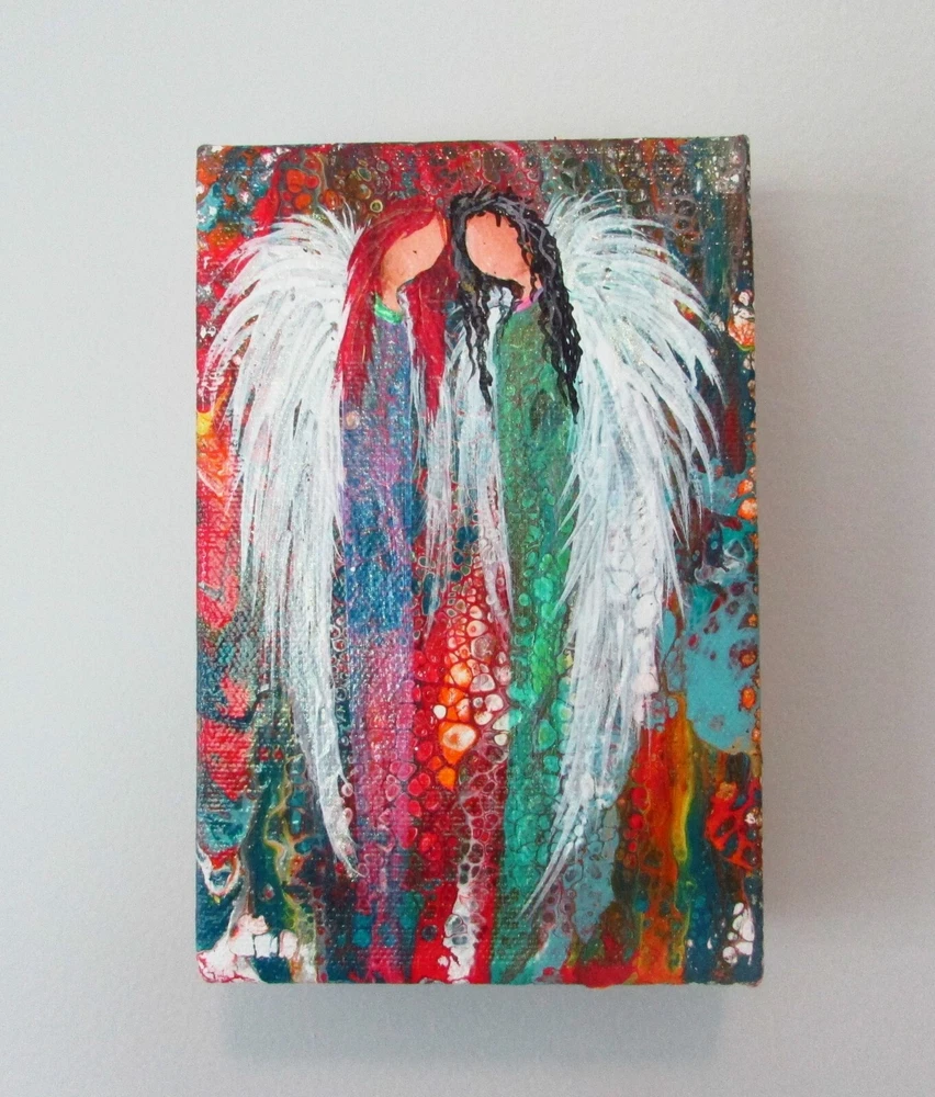 This colorful painting features a pair of "sister" angels in prayer for the good of human kind . Painted by Rain Crow. It is multi colored and done in an abstract style with a pour painted background. It was painted on quality canvas and back stapled for security. It's multi color makes it usable for any space. You may frame it for a larger look. 4" x 6" x 1 1/2" Title: Angel Sisters in Prayer Varnished. Please ask questions before purchase. Note: The photos are zoomed in to provide details. They may appear extremely large in the photos. Please see actual size above. COMBINED SHIPPING is available automatically at checkout. I cannot hold items after you pay. Once you pay for an item, It MUST ship within 24 hours. If you wish to combine, ALL items must be paid for the same day. ANG-4x6-GAL