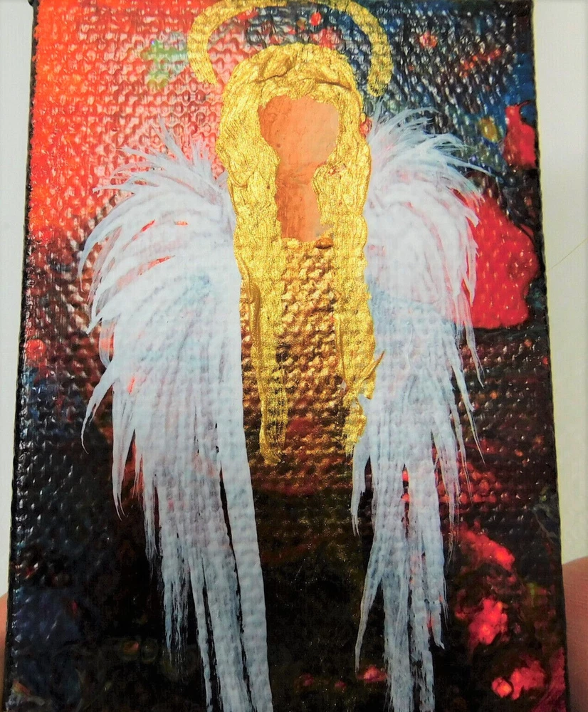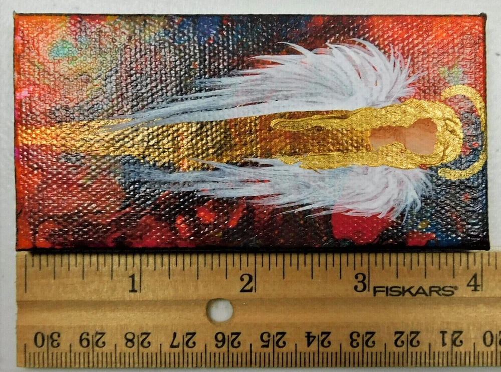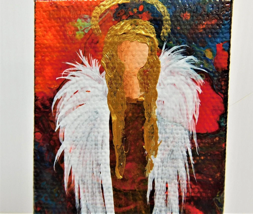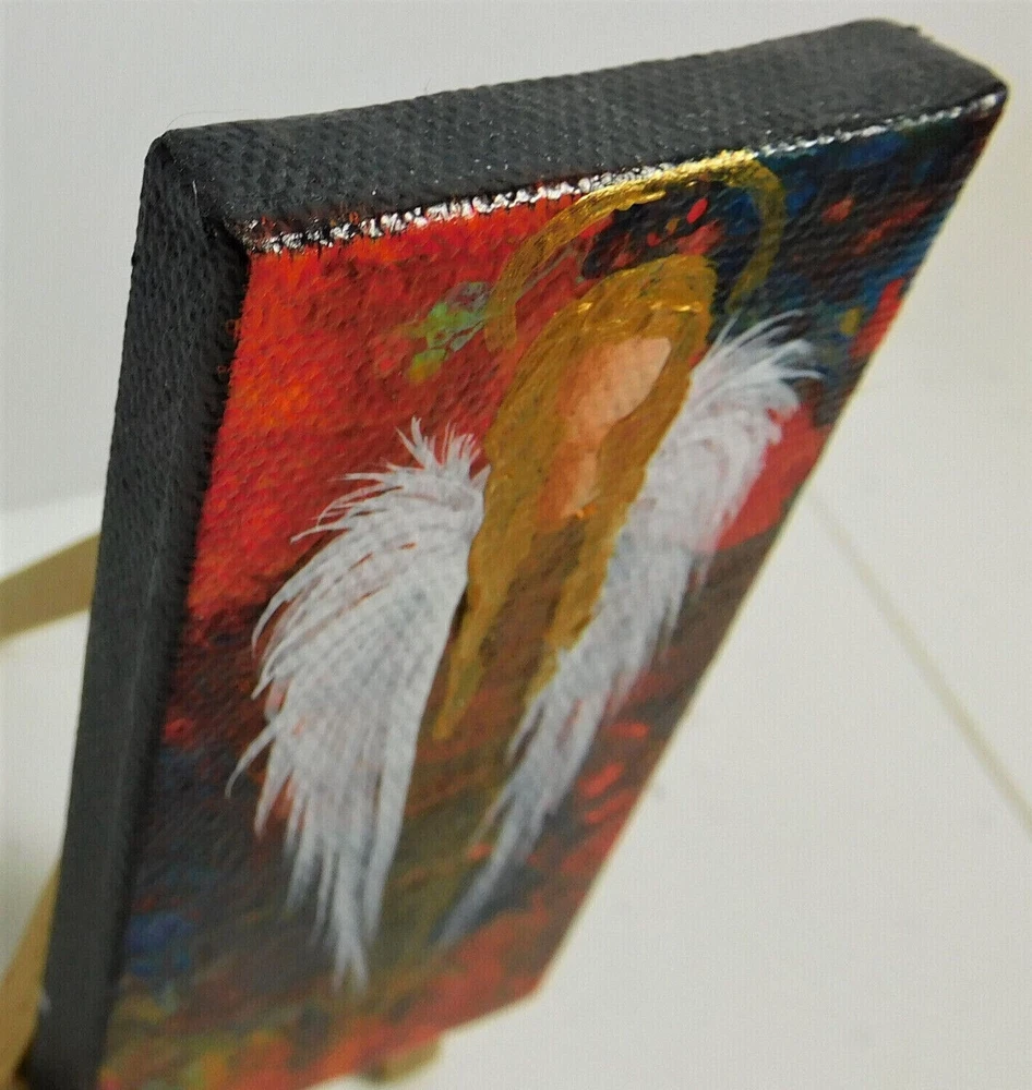 This is a colorful painting by Rain Crow featuring a guardian angel watching over humanity to bring passion for our life goals. Display as is on a mini easel or add a frame to make it seem larger. It is mini art and can be used as a way to introduce your child to the art World. Use in doll houses or as desk or bedside decor. Easel in photos not included. 4" x 2" x 3/8" Title: Angel of Passion Canvas Signed on back Varnished. Please ask questions before purchase. Note: The photos are zoomed in to provide details. They may appear extremely large in the photos. Please see actual size above. COMBINED SHIPPING is available automatically at checkout. I cannot hold items after you pay. ALL items must be paid for at the same time. ANG-2x4-3/8-4