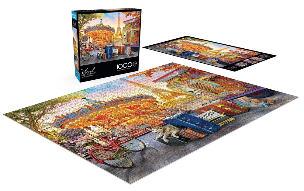 Carrousel de Paris is a 1000-piece jigsaw puzzle from the Vivid Collection by . At the steps of the Eifel Tower enjoy a ride under the twinkling lights of the carrousel. Let the pups watch your luggage as you venture off to enjoy the sights and sounds of Paris. The Vivid Collection includes a variety of bright images from an array of artists and photographers from around the globe. Every jigsaw puzzle is manufactured from recycled puzzle board. A precision cutting technique guarantees that every piece will fit soundly with the company's signature Perfect Snap™. A bonus puzzle poster is also included so that you have a handy reference of what the completed puzzle should look like while you put yours together. 1000 PIECE JIGSAW PUZZLE – This 1000-piece jigsaw puzzle is the perfect level of challenge. Measuring 7.94in. x 7.94in., this puzzle is a great single evening activity for the entire family, friend group or yourself. For adults ages 14 and up. HIGHEST QUALITY MATERIALS – The puzzle pieces are thick and sturdy. Our high-quality dies cut our puzzles with laser precision. APEX PUZZLE IMAGERY - Relax and enjoy the puzzling process while “traveling” to some of the most beautiful, bucket-list places, Or join in the fun with our portfolio of licensees, or finish in style with world renown artists. FULL COLOR BONUS POSTER - Every puzzle includes a full color poster to reference while assembling your puzzle. Or, for a real challenge, try to solve without the poster in hand! PERFECT GIFT - Puzzles are not only great gifts for any and all occasions including birthdays, holidays, housewarming parties or even just a fun night in with friends.