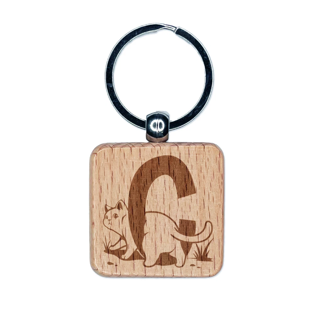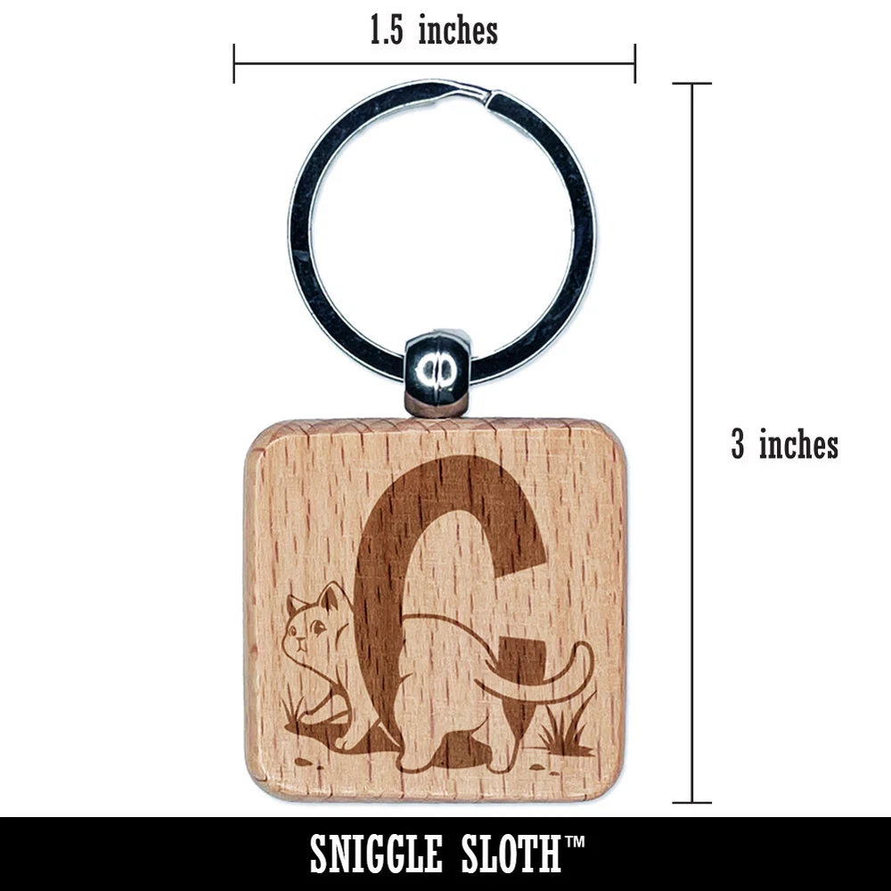 Animal Alphabet Letter C for Cat Engraved Wood Square Keychain Tag Charm