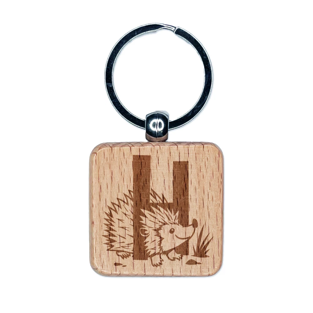 Animal Alphabet Letter H for Hedgehog Engraved Wood Square Keychain Tag Charm