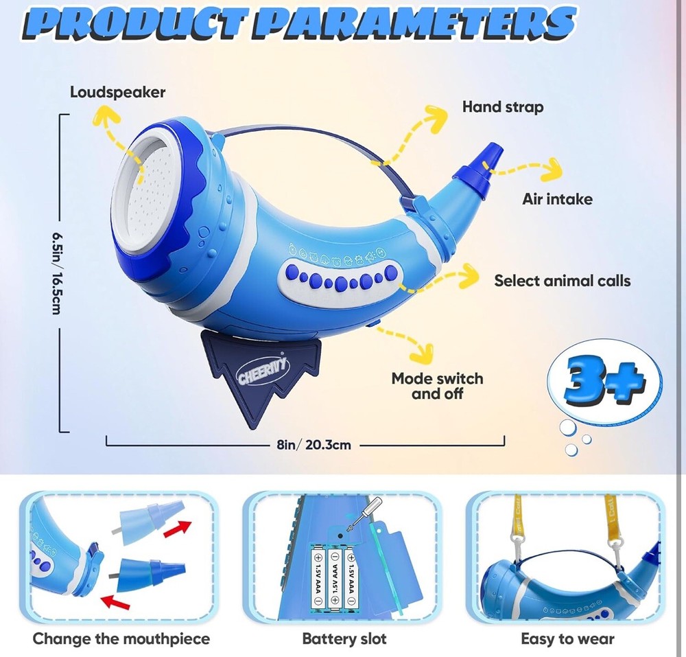 Skills:Motor SkillsBrand:CHEERIVYCountry of Origin:ChinaAge Level:2 Years and UpModel Name:212YIncluded Components:caller, instruction, strapItem model number:212YCountry/Region of Manufacture:ChinaItem Weight:9.1 ouncesGender:UnisexType:Does not applySpecial Feature:PortableManufacturer recommended age:3+ YearsColor:Blue