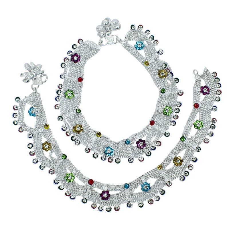 Item Weight: 70 gm MPN: Does Not Apply Metal: Silver Plated Style: Indian Anklets Material: Metal Closure: Hook Cut Grade: Excellent Brand: Handmade Color: Multicolor Main Stone Color: Multicolor Size: Length:-26.5cm x Width:-2.5cm (Approx) Sale For: 1 Pair Main Stone Shape: Round Main Stone: Artificial Stones & Beads Type: Anklet Country/Region of Manufacture: India Occasion: All Occasion Modified Item: No