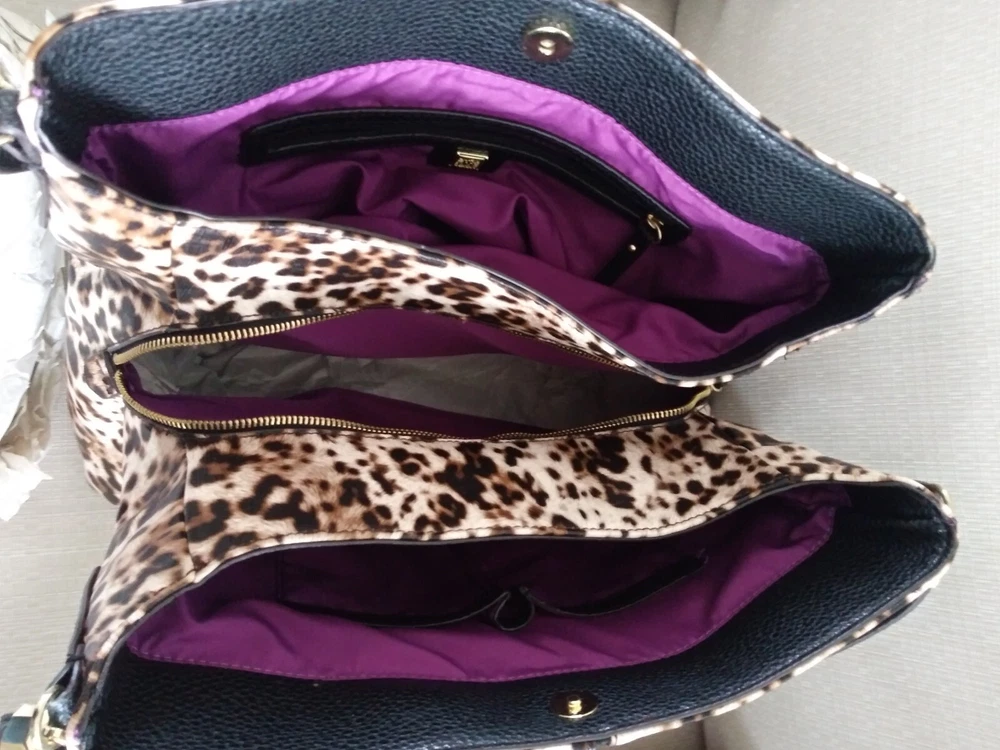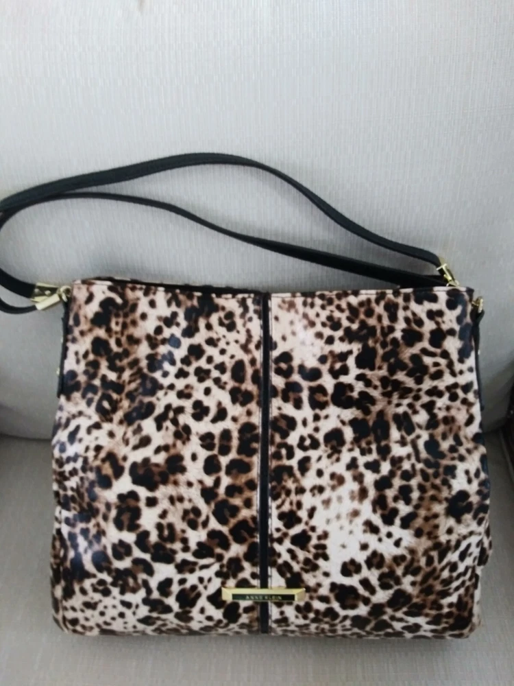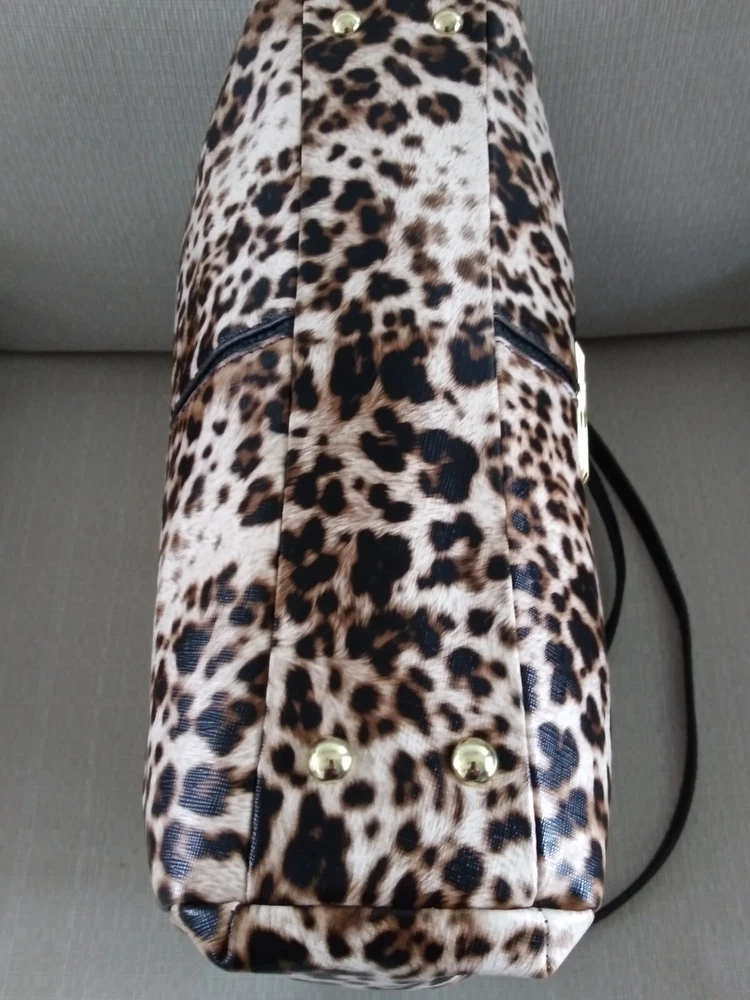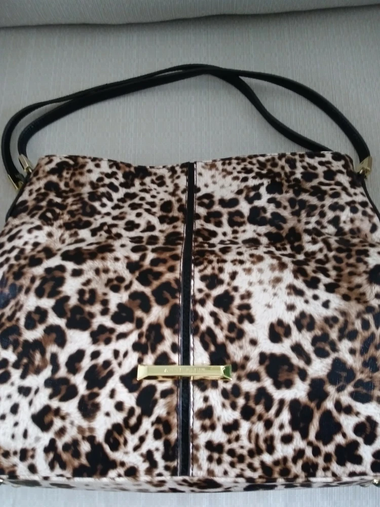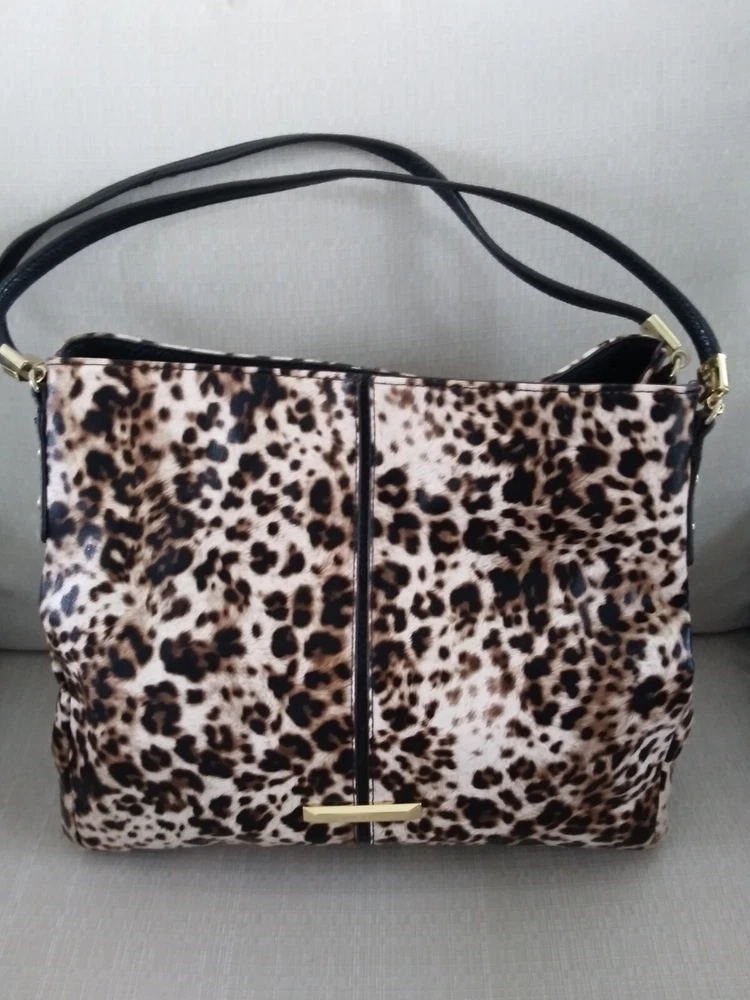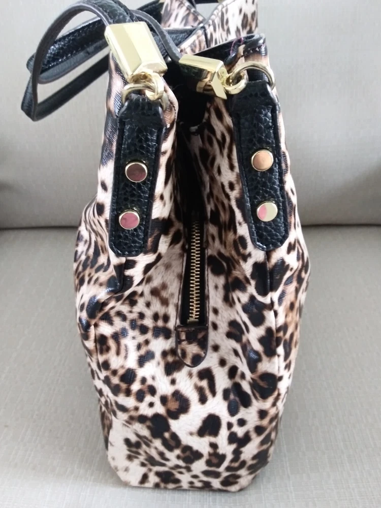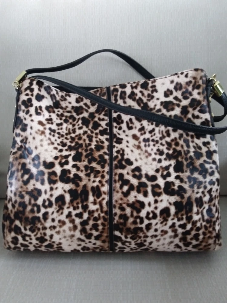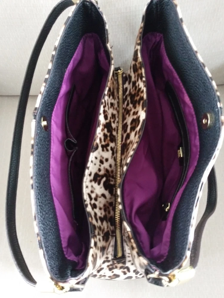 Bag is 13" wide,12.5" high and 2.5" deep Fixed shoulder straps are 21.5" long Bag is divided into 3 compartments Middle compartment with zip closure and two side compartments with snap closure Interior futures two slip in pockets and one zipped pocket Bage is made from manmade material Bag is new with no tags