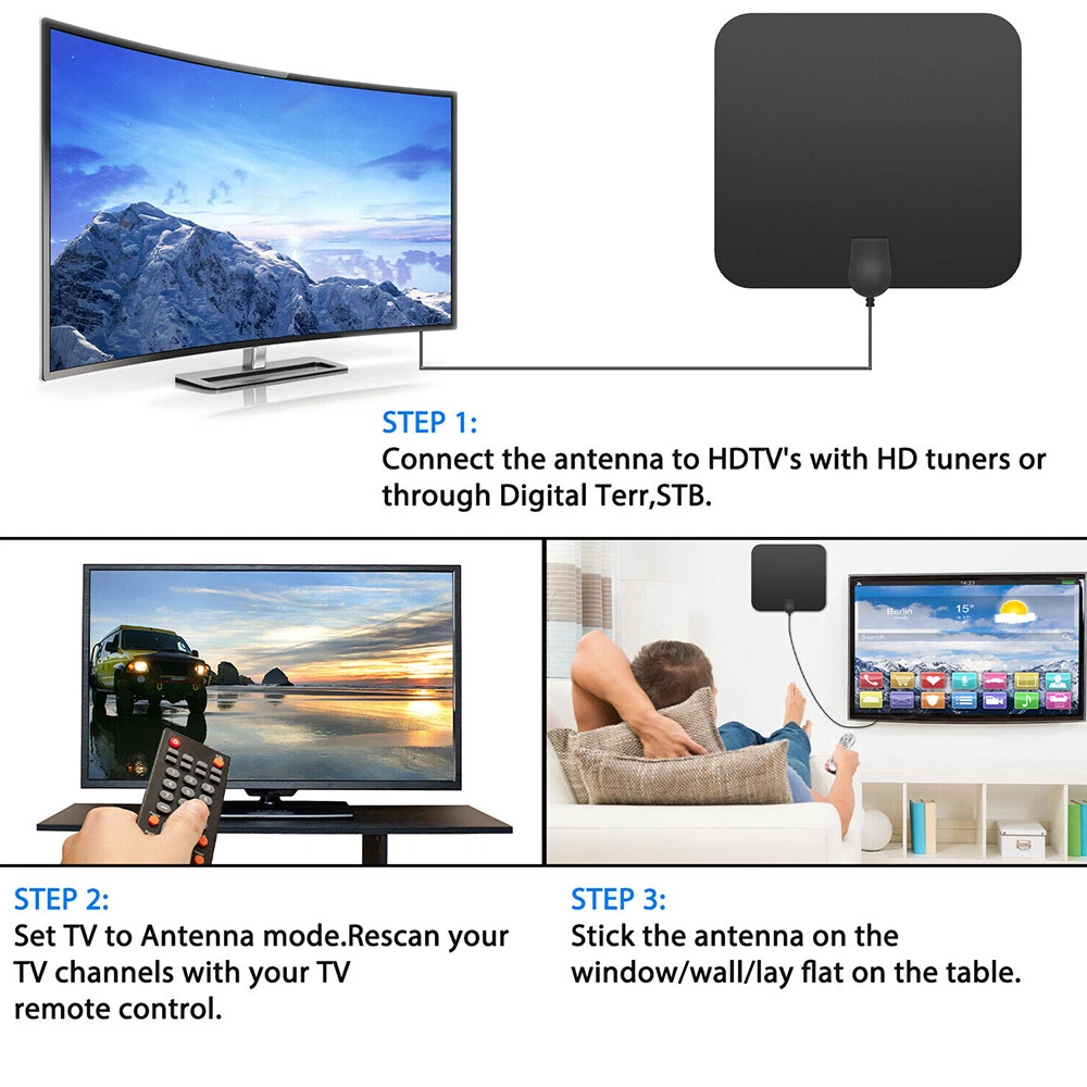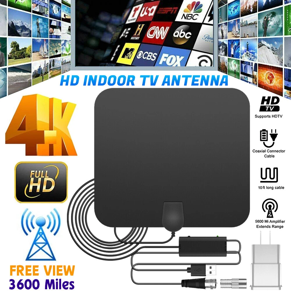 Newe st 4K Digital TV Antenna 3600 Miles Booster DVB-T Aerial HD Flat Indoor Active 37DBi High Gain VHF UHF TV Box TV Antenna Newest 4k 1080p HDTV Indoor Digital Amplified 3600Mile Signal Booster Specificati on : Flat antenna: 250X223mm Signal support: support 720p, 1080i, 1080p HD mode Product range: 3600 miles Coaxial cable: 16.5ft Connector type:F male to TV v.s.w.r. : < = 1.5 Maximum value: 1 Impedance : 75 Ω Capability: Multi-directional capability Applicable channels: All channels can be received Product gain: 37 DBI (with amplifier) Operating frequency: 174~240mhz, 470~862mhz Product size: 25*22.3 * 0.6cm Product Tape: Double-sided tape Antenna cover color: black Operating temperature: -45~85℃ Storage temperature: -45~85℃ Feat ure : 1. This unique plastic shell is imported throughout the network of silver fluffy, and all accessories are pure copper to ensure loose contact 2. We bundled the Velcro and two bubble machines to solve the problem of 3M stickers difficult to solve 3. Connect high quality coaxial cable, easy to locate the antenna, find the best TV signal reception 4. New generation flat design indoor TV antenna, thickness is only 0.6 inches 5. Specially compatible with various digital terrestrial (DVB-T, ISDB-T, DMB-T/H, ATSC) and DAB/FM radios for HDTV 6. Two signal modes, short range (0-300 miles) and long range (300-600 miles), choose the appropriate mode to find more channels Pac kage Includes: 1 × Antenna 1 × Signal Amplifier 1 × F To LEC Converter 1 × Instruction Manual