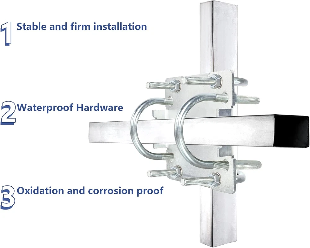 Important: Only Clamps, Poles are not included! [Easy to Install] Mount 2 antenna mast poles at a 90°(cross or T shape) firmly, V jaw blocks and U-shape bolts would prevent it slip down. [High Quality Made] Made of Q235 low carbon alloy steel that could effectively prevents rusting, and it is galvanized which provide oxidation and corrosion proof. [Widely Used] Long time service antnena pole mount that suitable for mino antennas, yagi antenna, TV antenna, weather station, security camera, solar panel, LED street light etc. [Heavy Duty Hardware] 3mm thick steel plate for heavier mast and not easy to be bent, can strongly against winds and extreme weather to keep your device safe. The entire hardware can be used for poles 1"-1.8" in diameter [Package Included] The package contains 1*steel plate, 4*U-bolt, 8*nut, 8*washer, 8*grommet. If you have any issues about it, contact us freely. Product Description Feature: Antenna mast mounting kit that easy and stable installation. Anti-corrosion and anti-oxidation antenna pole bracket. High quality made, not easy to deform. Widely used hardware. 3mm thickened steel plate, not easy to deform, more stable. Appliciation About us MOOKEERF is a professional brand of communication accessories. We have been focusing on research and development of communication accessories for 10 years. The products sold include coaxial cables, connectors, antennas, power dividers, etc. MOOKEERF U-bolt cross over antenna mast clamp Important: There's only mounting kits, poles are not included! Material: Galvanized Q235 low carbon alloy steel Parameter: Suitable for poles OD 1"-1.8" Applications: Antennas, Outdoor lights, security camera, solar panels, weather stations
