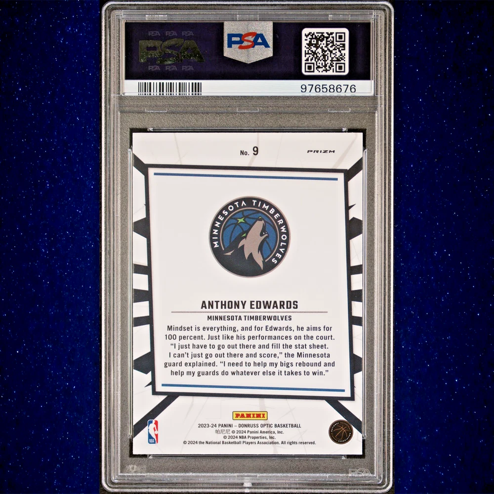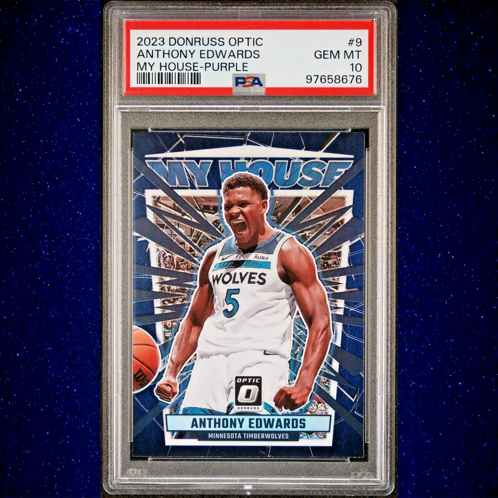 Anthony Edwards 2023 Panini Donruss Optic My House #9 Purple Prizm PSA 10 All orders ship within 24 hours of payment. For Graded Cards you will receive the card(s) listed in the title and pictured in the scan, because at times we may have duplicates of the exact same grade card, you will receive the exact card and grade listed but certification number might be different. Graded cards will be put in a graded sleeve, wrapped in cardboard, and shipped in bubble mailer to ensure it arrives in pristine condition. For Ungraded Single Cards you will receive the exact card(s) listed in the title and pictured. Ungraded Single cards over $20 will be shipped the same way as graded cards Ungraded Single cards under $20 will be shipped in a toploader and team bag using eBay standard envelope, if you would prefer to have it shipped with more protection in bubble mailer, please send us a message and we can provide an updated shipping quote for you. RETURN POLICY : We allow returns with full refunds but do not offer partial refunds. Returns are available to our customers if they did not get the item they are intended to receive. They are not for them to buy and decide they do not want them. 1. Items returned because of damage, missing parts, wrong item sent, will be given full refunds 2. Items returned because of buyers remorse, changed my mind, found better price, just didn't like it will by charged a minimum of 20% restocking fee SALES TAX : Sales tax is charged in accordance w/all of eBay's policies and the state where the item is being sent. ADDITIONAL INFORMATION : We are actively accepting ebay consignments, please message us for any inquiries. THANKS FOR LOOKING AND PLEASE MESSAGE US WITH ANY QUESTIONS! Check out our other eBay listings by clicking this link: TopShop828 eBay Store !