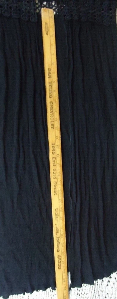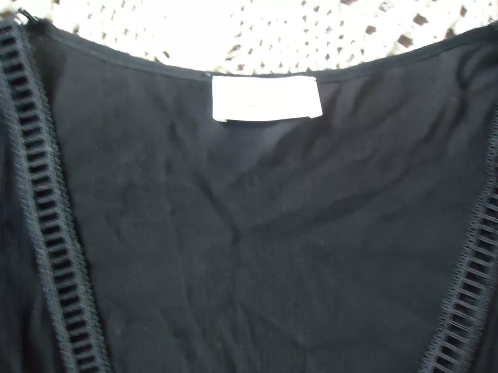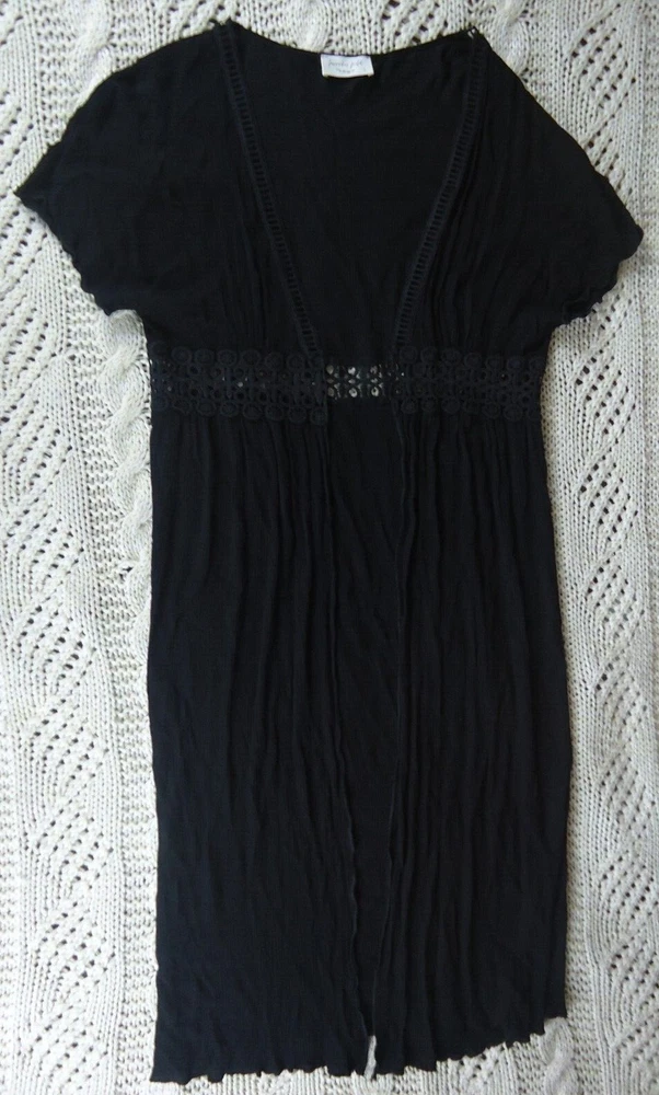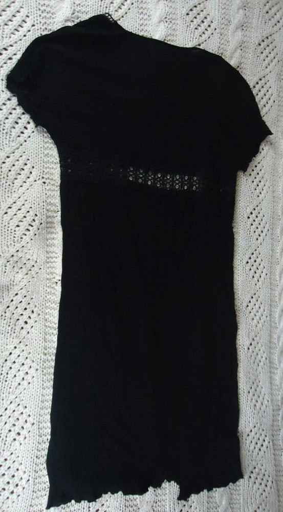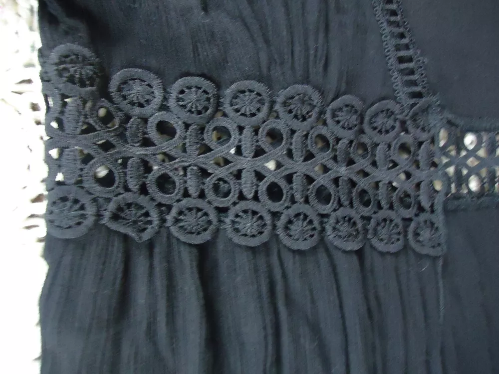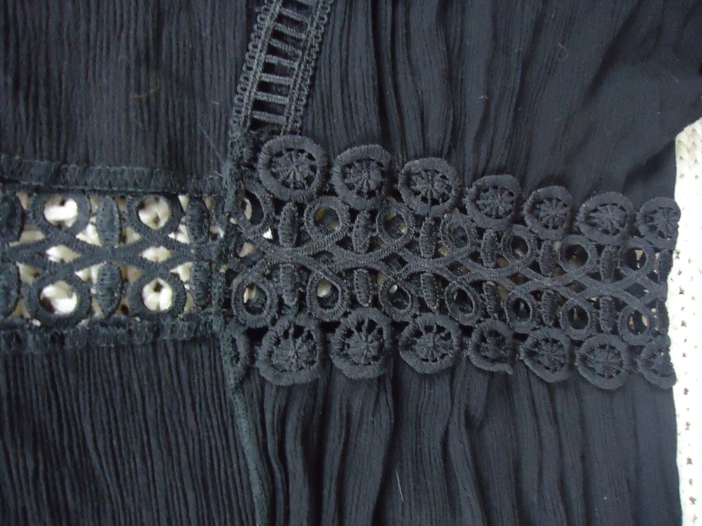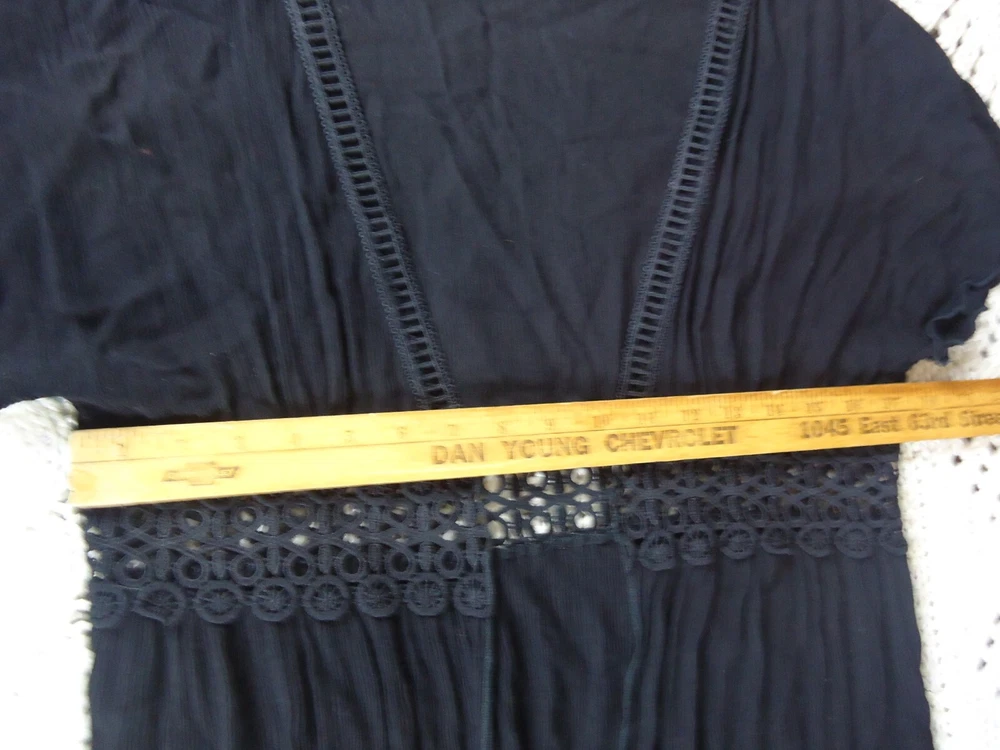 Anthropologie Wrap Dress By Lavender Field Women's Size L Black Gauzy flowy fabric with a lacy detailed waistline. This is preowned and in used condition and as such may show some minor signs of wear but it is in great condition overall. The tag that tells the material type and the washing instructions has been removed. Please see all pictures for measurements and condition. C4
