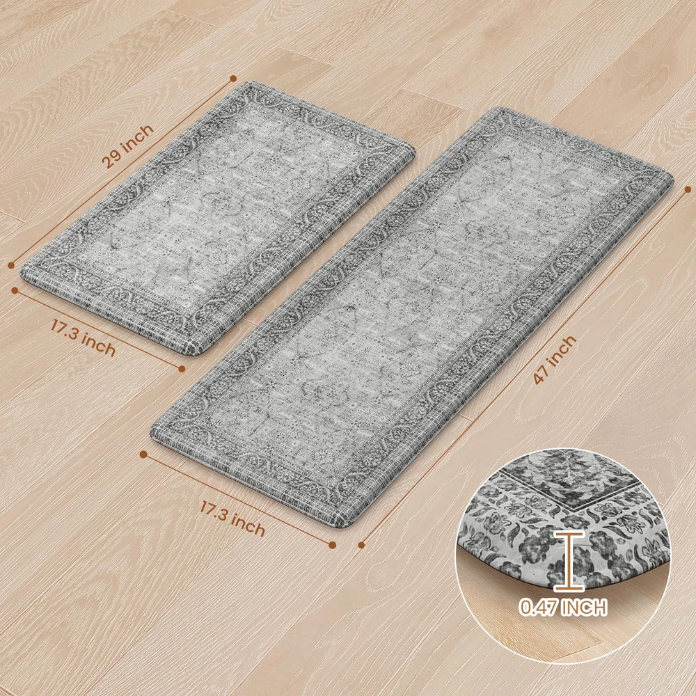 Comfort Anti-fatigue Kitchen Mats: 0.47inch (12mm) extra thick anti fatigue kitchen floor mat are sure to provide cushion on your feet, knees, lower back, and joints for standing.Feel comfortable like walking on a firm but soft cloud when you are cooking in kitchen or working at your standing desk Kitchen Rugs Set 2PC: The set contains 2 rectangular kitchen mats measure 17.3"x 47"+17.3"x 29".The comfort standing mat are made of high-quality and premium PVC materials,to ensure that the mats will keep their shape, even with extended and long-term heavy duty use Anti-Slip & Safty: The super non-slip heavy duty natural rubber backing help farmhouse kitchen rugs to keep sturdy and prevent shifting or slipping,provide safety for your family,especially pregnant women,elderly and kids.The kitchen floor mat may be used on multiple surfaces.NOTE:Rug should be placed on dry surface during use Easy Clean & Waterproof: The cushioned kitchen carpets is stain resistant,waterproof and easily cleaned.Simply wipe the floor mat with a damp cloth or sponge or use a hand-held vacuum as needed,save your time and energy Versatile: Vintage farmhouse style kitchen rug,easily to match your kitchen decor,bright your home.Soft thick foam provides ample support for standing in kitchen sink,laundry room, office,bathroom,dinning room,or any other high-traffic area