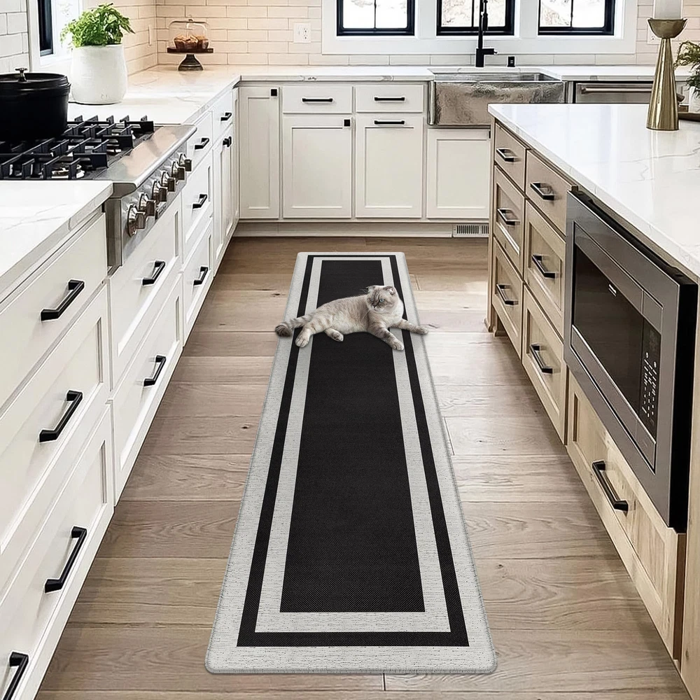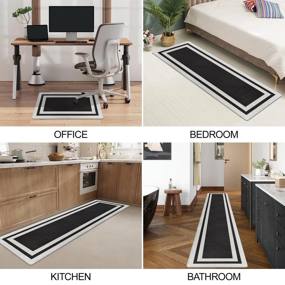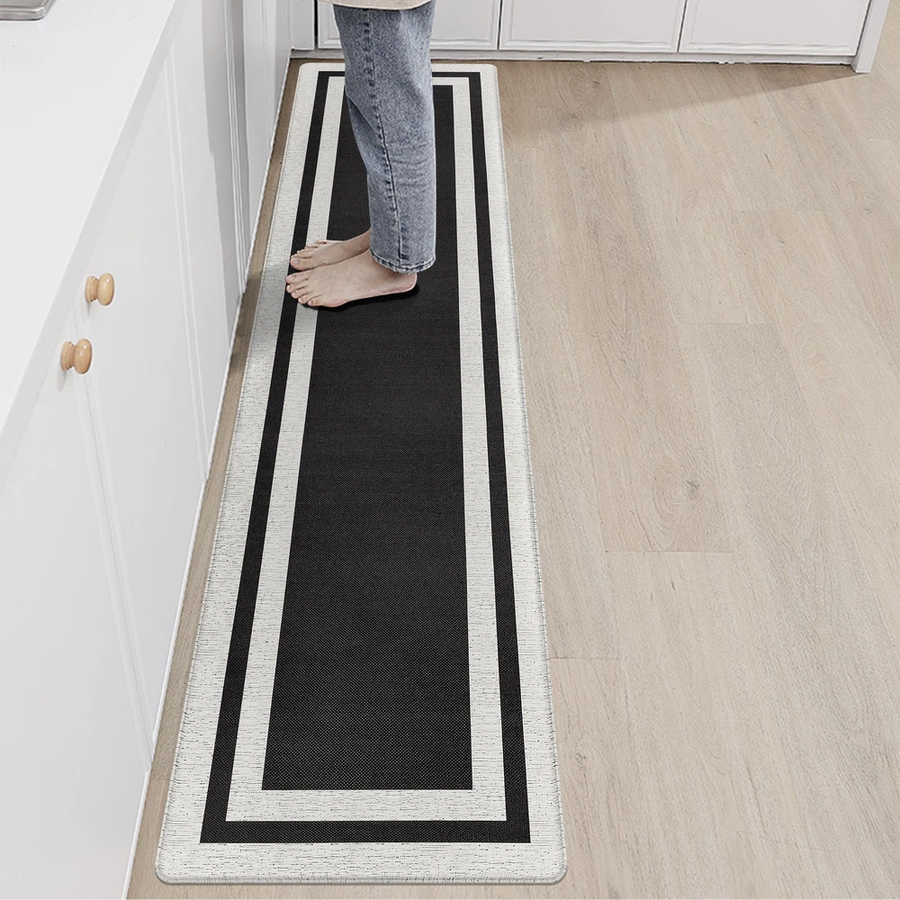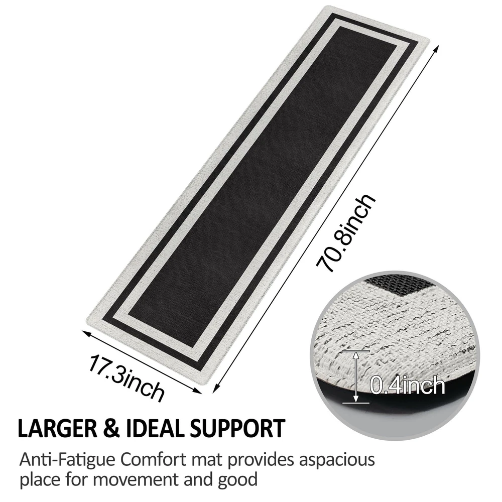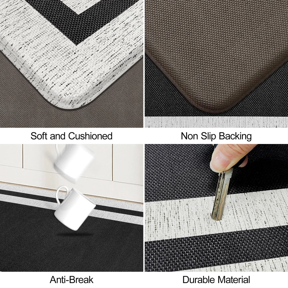 ANTI-FATIGUE MAT: 0.4 inch (10mm) anti-fatigue kitchen floor mat is ergonomically designed to relieve pressure on feet and legs. Memory foam kitchen mat can improve circulation and standing posture while you work at kitchen or office. QUALITY MATERIAL: Kitchen mat is made of high quality PVC material, which is environmentally friendly for your family. Rubber kitchen mats for floor has a slow-rebound feature to protect your dropping dishes from breaking. EASY TO CLEAN: Non-slip kitchen mats are easy to clean. the PVC material is waterproof, oil and stain resistant. Simply wipe away the dirt with a damp cloth or handheld vacuum as needed and the cushion kitchen mats for floor will maintain its new look. WIDE VARIETY OF USES: The classic simple geometric pattern black kitchen rug can easily match your kitchen decor and brighten up your home. The kitchen mat provides large surface area for laundry, kitchen, office, living room, in front of the sink. SAFETY: The kitchen mats have a waterproof PVC surface, which helps to keep the carpet sturdy and prevents it from moving. Open anti fatigue kitchen mat fully and place on even and flat floor, the kitchen runner will be back to normal in a few days.